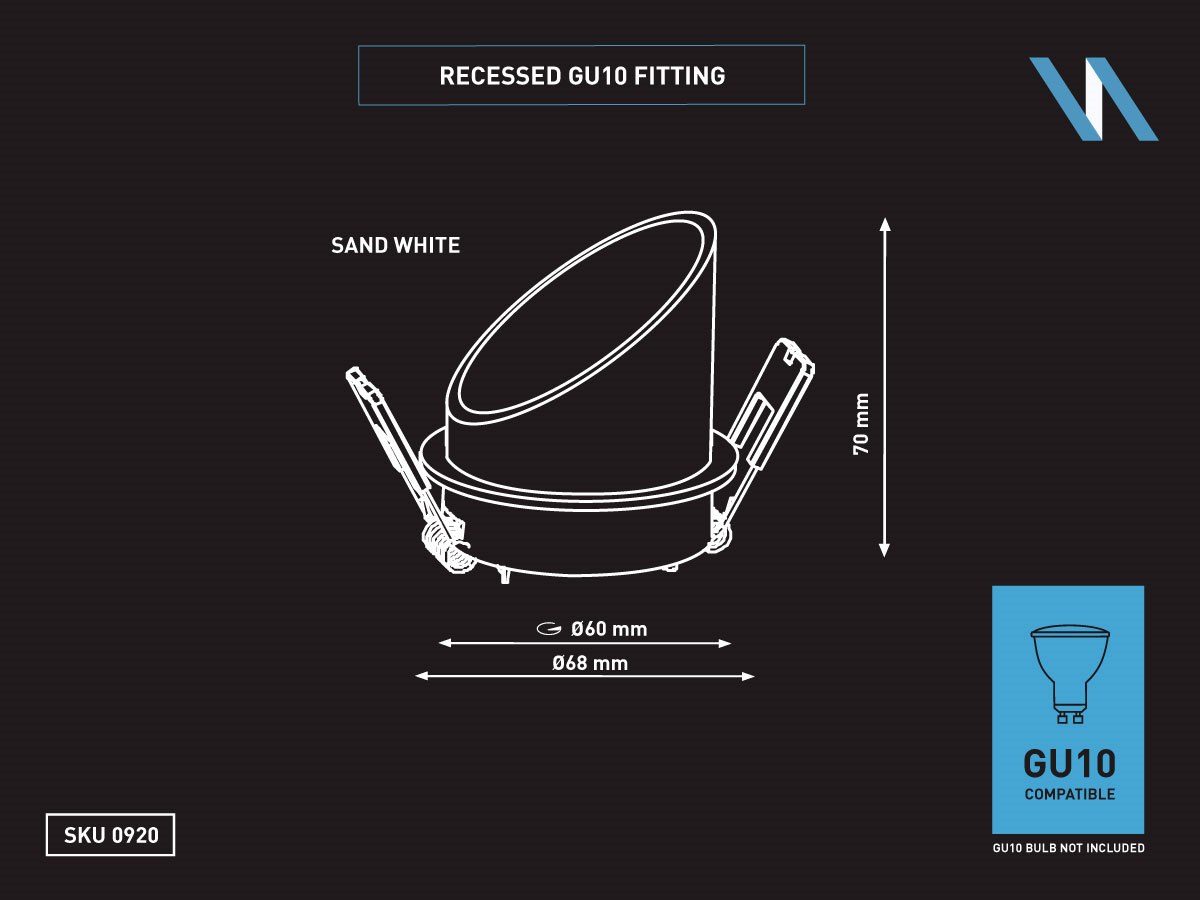 - afdichting IP20 - product kleur zand wit - afm. Ø 68 x 70mm - inbouwdiameter ø 60mm - materiaal aluminium - fitting GU10 - inclusief keramiek lamphouder - lichtbron bulb niet inclusief - geschikt voor binnen - een bulb invoer - voltage 220-240V - SKU 00920 SKU353