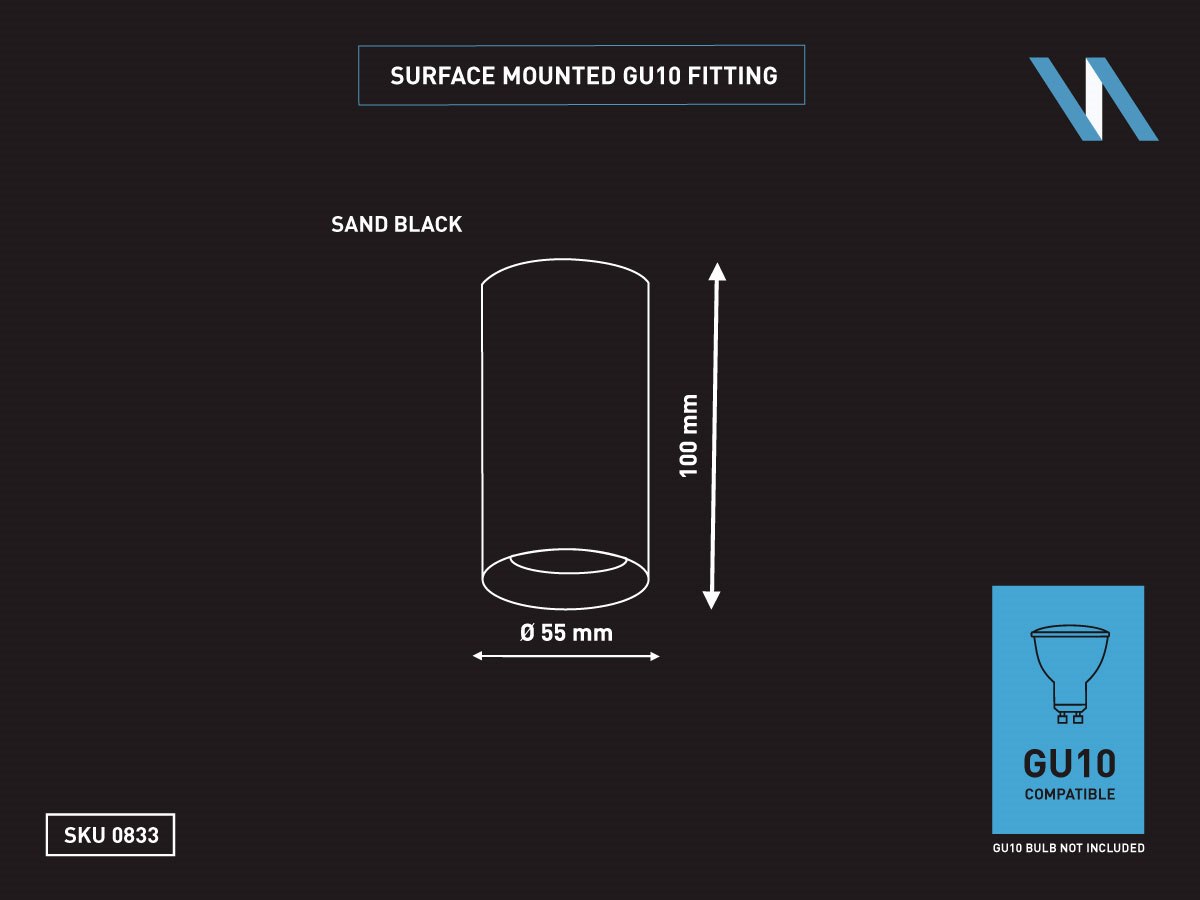 - afdichting IP20 - product kleur zand zwart - afm. Ø 55 x 100mm - bevestiging inclusief - materiaal aluminium - fitting GU10 - bulb niet inbegrepen - geschikt voor binnen - een bulb invoer - voltage 220-240V - SKU 00833