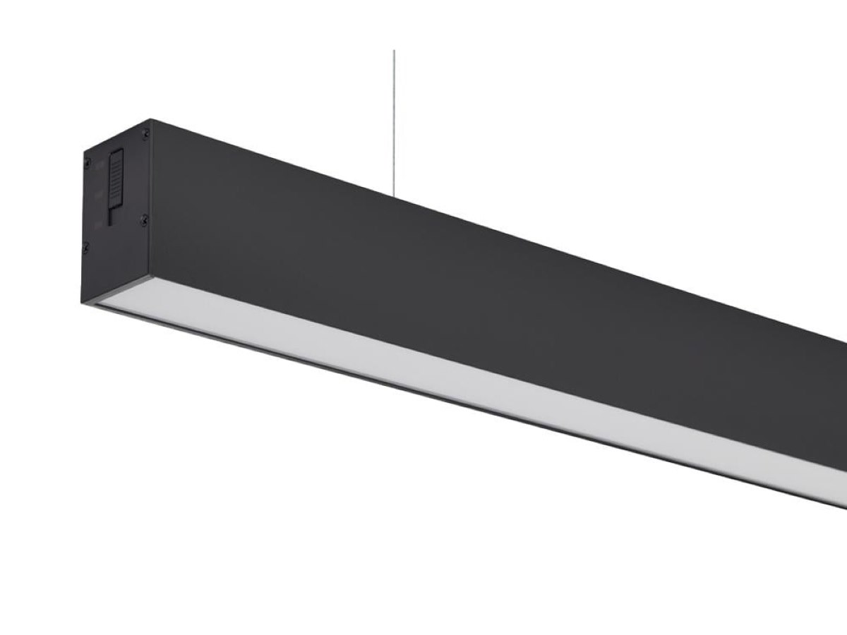 4 x 40W LED 120cm Linear Design Hanglamp met 3 kleur licht switch zwart - lichtstroom 4200 lumen - lichtkleur schakelbaar tussen warm wit 3000K neutraal wit 4000K daglicht 6500K - geschikt voor binnen - afdichting IP20 - product kleur wit - afm. 1200 x 75 x 50 mm - materiaal aluminium en PC - stralingshoek 120° - door de meegeleverde ijzerdraden is de lamp in hoogte verstelbaar - levensduur 70.000 uren - voltage 170-265V (50/60Hz) - HRZ200