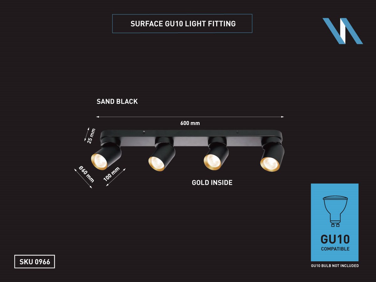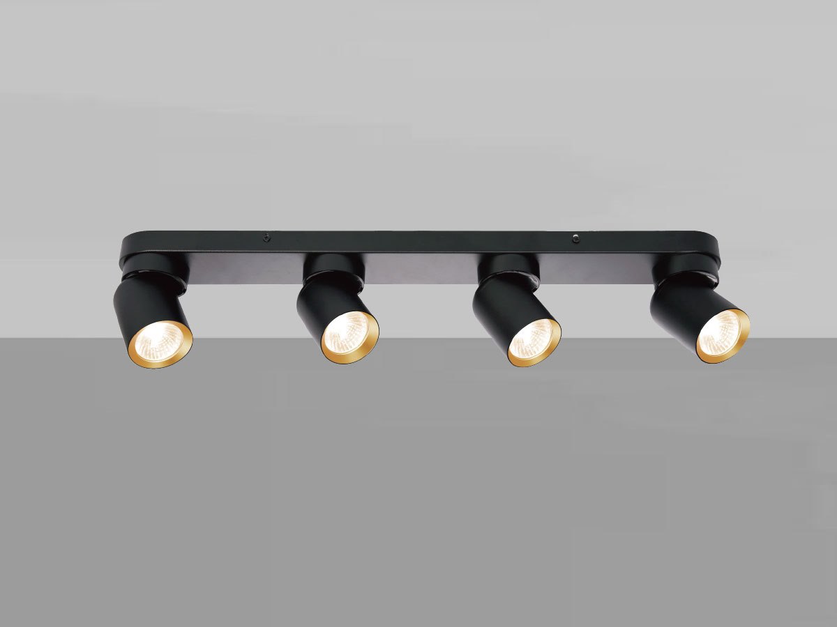 - afdichting IP20 - product kleur zand zwart en goud ring - afm. Ø 60 x 100mm - afm wandhouder 600 x 60 x 25mm - draaibaar 350° en kantelbaar 50° - materiaal aluminum en ijzer - bevestiging inclusief - fitting GU10 - bulb niet inbegrepen - geschikt voor binnen - 4 x bulb invoer - voltage 220-240V - max 40 watt - SKU 00966
