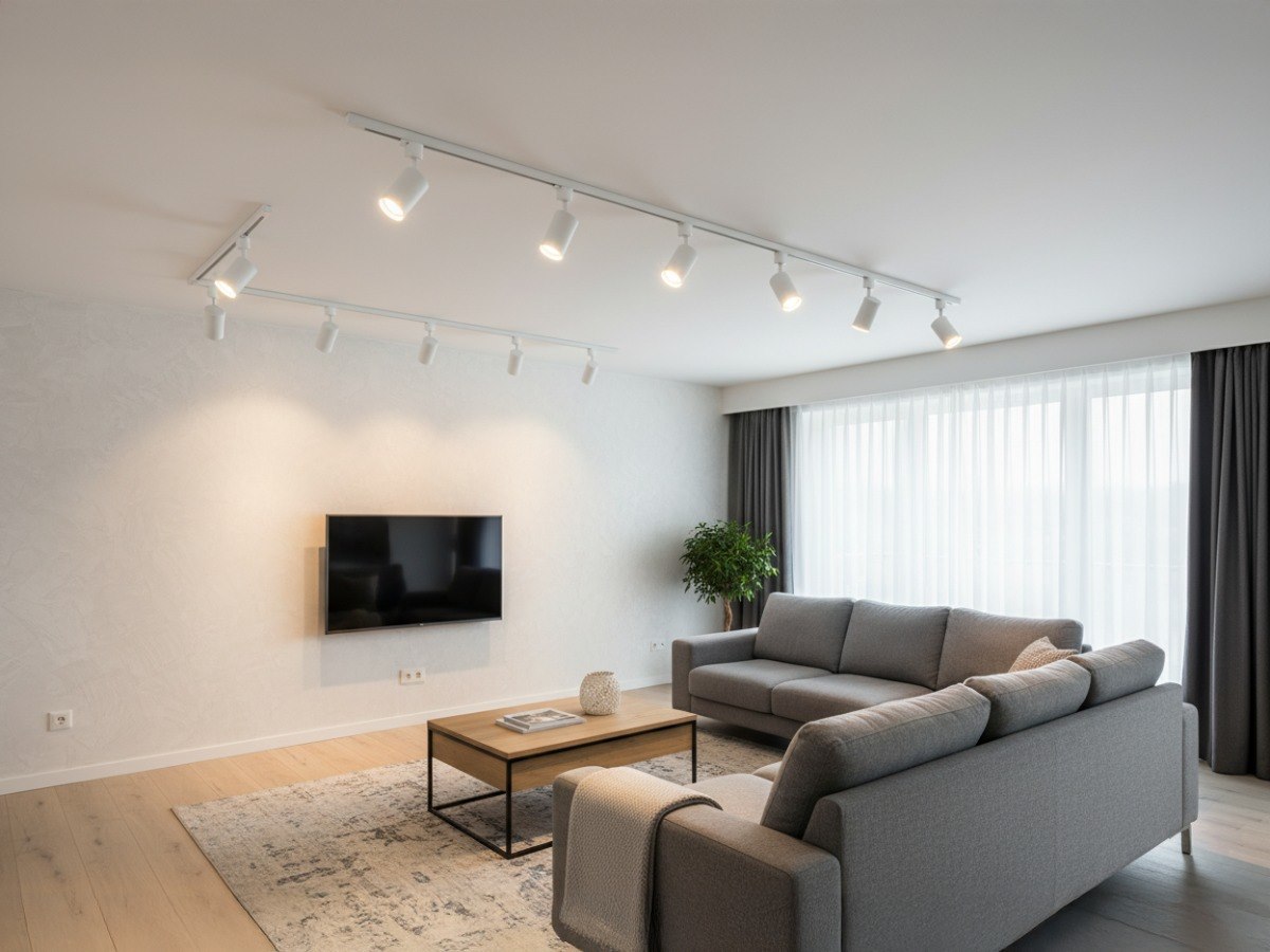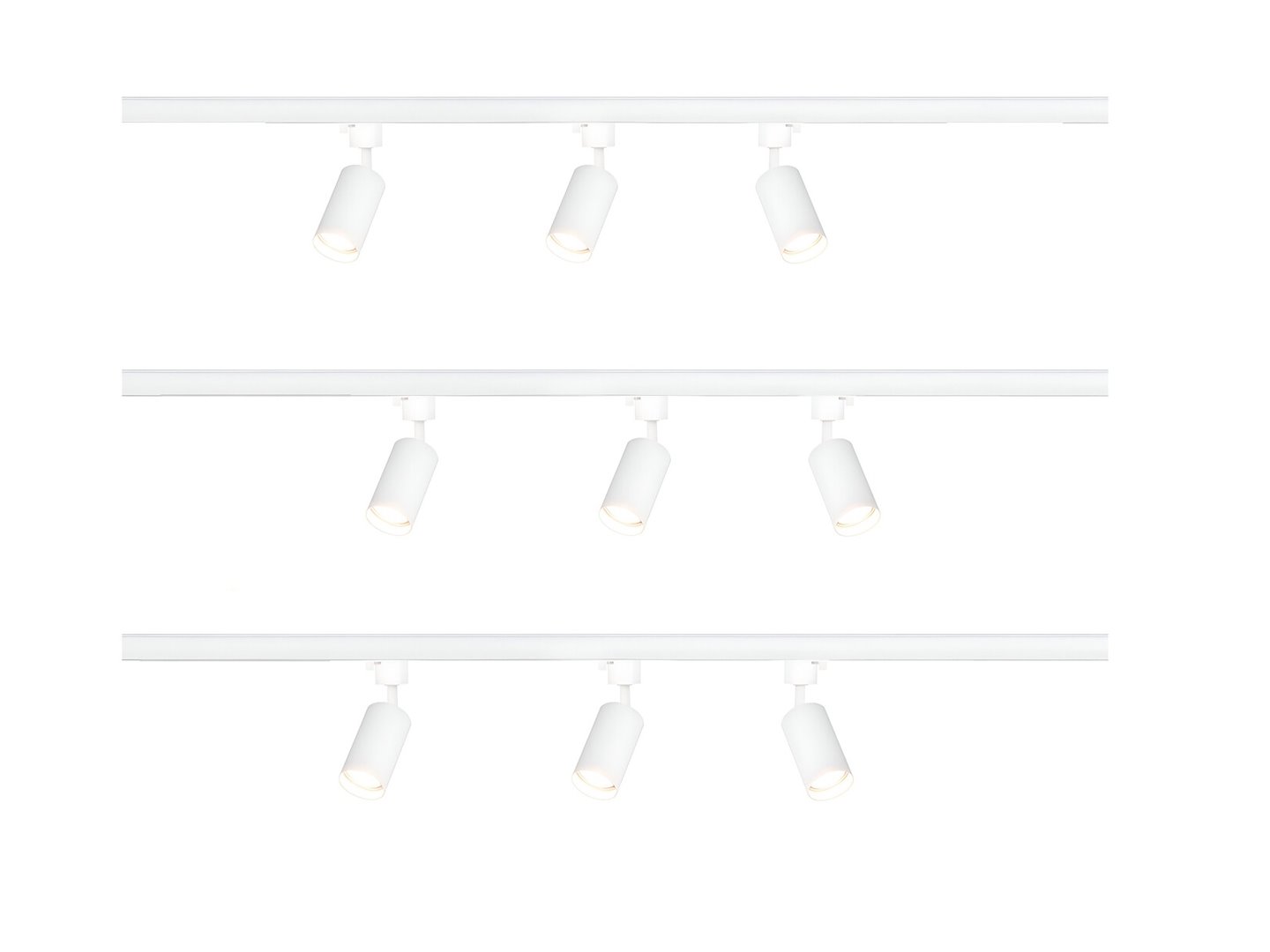4 x 1 stuk 100cm en 1 stuk 200cm rail - materiaal aluminium - bevestiging inclusief - 220-240V - afdichting IP20 - 1 stuk door verbinder en 1 stuk L verbinding inclusief - product kleur zand wit- 9 stuk railspots GU10 armatuur afm. Ø 55 x 102mm draaibaar 350° en kantelbaar 90° materiaal aluminum kop en kunstof basis - bulb niet inbegrepen - de rail kan eenvoudig op de gewenste lengte worden gezaagd - geschikt voor binnen - SKU 828 SKU 826 SKU 906 SKU 908 SKU 1122