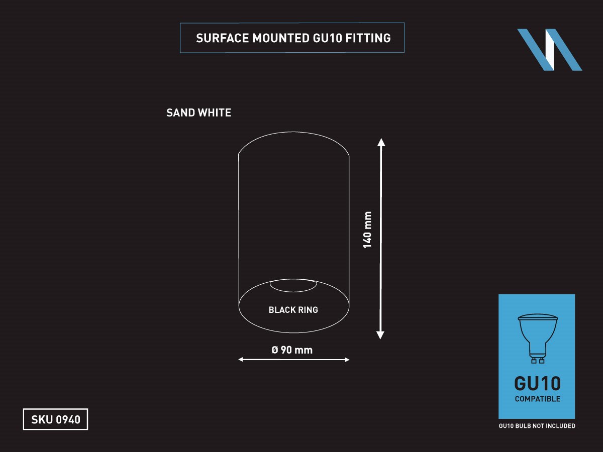 - afdichting IP20 - product kleur zand wit zwart - afm. Ø 90 x 140mm -bevestiging inclusief - materiaal aluminium - fitting GU10 - bulb niet inbegrepen - geschikt voor binnen - een bulb invoer - voltage 220-240V - SKU 0940