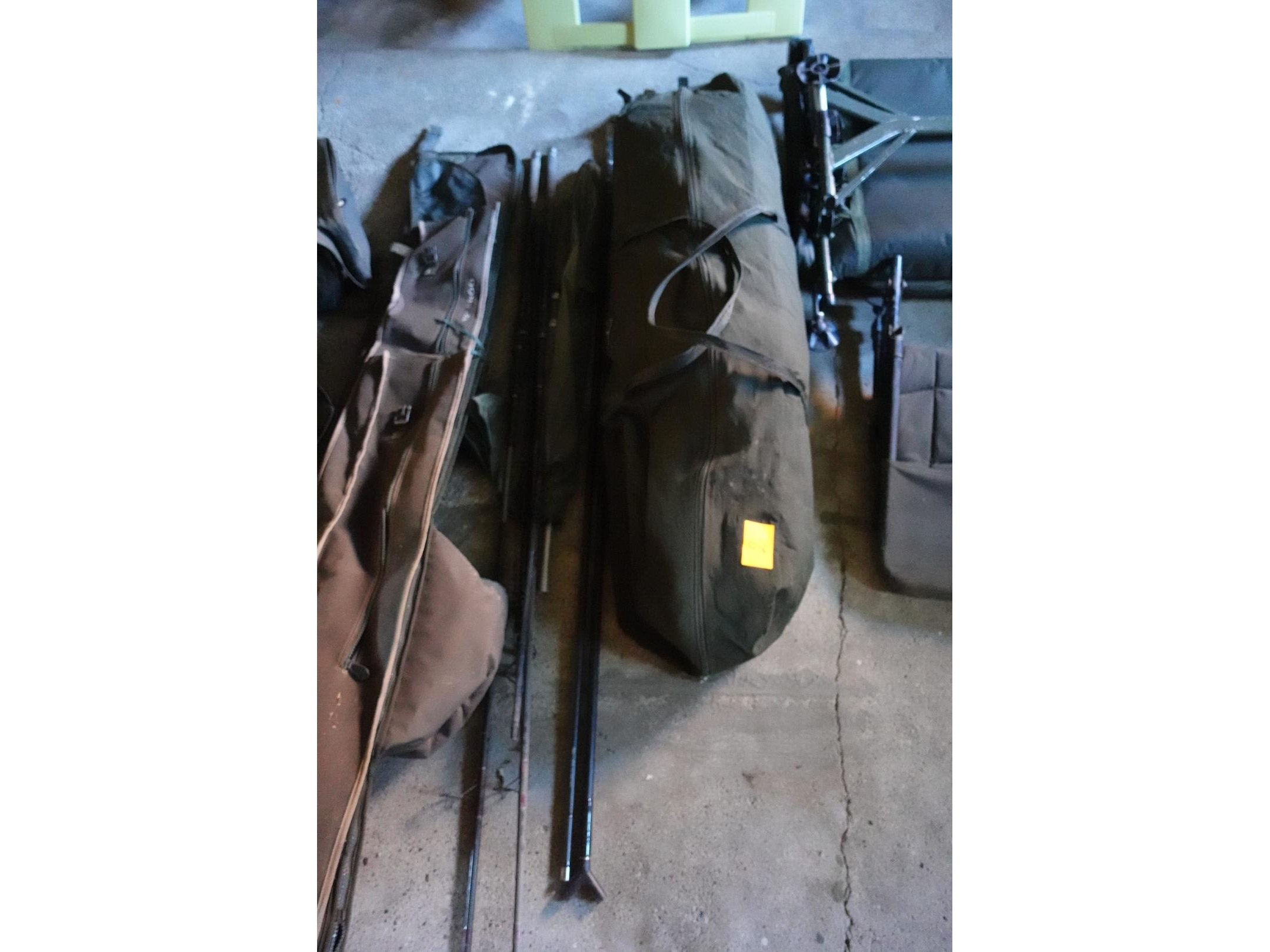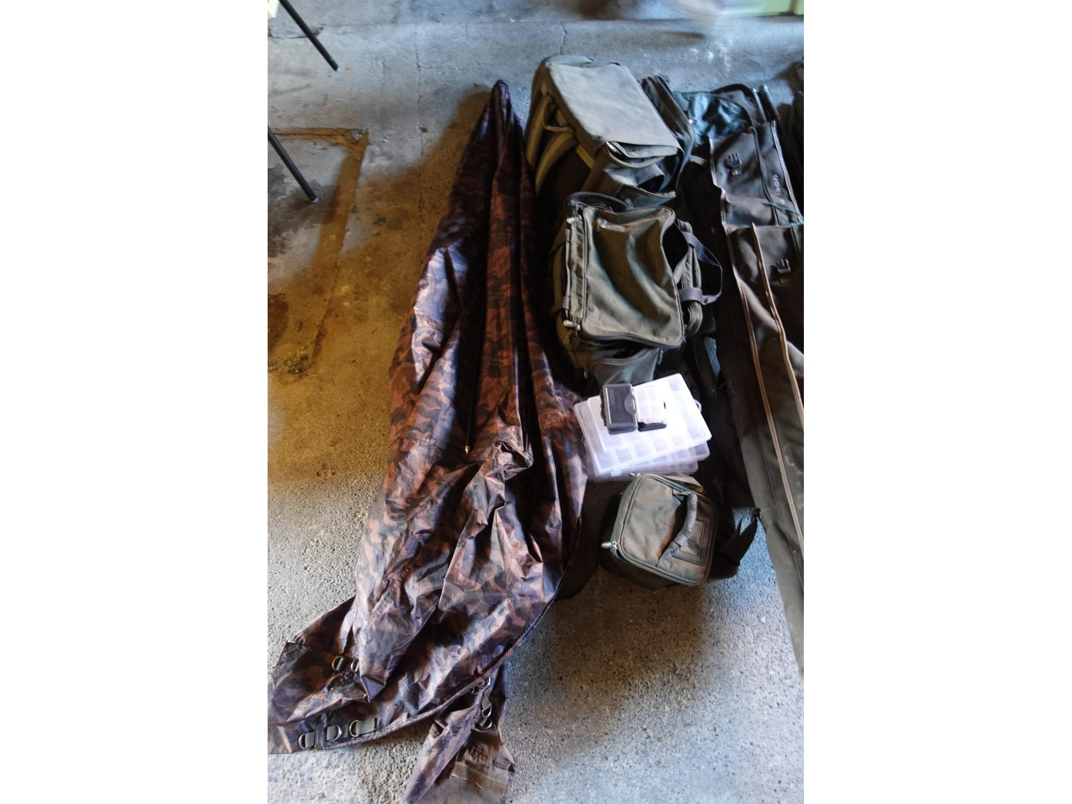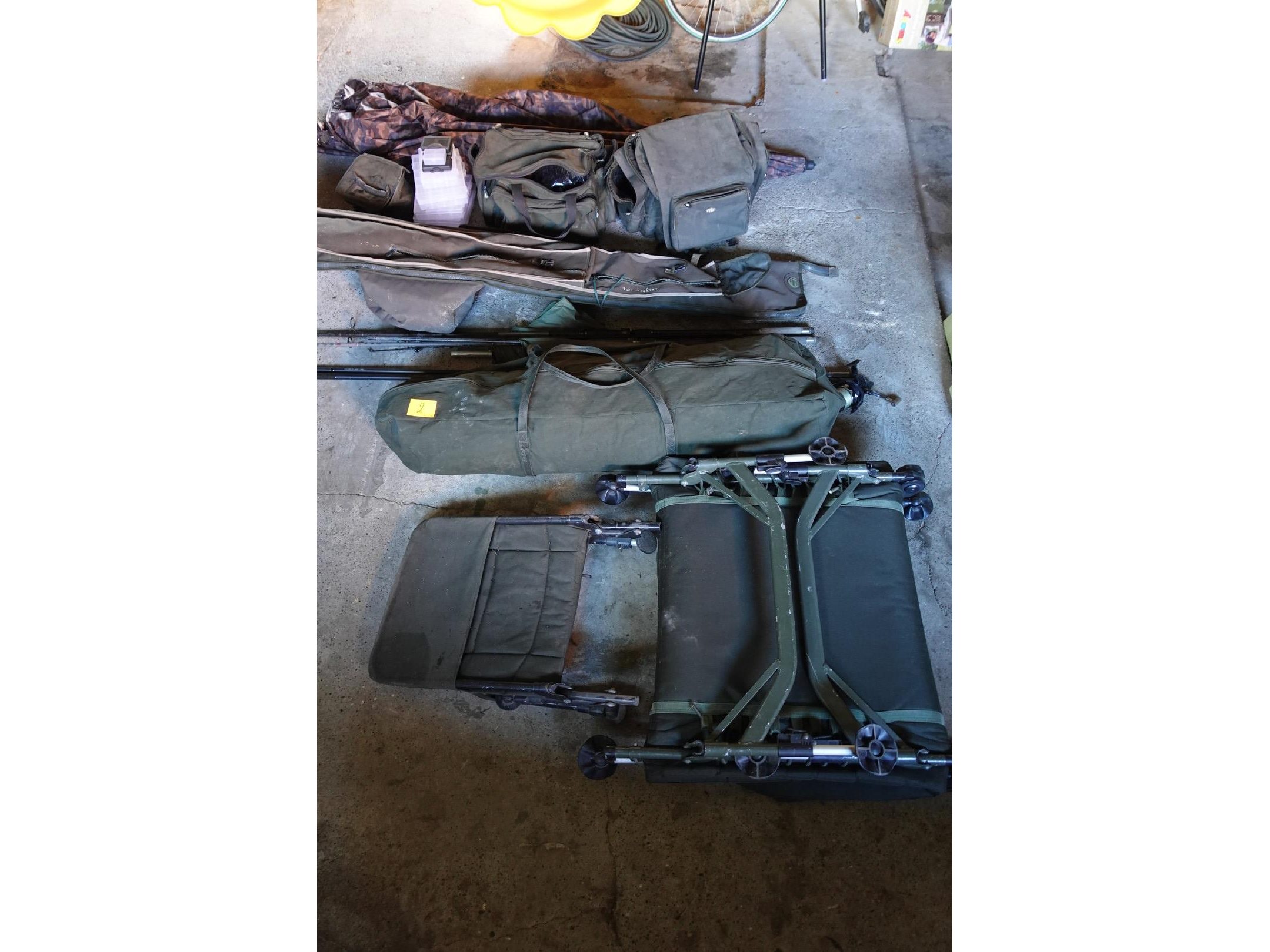 Oa. ligbed, stoel, tent, molens, beetmelders met ontvanger, hengels al dan niet compleet, diversen, ...