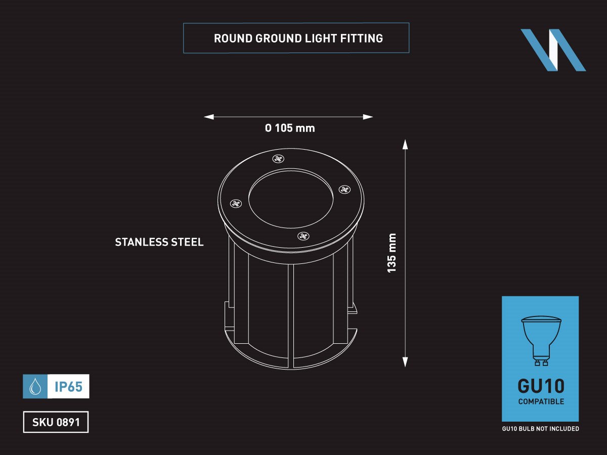 - IP65 waterdicht - materiaal roestvrij staal RVS en glas - afm Ø 105mm x 135mm - voltage 220-240V - GU10 spot niet inclusief - bevestiging niet inclusief - geschikt voor binnen en buiten - SKU 00891