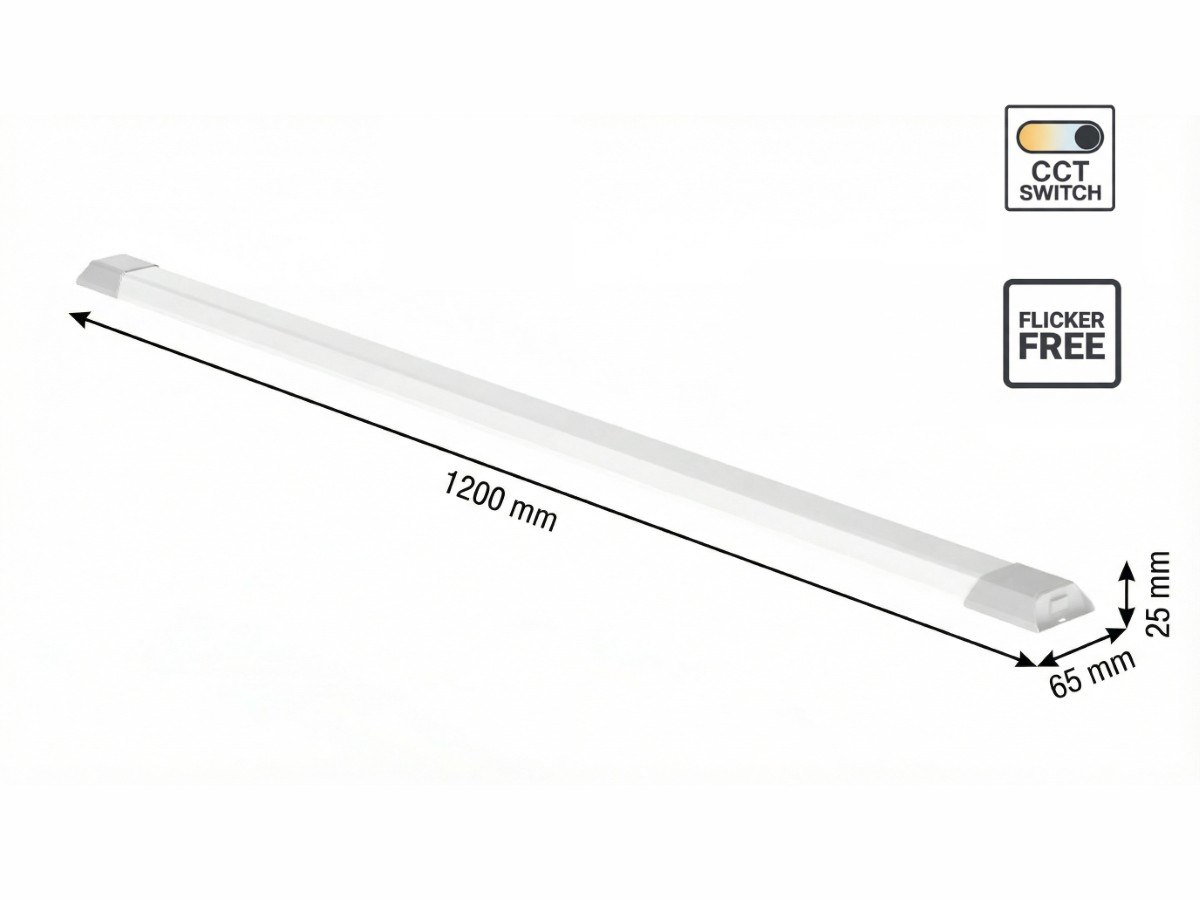 20 x 40 watt 3 kleur CCT LED Batten licht - lichtstroom 4800 lumen - lichtkleur 3 in 1 CCT switch warm wit neutraal wit en daglicht dat de kleurtemperatuur kan geschakeld worden tussen 3000K 4000K 6500K – afdichting IP20 - product kleur wit - flicker free – stralingshoek 110° - afm. 1200 x 65 x 25 mm - materiaal PC - bevestigingsset inclusief - levensduur 25.000 uren - voltage 165-265V - garage licht, magazijn licht kantoor licht - sku 1179