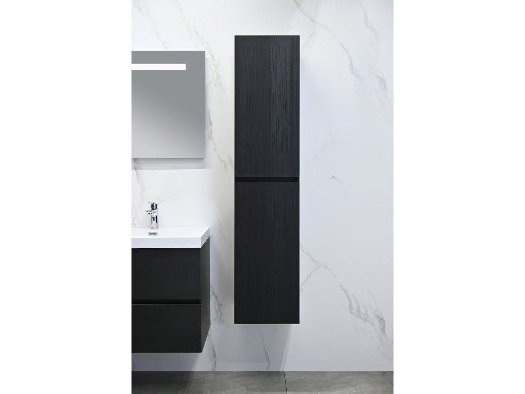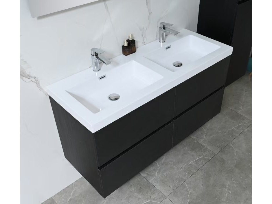Aantal: 1<br /> Merk: Vonato<br /> Productnaam: Badkamermeubel 2 persoons<br /> Type: 9015<br /> Model: 3-delig met dubbele wasbak<br /> Kleur: Donker hout decor zwart, witte wastafel<br /> Materiaal: Melamine, kunstmarmeren wastafel<br /> Afmeting: 3-delige set:<br /> 1 * Wastafelmeubel - 1200x450x600mm<br /> 1 * Zijkast - 1500x350x350mm<br /> 1 * Spiegel- 1200x600mm<br /> <br /> Voorzien van: Kranen inclusief pop-up afvoer – 4 stevige metalen lades - Softclose lade systeem - LED spiegel met anti-fog systeem - Voorgemonteerde zijkast en wastafelmeubel.<br /> <br /> Conditie: Nieuw