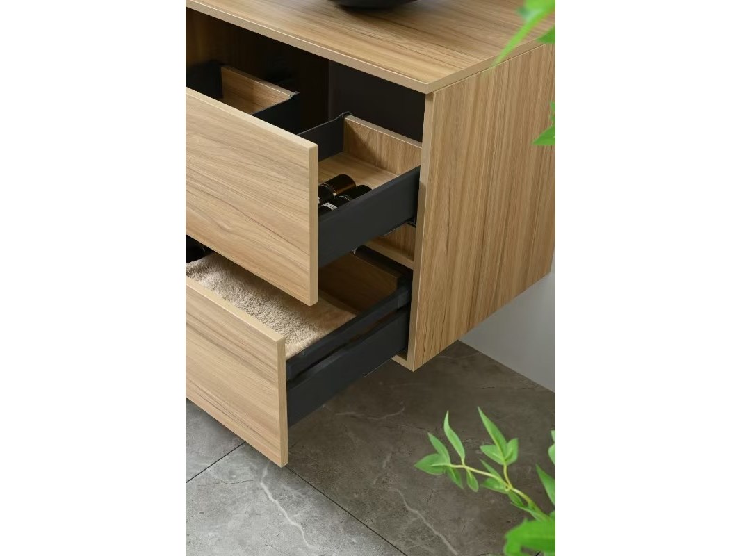 Aantal: 1<br /> Merk: Vonato<br /> Productnaam: Badkamermeubel 2 persoons<br /> Type: 9012<br /> Model: 3-delig met waskommen<br /> Kleur: Licht hout decor, zwarte kommen<br /> Materiaal: Melamine, stenen waskommen<br /> Afmeting: 3-delige set:<br /> 1 * Wastafelmeubel - 1300x470x550mm<br /> 1 * Zijkast - 1500x350x350mm<br /> 1 * Spiegel- 1300x600mm<br /> <br /> Voorzien van: Muurkranen inclusief pop-up afvoer – 4 stevige metalen lades - Softclose lade systeem – Stenen waskommen - LED spiegel met anti-fog systeem - Voorgemonteerde zijkast en wastafelmeubel.<br /> <br /> Conditie: Nieuw