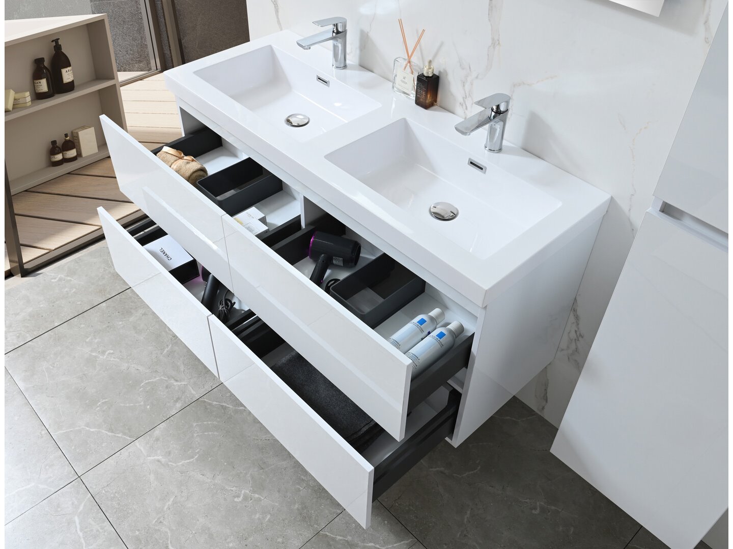 Aantal: 1<br /> Merk: Vonato<br /> Productnaam: Badkamermeubel 2 persoons<br /> Type: 9015W<br /> Model: 3-delig met dubbele wasbak<br /> Kleur: Hoogglans wit, witte wastafel<br /> Materiaal: Melamine, kunstmarmeren wastafel<br /> Afmeting: 3-delige set:<br /> 1 * Wastafelmeubel - 1200x450x600mm<br /> 1 * Zijkast - 1500x350x350mm<br /> 1 * Spiegel- 1200x600mm<br /> <br /> Voorzien van: Kranen inclusief pop-up afvoer – 4 stevige metalen lades - Softclose lade systeem - LED spiegel met anti-fog systeem - Voorgemonteerde zijkast en wastafelmeubel.<br /> <br /> Conditie: Nieuw