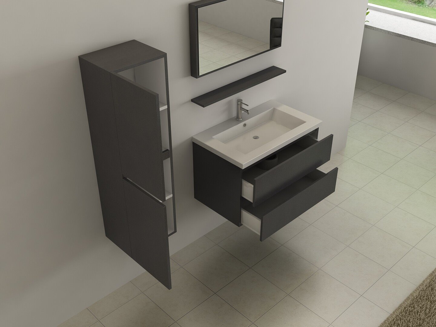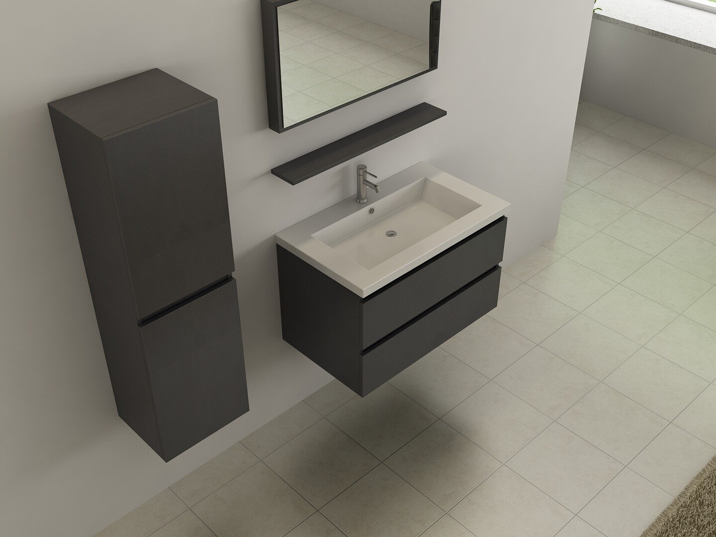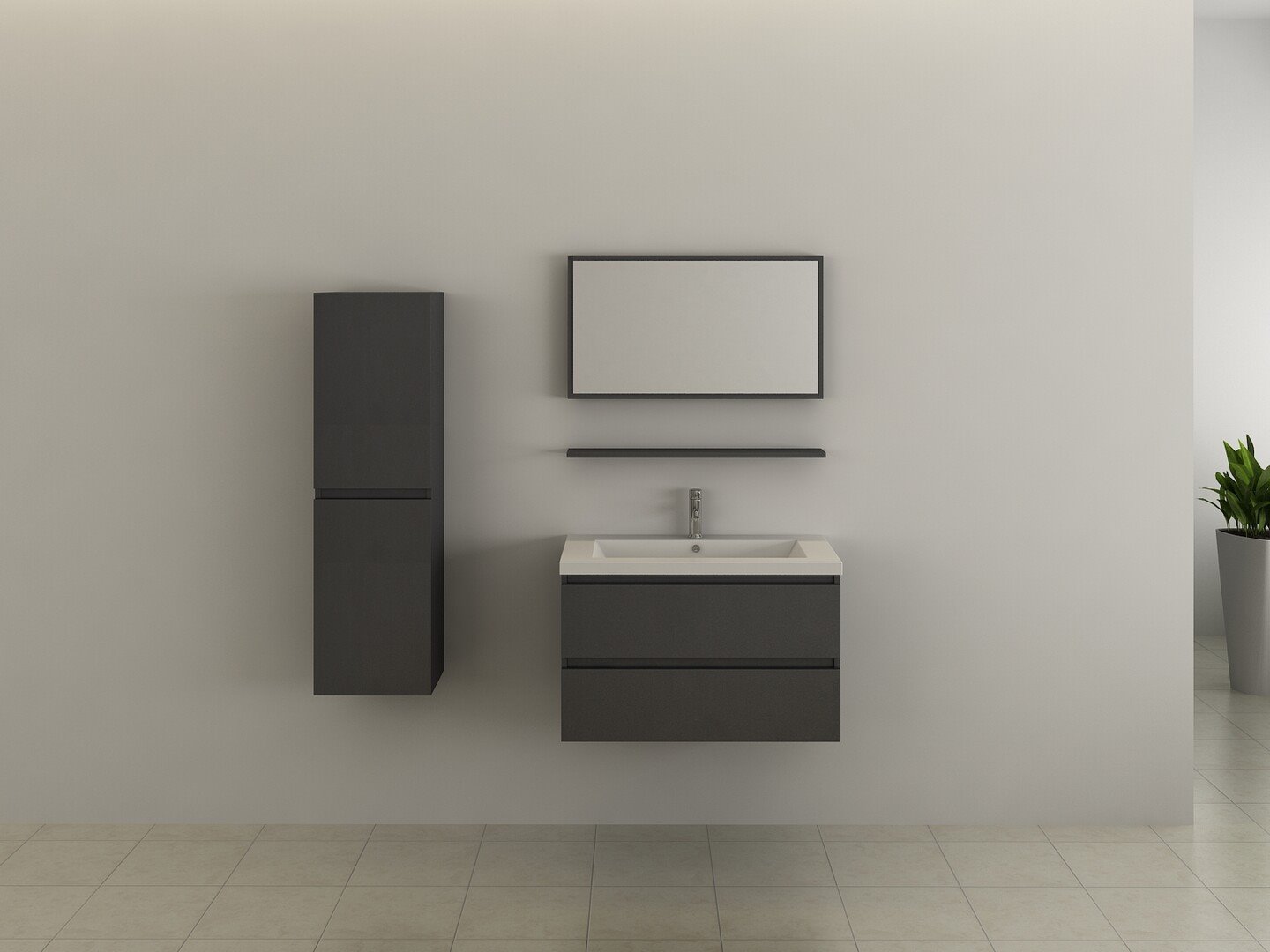 Aantal: 1<br /> Merk: Vonato<br /> Productnaam: Badkamermeubel<br /> Type: BL5165-H005<br /> Model: 1-persoons badkamermeubel 80 cm hoogglans grijs<br /> Kranen: Inclusief<br /> Afmeting: 4-delige set:<br /> 1 * Wastafelmeubel - 800x470x480mm<br /> 1 * Zijkast - 1500x350x350mm <br /> 1 * Spiegel - 800x60x450mm<br /> 1 * Planchet - 800x120x15mm<br /> <br /> Kleur: Donkergrijs<br /> Voorzien van: Kraan inclusief pop-up afvoer - Softclose lade systeem - Giethars wasbak - Voorgemonteerde zijkast en wastafelmeubel<br /> <br /> Conditie: Nieuw <br /> Ter waarde van: € 1.395,00