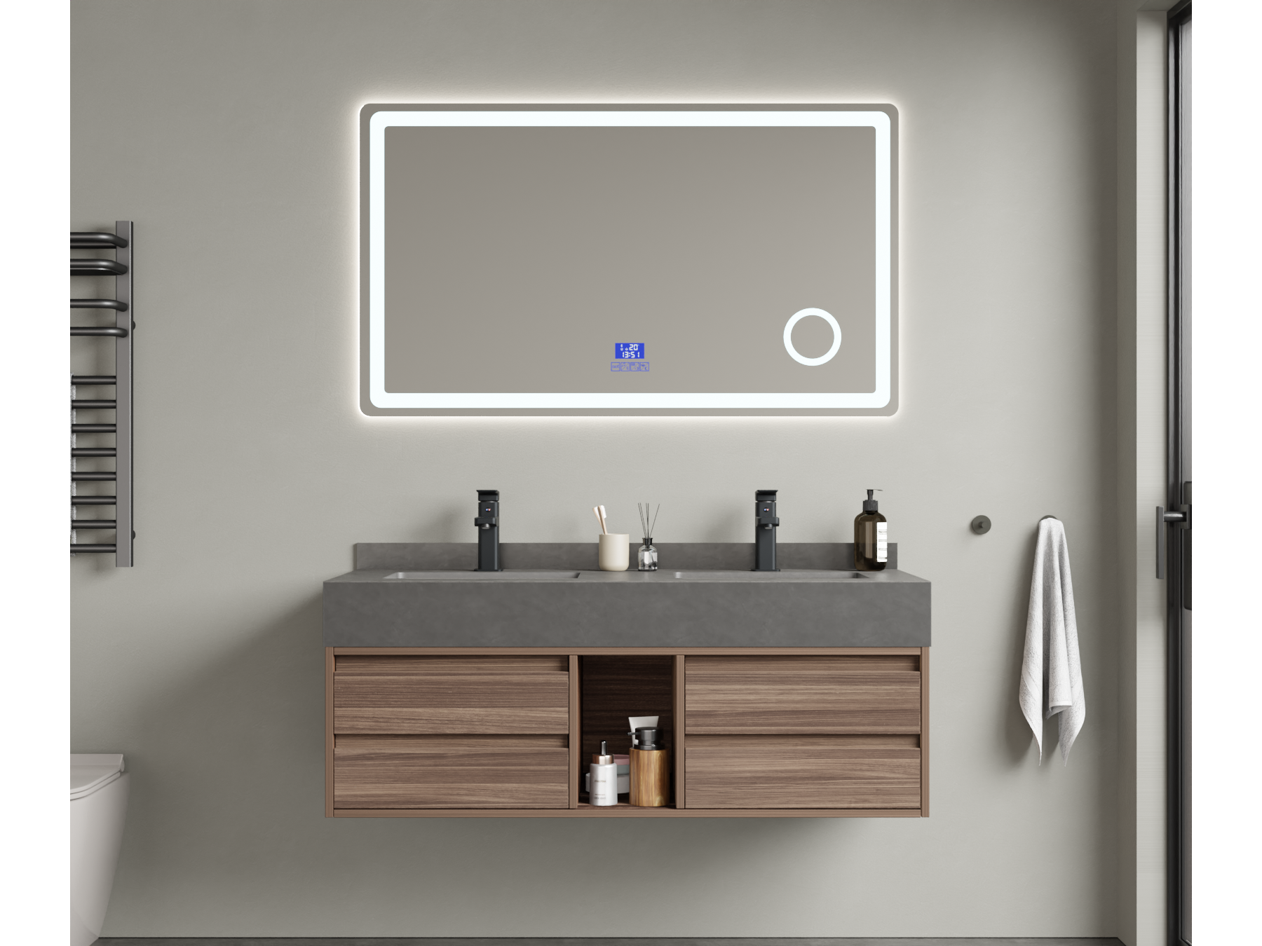 Aantal: 1<br /> Merk: Vonato<br /> Productnaam: Badkamermeubel<br /> Type: MBY-412-WM. <br /> Kranen: Inclusief mat zwarte opzetkranen<br /> Kleur: Hout / grijze wasbak / wit basin<br /> Materiaal: Melamine kasten, natuurstenen wasbak<br /> Afmeting: 2-persoons set: <br /> 1 * Wastafelmeubel - 1200x550x430mm, <br /> 1* Wastafel – 1200x555x150mm,<br /> 1 * Spiegel - ca. 1200x35x700mm.<br /> <br /> Voorzien van: Softclose lade systeem: 4 stevige metalen lades - Zwarte kranen inclusief pop-up drains (chrome) - Goudkleurige metalen handgrepen - Spiegel met: touchscreen LED-verlichting in 3 kleuren, dimbaar, digitale klok + thermometer, Bluetooth + speakers, anti-fog technologie, kopervrije spiegel - Voorgemonteerd wastafelmeubel.<br /> <br /> Conditie: Nieuw