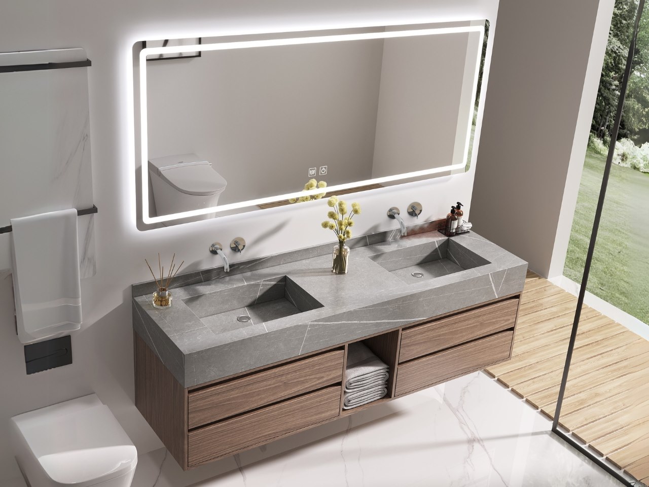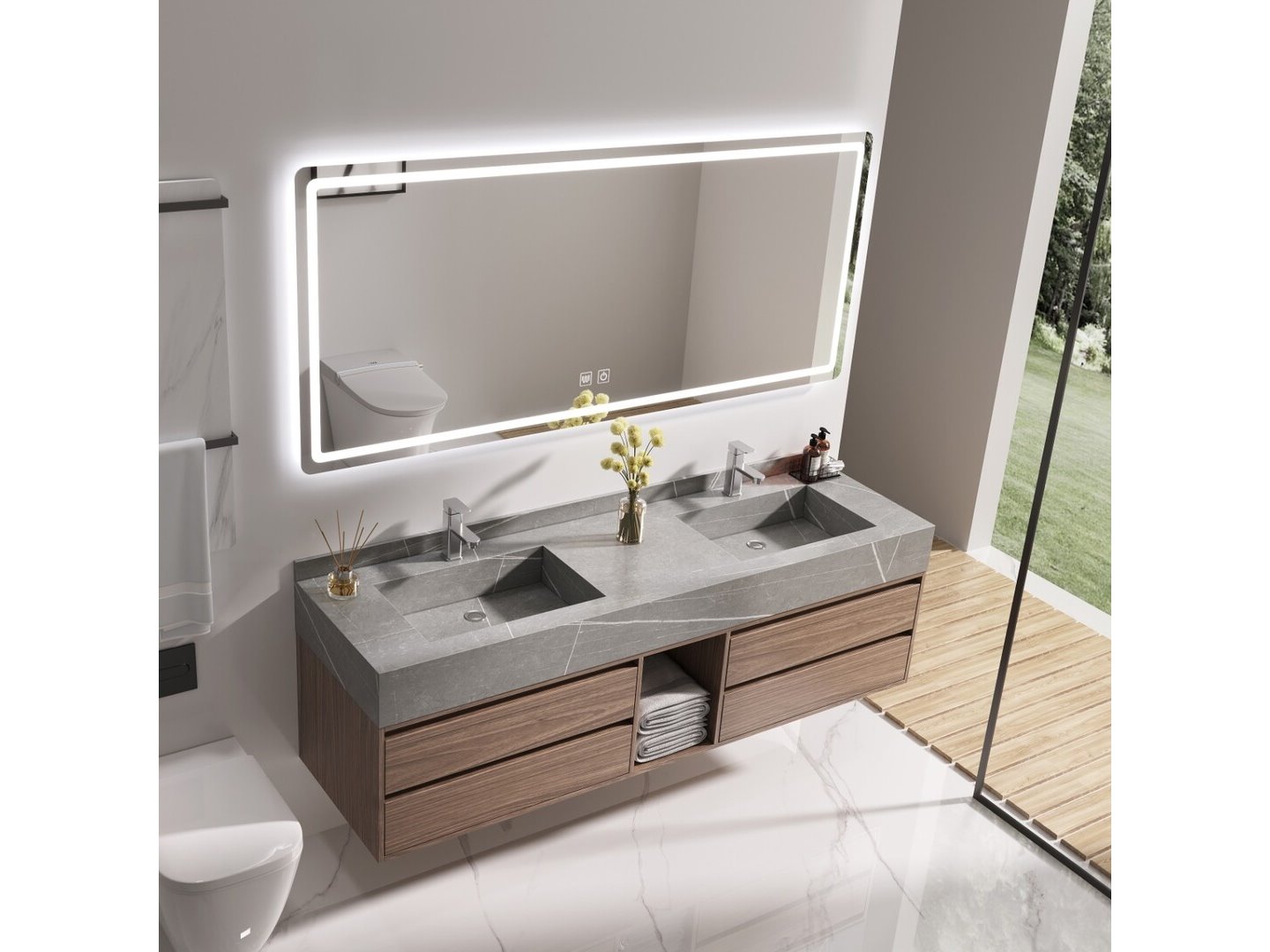 Aantal: 1<br /> Merk: Vonato<br /> Productnaam: Badkamermeubel<br /> Type: MBY-415<br /> Model: 2-persoons badkamermeubel 150 cm donker hout decor met marmeren wasbak<br /> Kranen: Inclusief 2 opzetkranen<br /> Materiaal: Meubel: Multiplex met melamine, Wasbak: Marmer<br /> Afmeting: 2-persoons set:<br /> 1 * Wastafelmeubel - 1500x550x550mm<br /> 1 * Spiegel - ca. 1500x700mm<br /> <br /> Kleur: Donker hout decor, grijze wasbak<br /> Voorzien van: Softclose lade systeem: 4 lades - Kranen inclusief pop-up afvoer - Spiegel met touchscreen LED-verlichting en anti-fog technologie - Voorgemonteerd wastafelmeubel.<br /> <br /> Conditie: Nieuw <br /> Ter waarde van: € 2.395,00