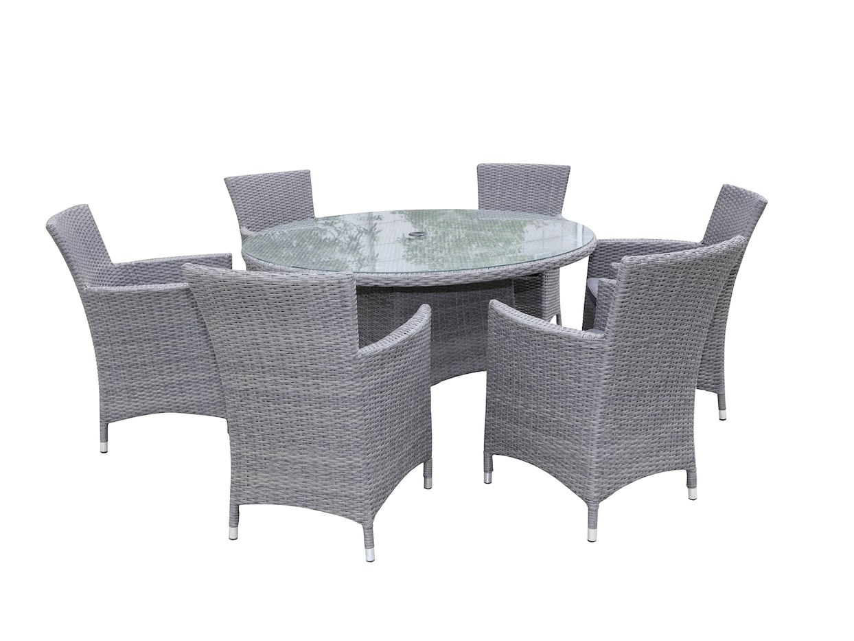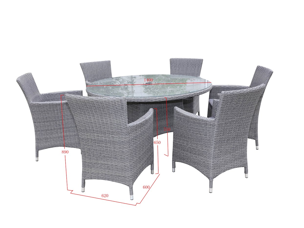 Aantal: 1<br /> Merk: Vonato<br /> Productnaam: Diningset<br /> Type: LEON-1603<br /> Model: 7-delig<br /> Frame: Aluminium frame<br /> Kleur: Grijs wicker met grijze kussens<br /> Afmeting: 7-delige set: 6 * stoelen, 1 * ronde tafel met glazen blad: ø 140cm x 75 cm hoog.<br /> Voorzien van: Waterafstotende kussens - weerbestendig vlechtwerk – Gepoedercoat aluminium frame – Glazen tafelblad - Gat in tafel voor parasol.<br /> <br /> Conditie: Nieuw