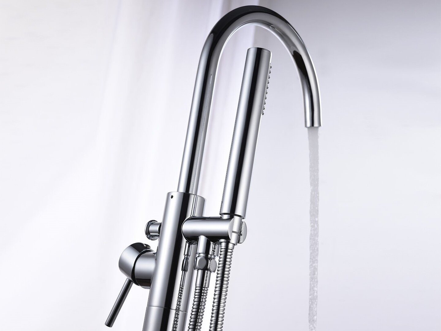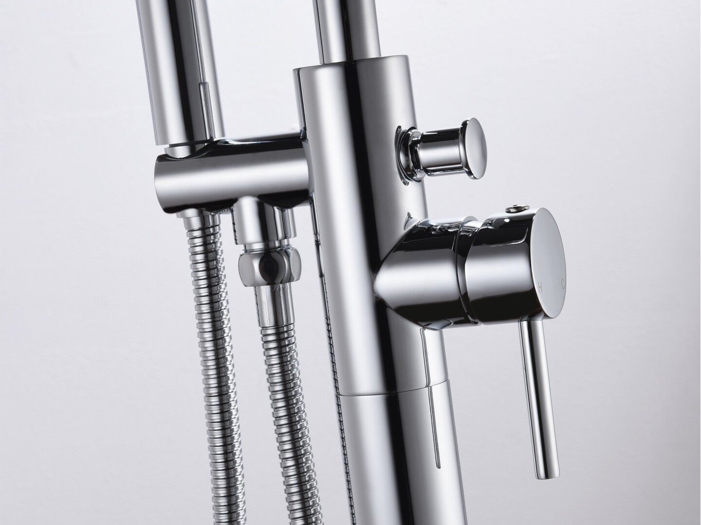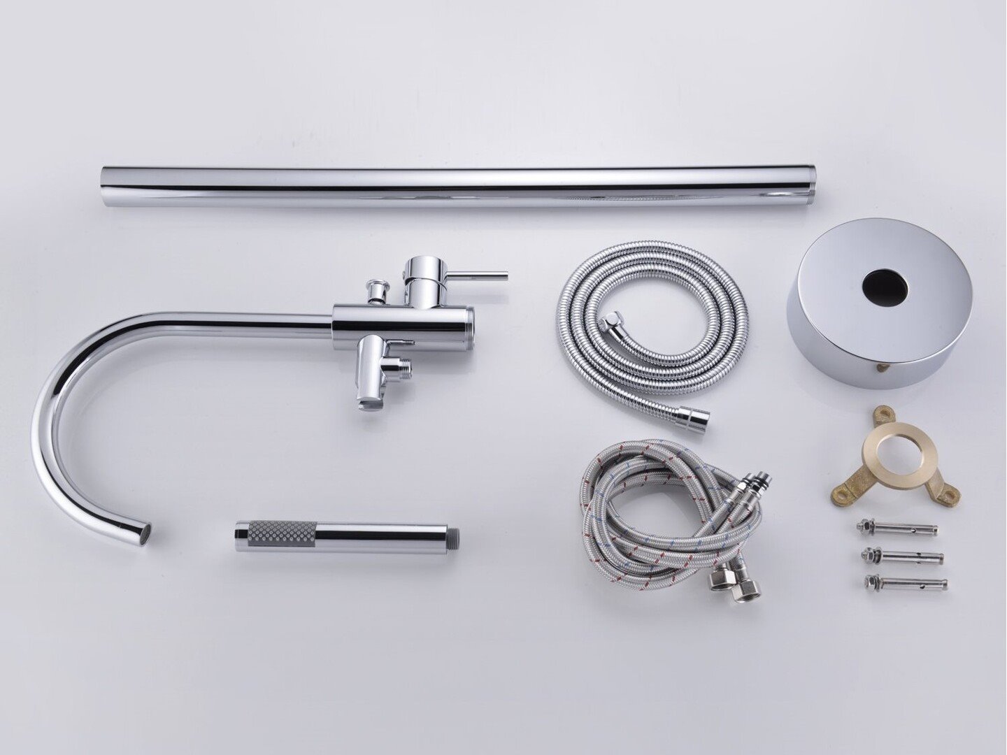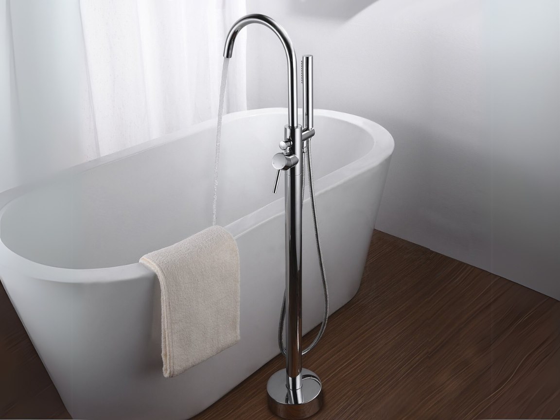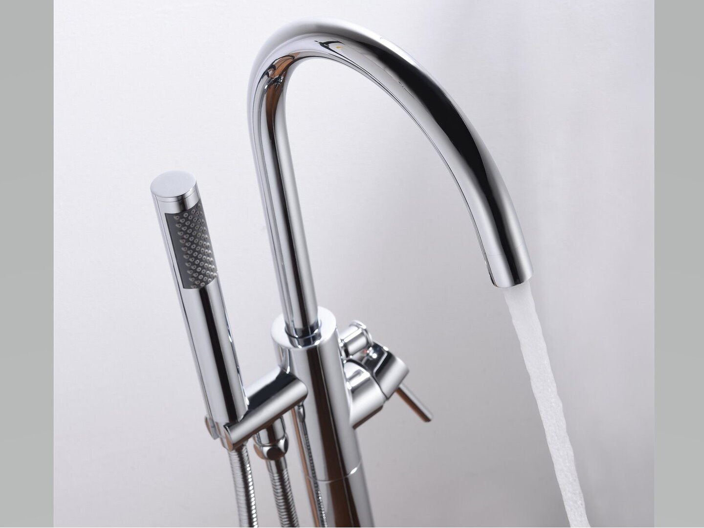 Aantal: 1<br /> Merk: Vonato<br /> Productnaam: Vrijstaande badkraan<br /> Type: FAUCET CHROME<br /> Model: Vrijstaand<br /> Kleur: Zilver (chroom)<br /> Afmetingen: De kraan is 111 cm hoog en de breedte is ca. 25 cm<br /> Voorzien van: Uitneembare handdouche - Buis, handdouche en beugel van messing - 360 graden draaibare uitloop. <br /> <br /> Conditie: Nieuw <br /> Ter waarde van: € 795,-