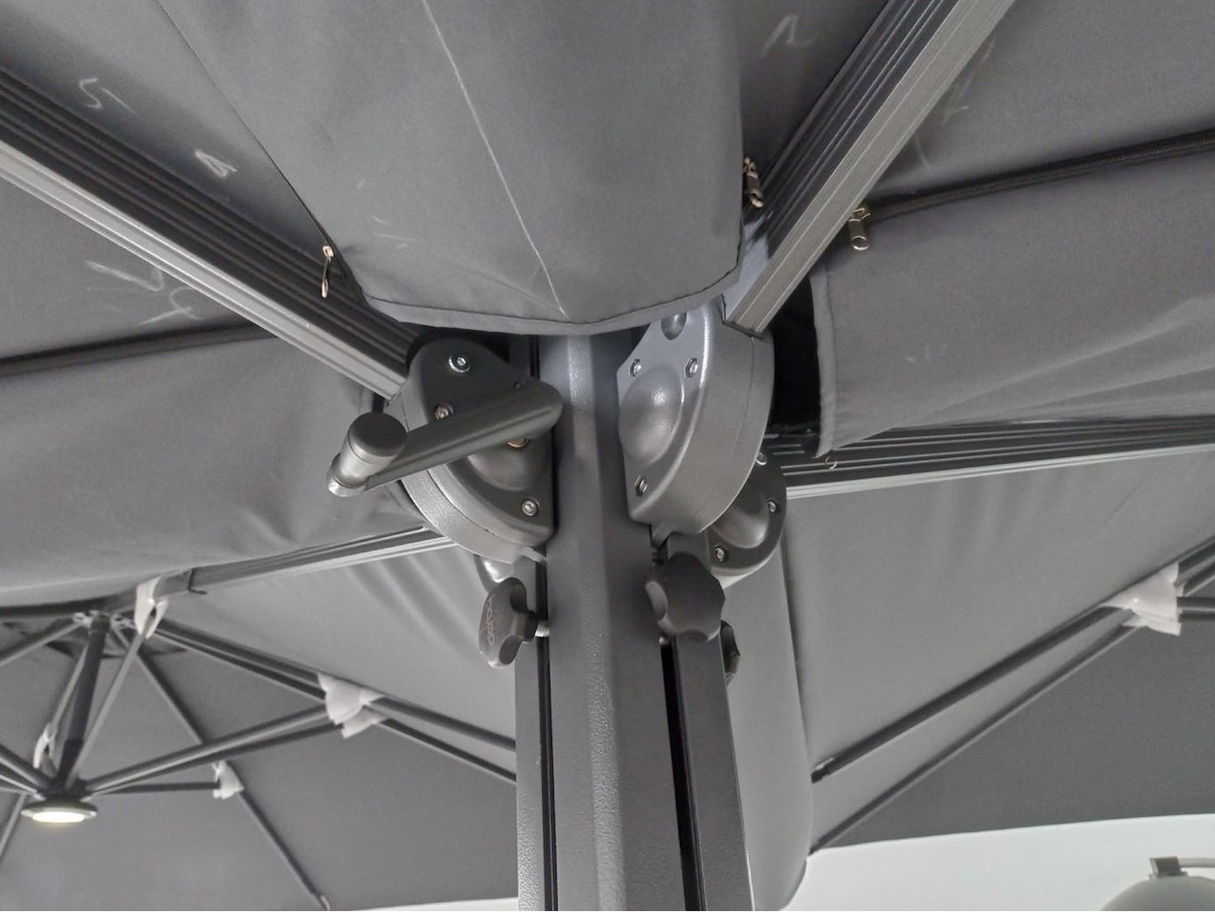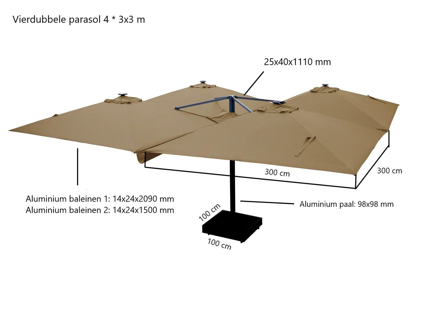 Aantal: 1<br /> Merk: Vonato<br /> Productnaam: Parasol<br /> Type: U1075 QUATRE 3X3 DARKGREY<br /> Afmeting: 4x 3000x3000mm<br /> Model: Vierdubbel hangend<br /> Kleur: Donkergrijs<br /> Materiaal: Aluminium frame, 200 gram/m2 brandvertragend doek<br /> Productbeschrijving: De parasol is ideaal voor gebruik in de horeca en/of op een groot terras, tuin of binnenplaats. De parasol bestaat uit 4 parasols aan een frame en is voorzien van een grondanker. Exclusief verrijdbare parasolvoet: deze is los verkrijgbaar.<br /> Voorzien van: LED-verlichting onder het doek zodat het 's avonds ook nog goed vertoeven is onder de parasol. - Groot parasoldoek, 4 stuks, met een afmeting van ø300 cm. - Sterk en stevig frame gemaakt van aluminium. - Eenvoudig startklaar te zetten voor gebruik. - Brandvertragend, dik doek voor een betere UV-bescherming. - Ventilatie aan de bovenzijde van het doek. - De parasols zijn voorzien van een afritsbaar tussenstuk om de parasols te verbinden, zodat u altijd droog zit.<br /> <br /> Conditie: Nieuw<br /> Ter waarde van: € 4.495,00