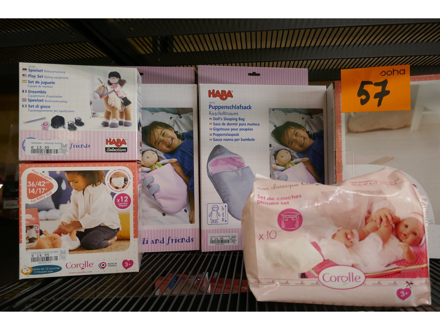 Poppen slaapaccesoires 6 stuks : pampers - slaapzak - ruitersuitrusting - bed<br /> *merk : HABA/COROLLE<br /> info : winkelprijs €110