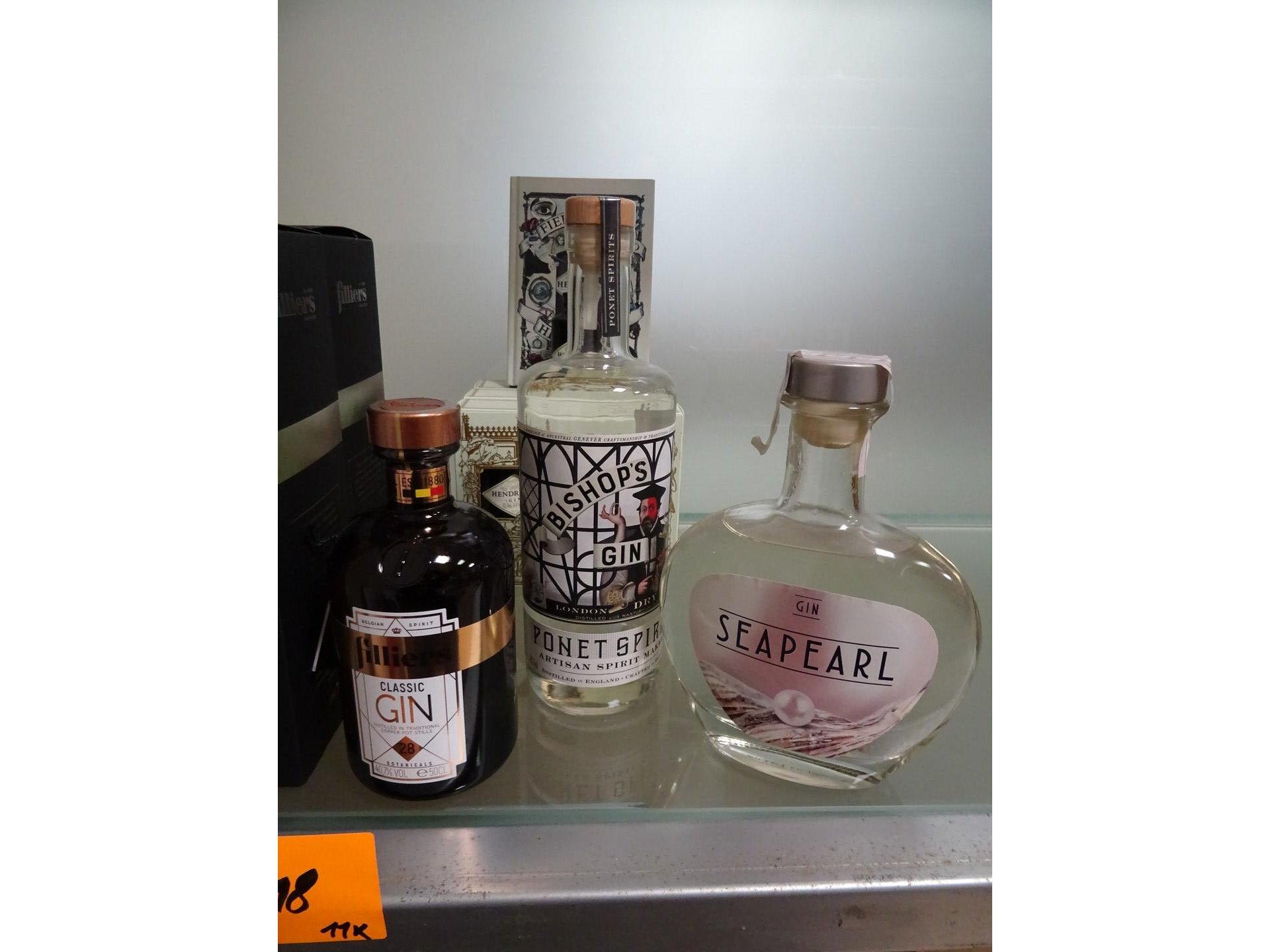 4x Filliers genever, 1x Filliers classic gin, Bishop's gin, Seapearl, Mini-gin's Hendrick's
