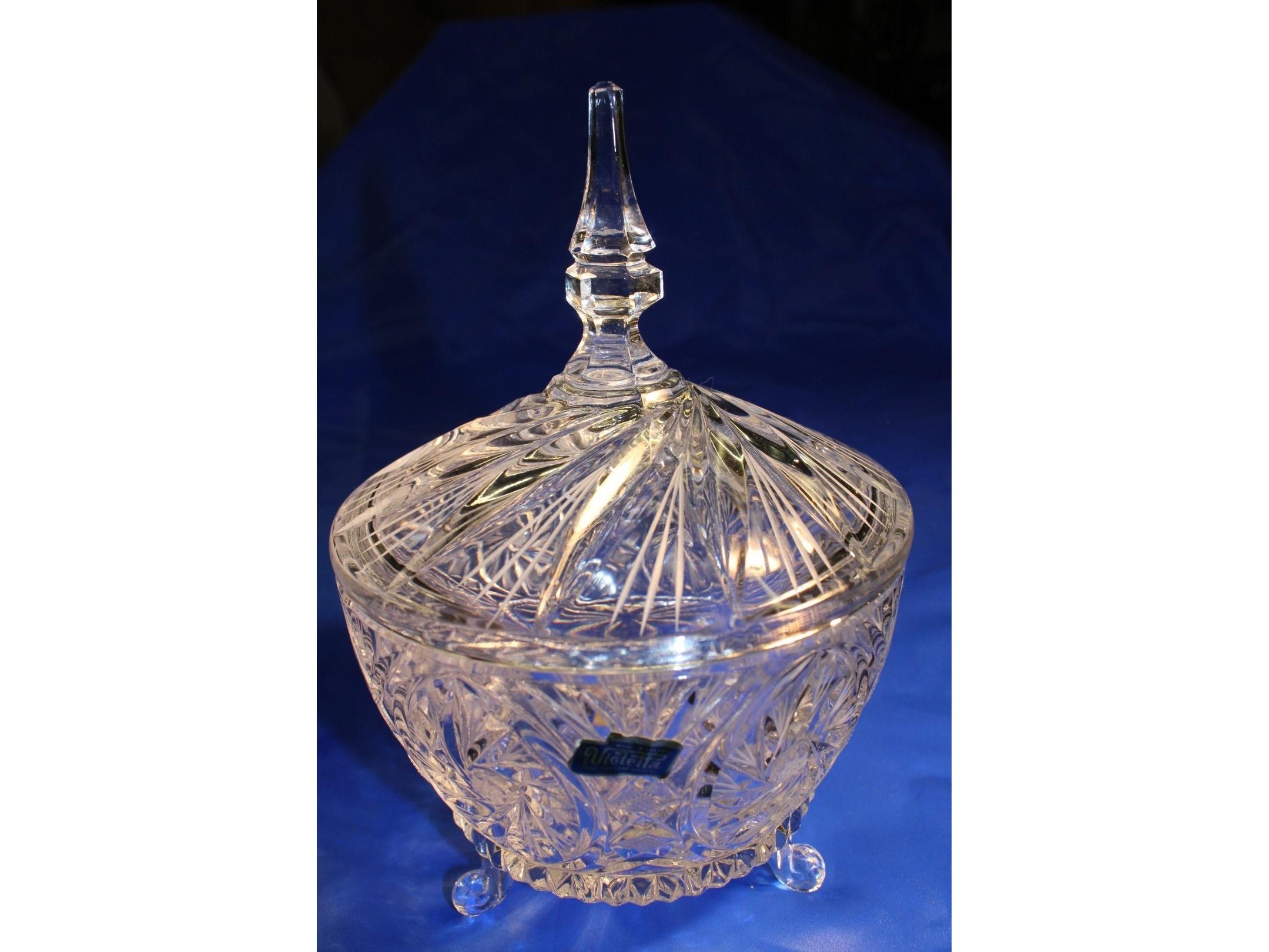 2 kristal bonbonieres afm 230 x 160 mm + 1 waterkan met glas afm 160 x170 mmis merk ; violetta loodgehalte + 24 % handgemaakt<br /> Staat: ongebruikt