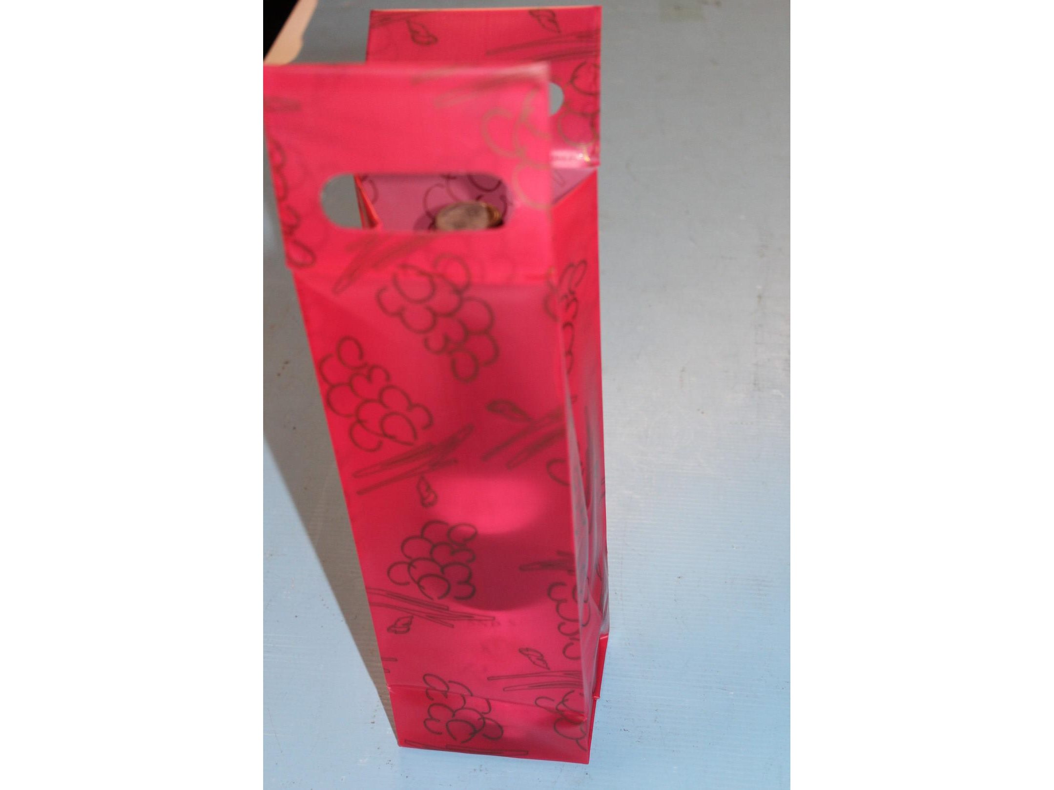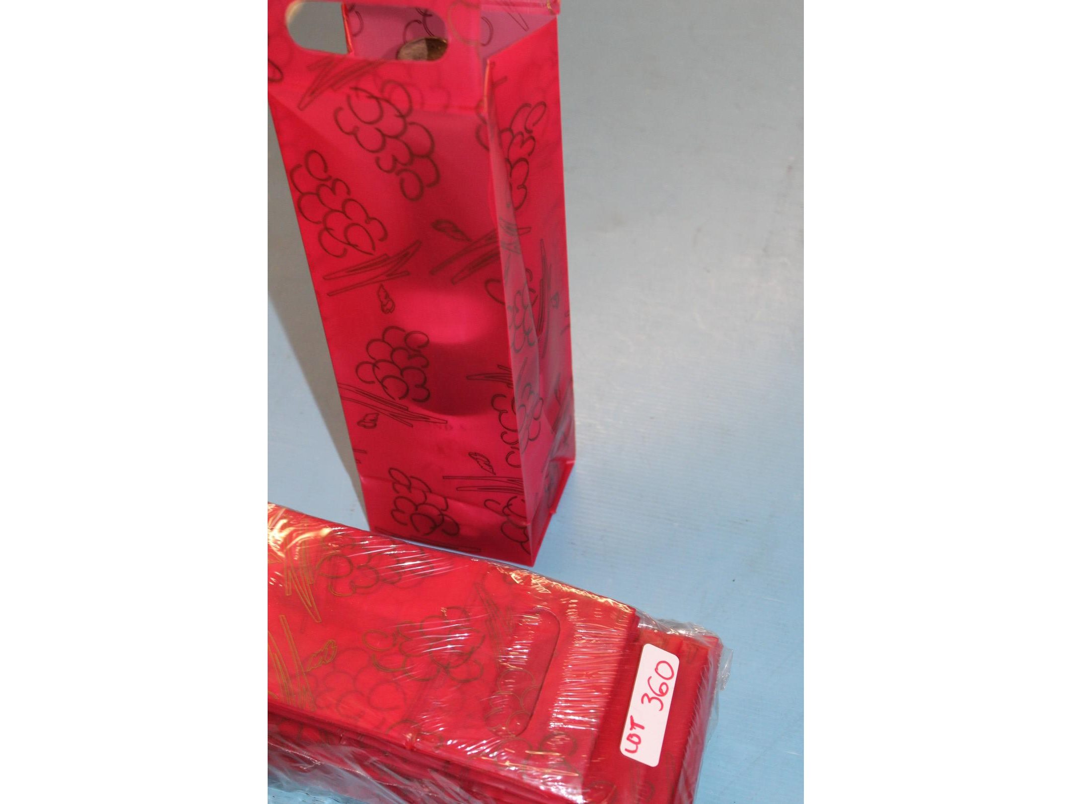 50 (2 x 25) stevige plastiek geschenkzak voor 1 wijnfles kleur ; rood met druiven motief<br /> Staat: ongebruikt