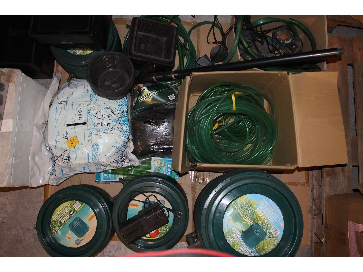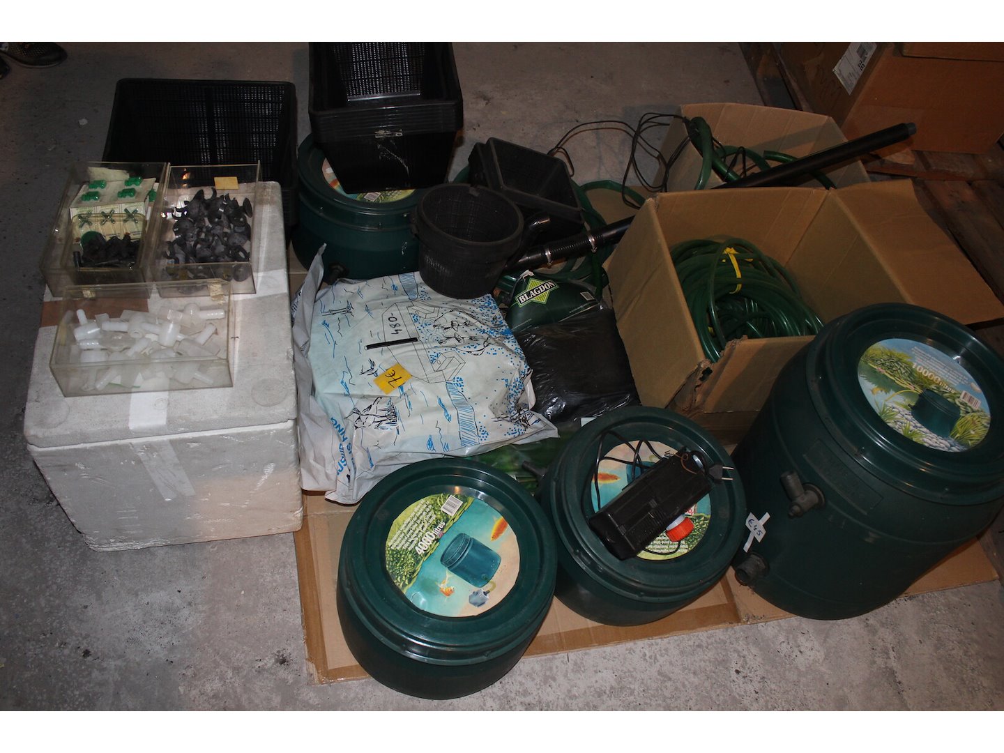 Waaronder 3 kleine vijverfilters allen nieuw, assortiment plantenbakken,aantal gebruikte filterpompen,ijsvrijhouder,aansluiting voor waterstofzuiger,vijverafdeknet,2 voederringen en darmen dit is een mix nieuw en gebruikte goederen(grote filter op foto niet inbegrepen,<br /> Staat: gebruikt