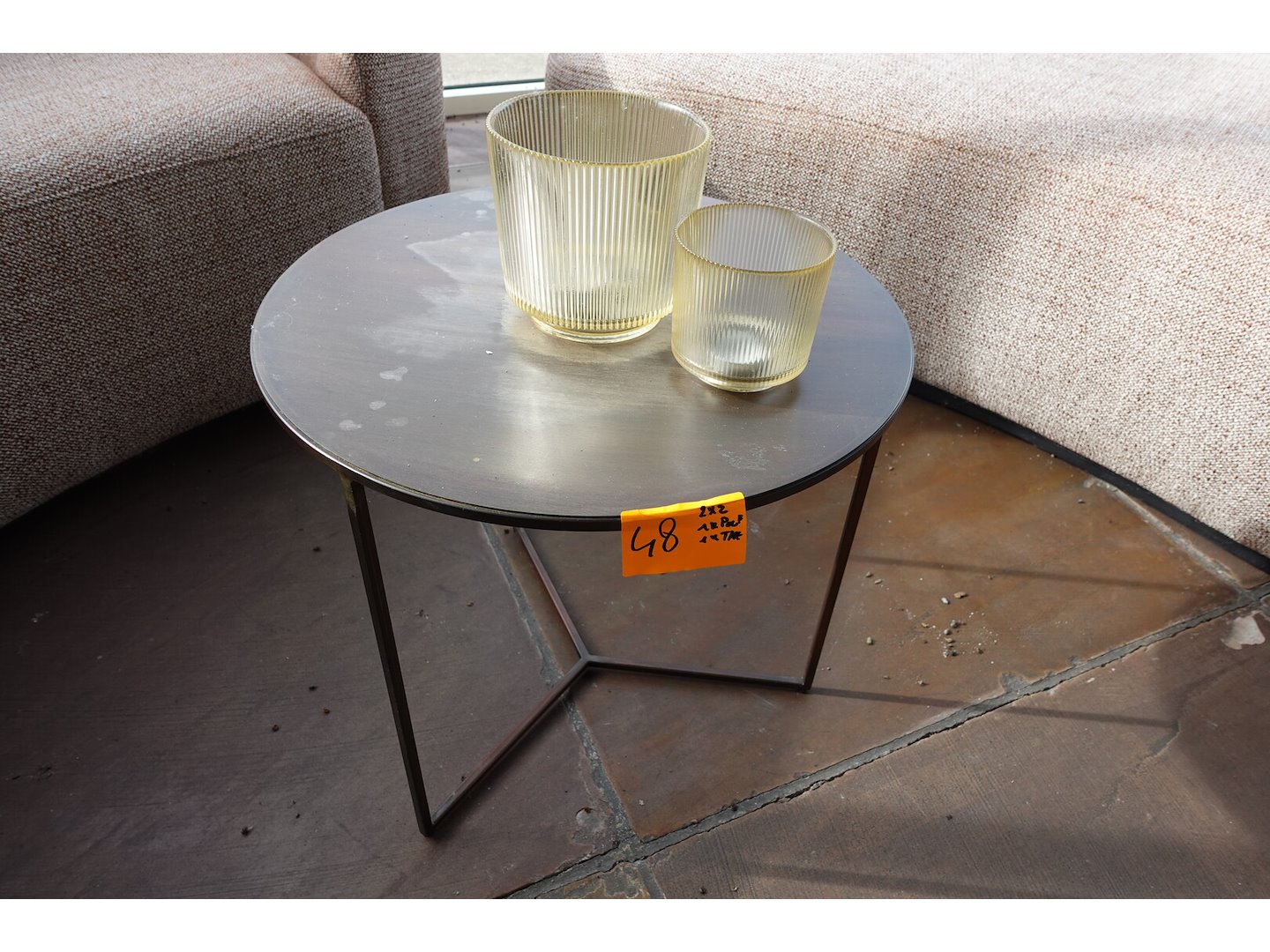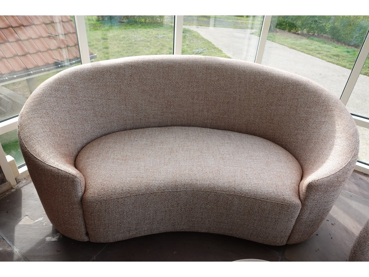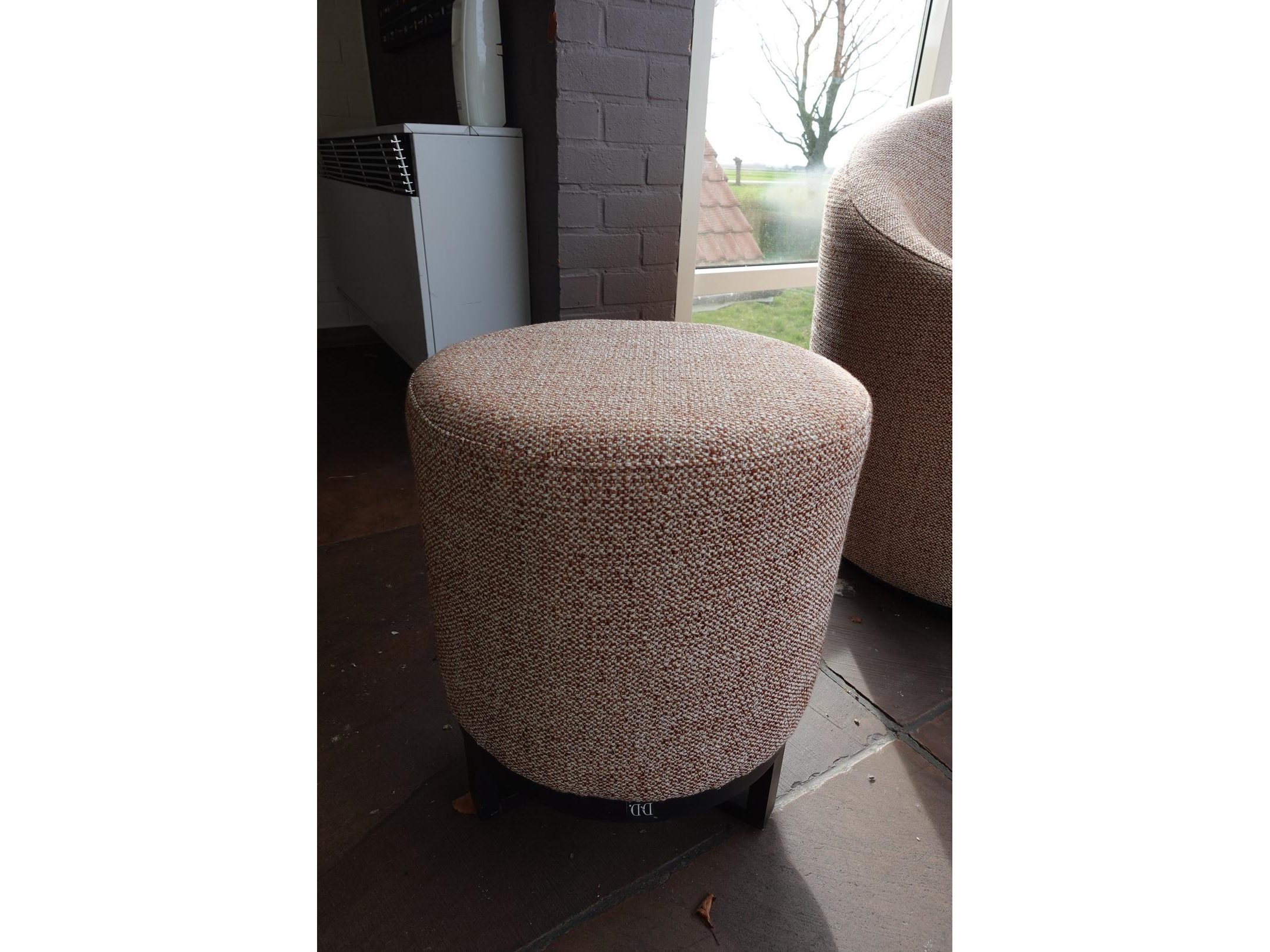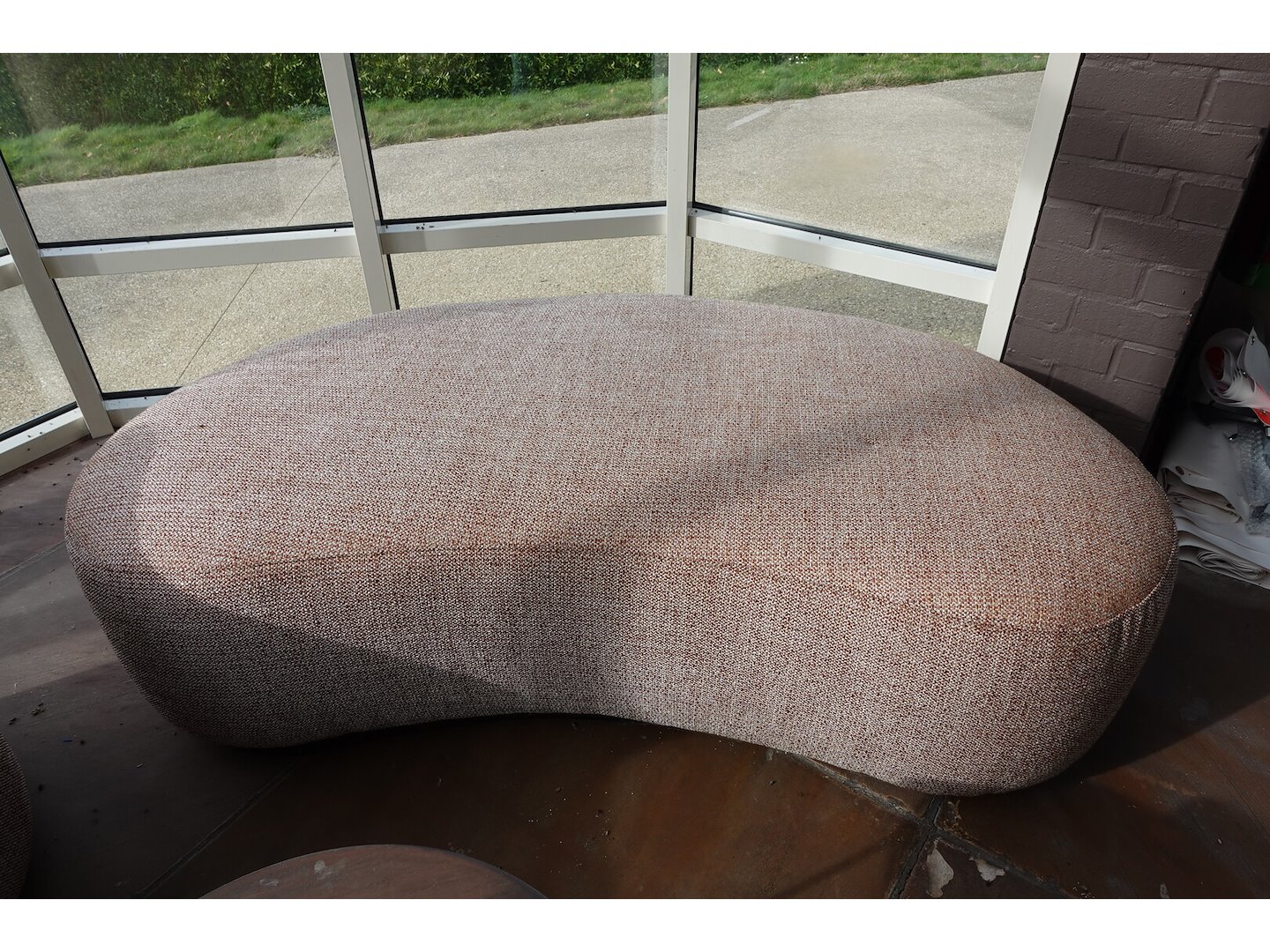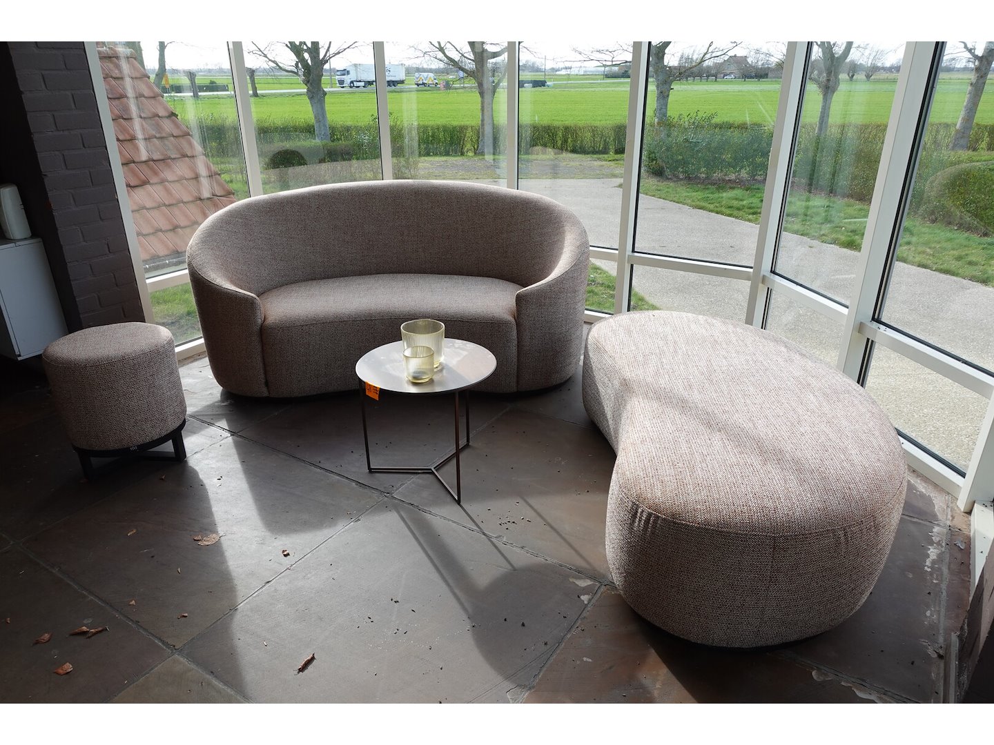 2x zitbank in stof 1850x900, poef & bijzettafel <br /> Locatie: Grote zaal achteraan links