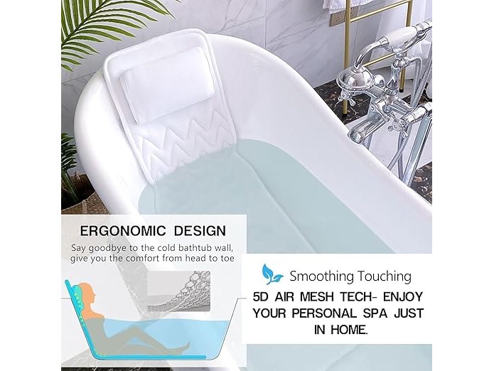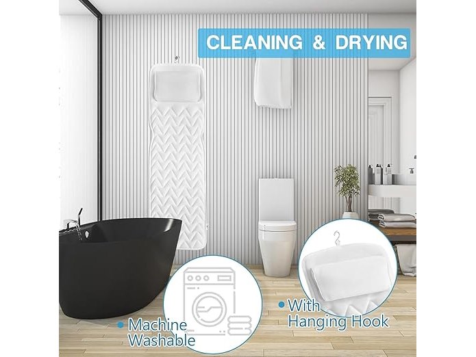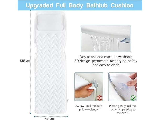 Ongeopend, ok, INMORVEN Badmat met hoofdsteun, ondersteunt nek, 125 x 43 cm, badkussen, volledig lichaam, badkussen, rug en benen, met was- en reiszak en ophanghaak voor snel drogen, wit, B0D25MZFL9