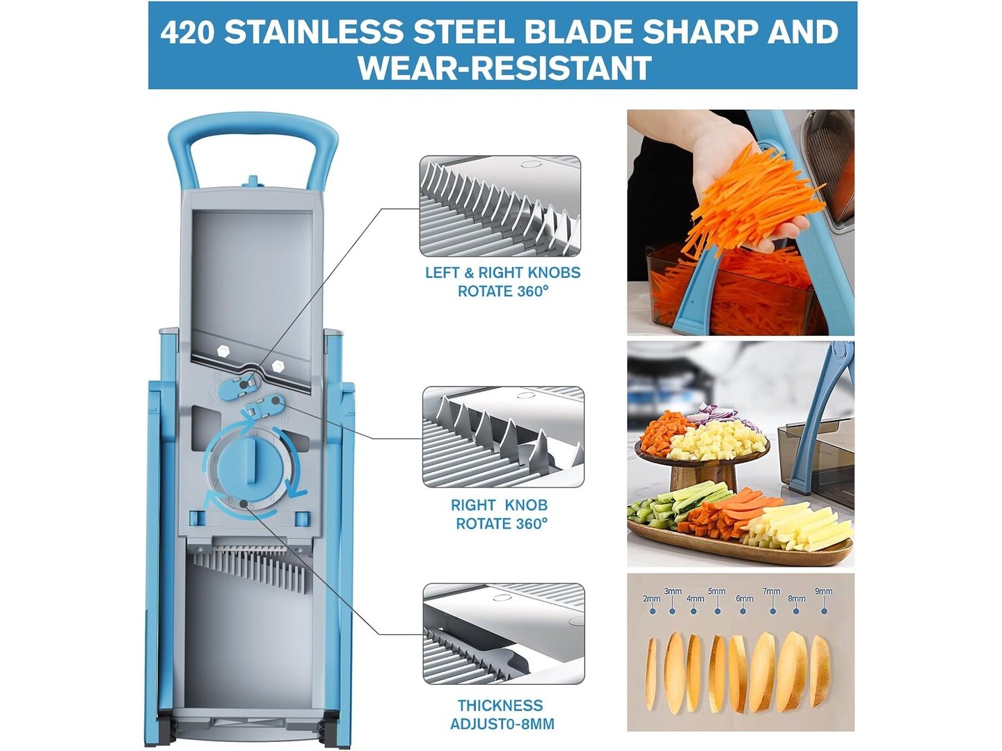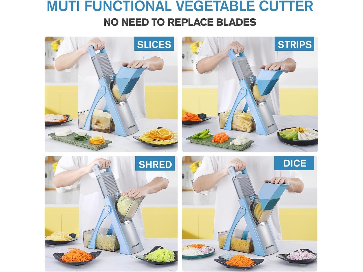 Ongeopend, INSHOME Veilige Mandoline Snijder, Groentesnijder, Voedsel Chopper Verstelbare Dikte Aardappel Snijder Frieten Cutter, Wortel Rasp Ui Snijder en Chopper, blauw , B0CK161CGK