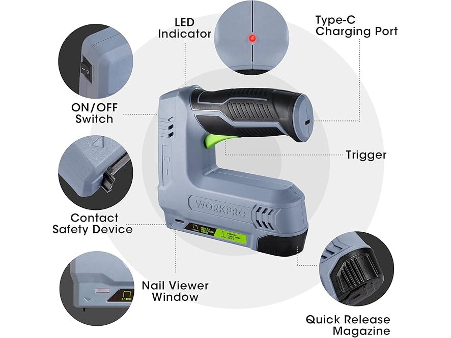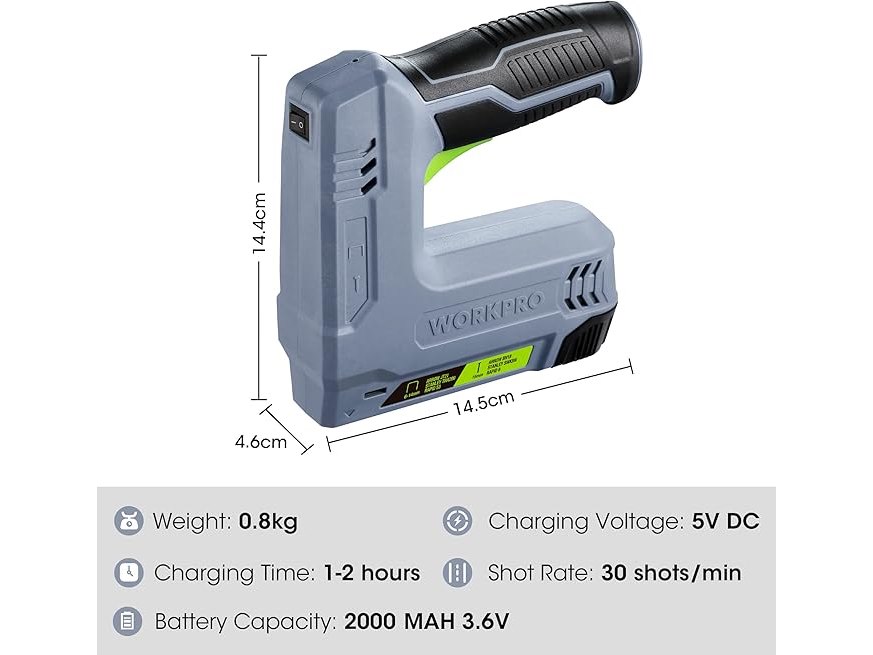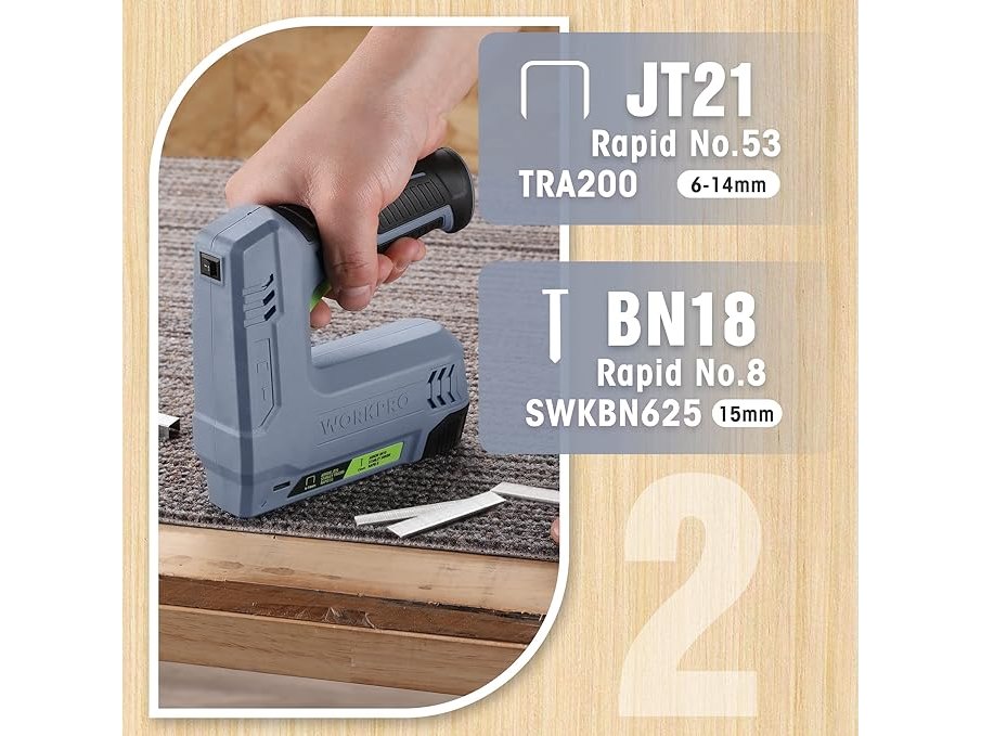 Ongebruikt, getest en werkend, ok, enkel toestel, WORKPRO Draadloze nietmachine, 3,6 V, 2000 mAh, met 2000 nietjes, multifunctionele nietmachine, 2-in-1, compatibel met spijkers en nietjes type 53, 8, voor knutselprojecten in meubels, timmerwerk, B0B9XCM82D