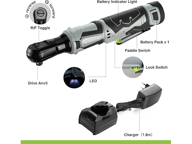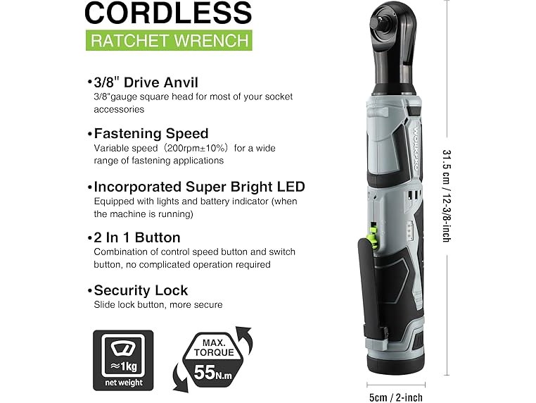 Ongebruikt, getest en werkend, volledig, ok, WORKPRO Elektrische ratelsleutelset, 12V accuratel, 3/8", 55 Nm, draadloze ratelschroevendraaier met 2 x 2,0 Ah accu, ledlicht, incl. 9 dopsleutels, opbergtas, oplader, B0C2BRMCYS