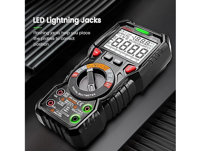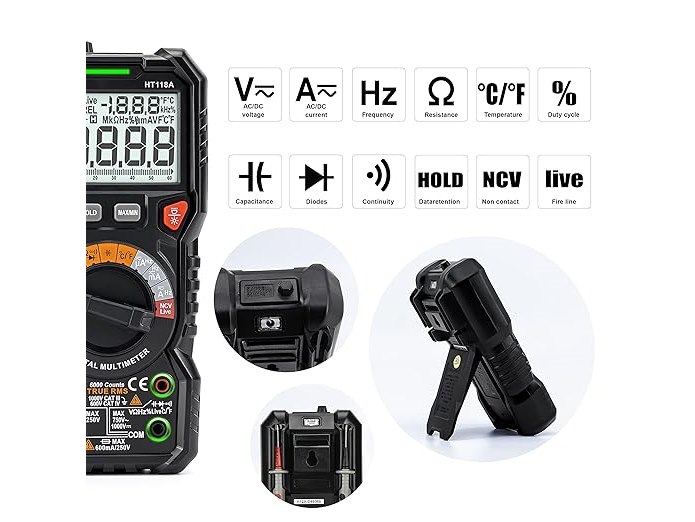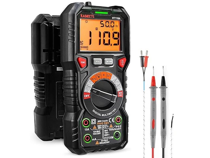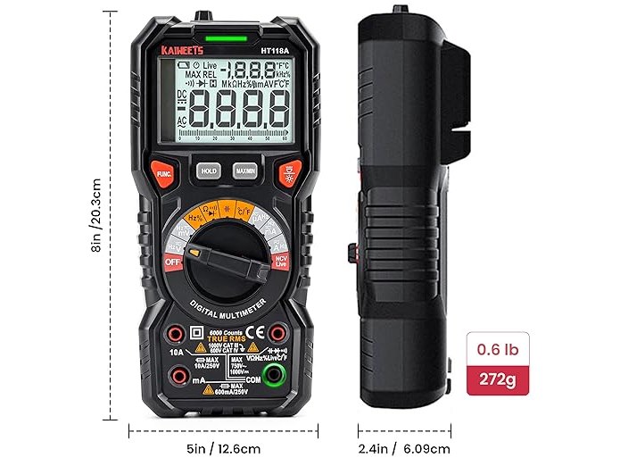 Ongebruikt, getest en werkend, volledig, ok, Kaiweets digitale multimeter met LED-indicator, stroommeter CAT III 1000 V, CAT IV 600 V True RMS Auto-Range 6000 teller, meet spanning, capaciteit, temperatuur en weerstand voor elektriciens, B07SHLS639