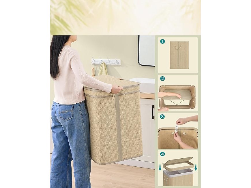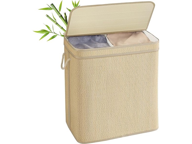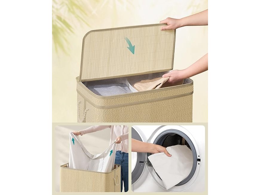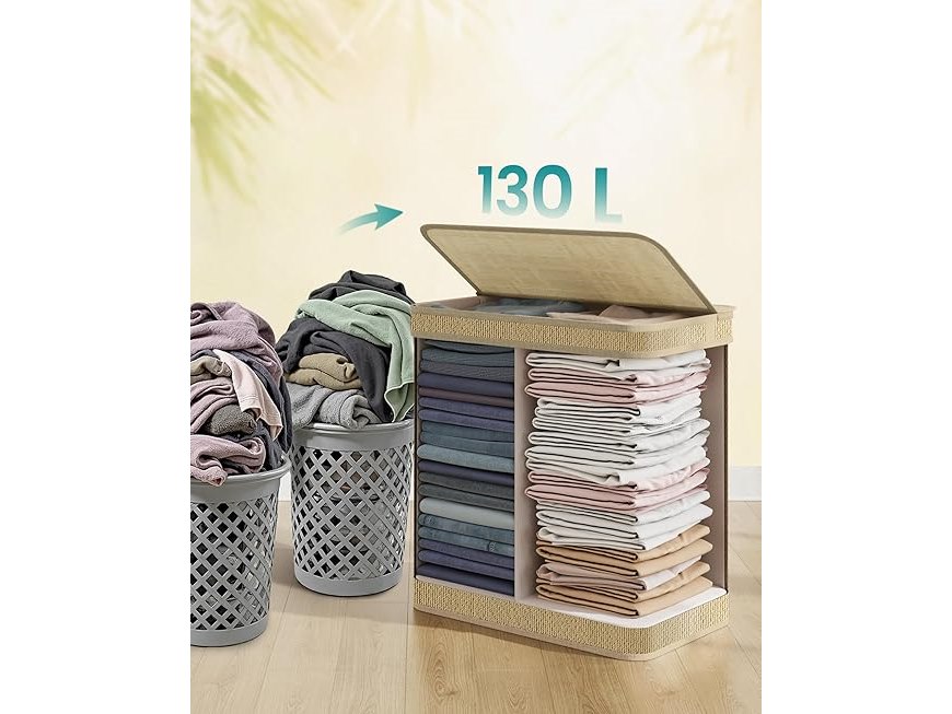 Ongebruikt, volledig, ok, SONGMICS Wasmand met 2 compartimenten, bamboe wasmand, 130 liter, afneembare en machinewasbare waszak, met deksel, handgrepen, voor wasruimte, slaapkamer, woonkamer, natuurlijke kleur LCB068Y01, B0DQ8LGSGP