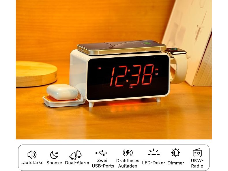 Ongebruikt, getest en werkend, ok, iTOMA Wekkerradio met dubbele draadloze oplaadfunctie en Bluetooth-luidspreker, digitale FM-radio, twee USB-poorten, dubbel alarm, nachtlampje, automatische en handmatige dimmerregeling CKS209, B09PB3XV7Q
