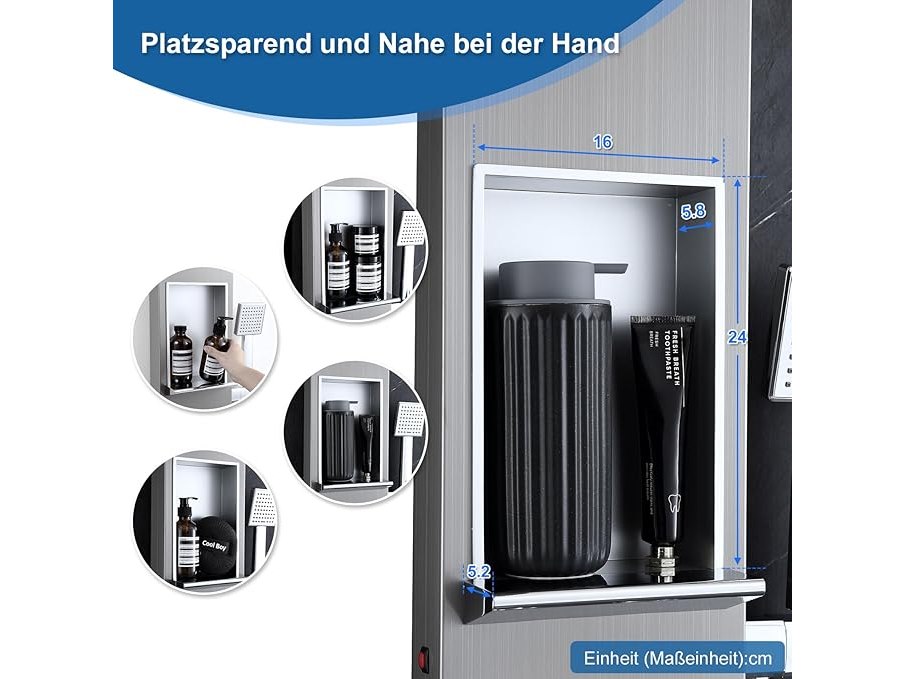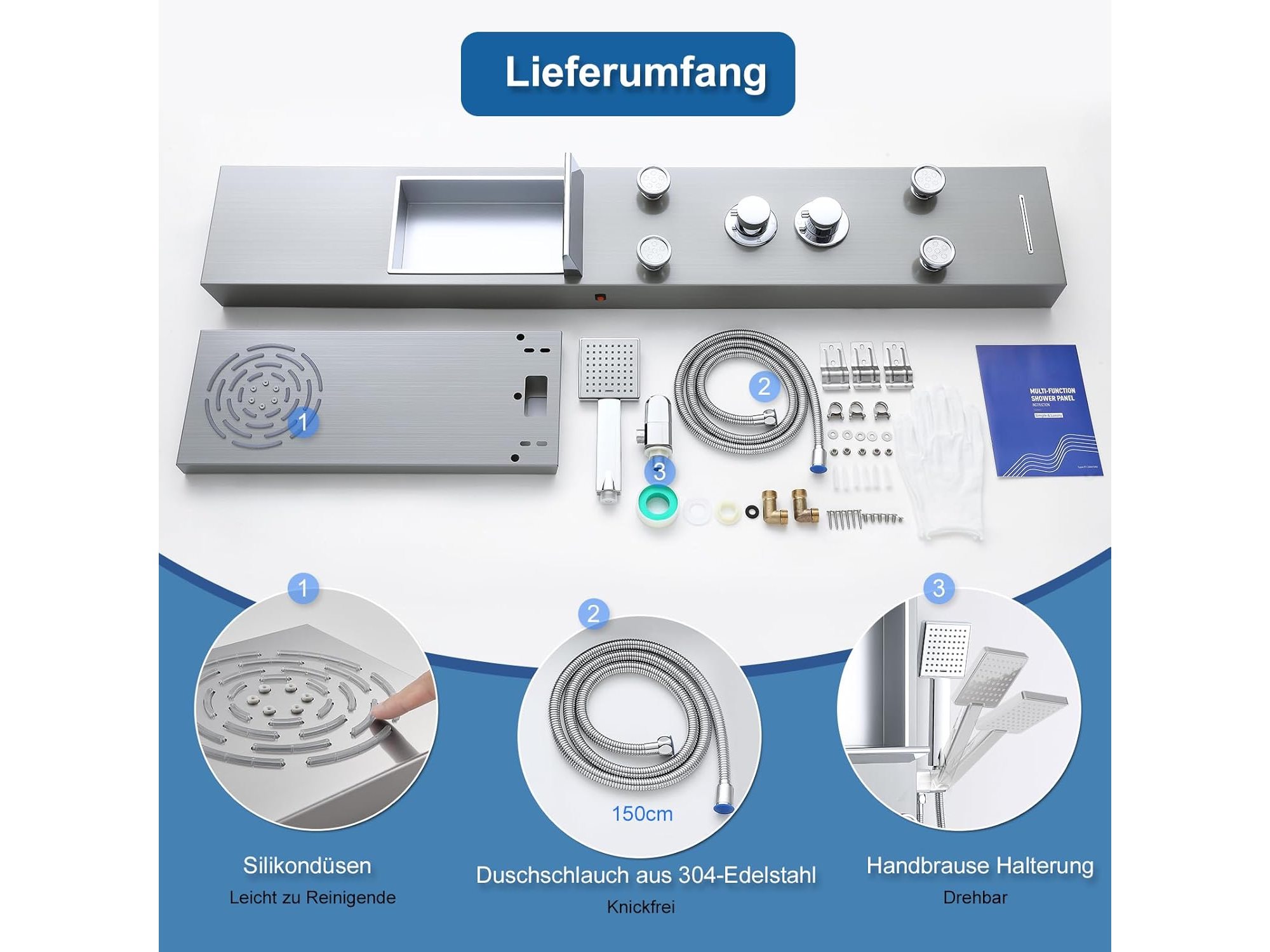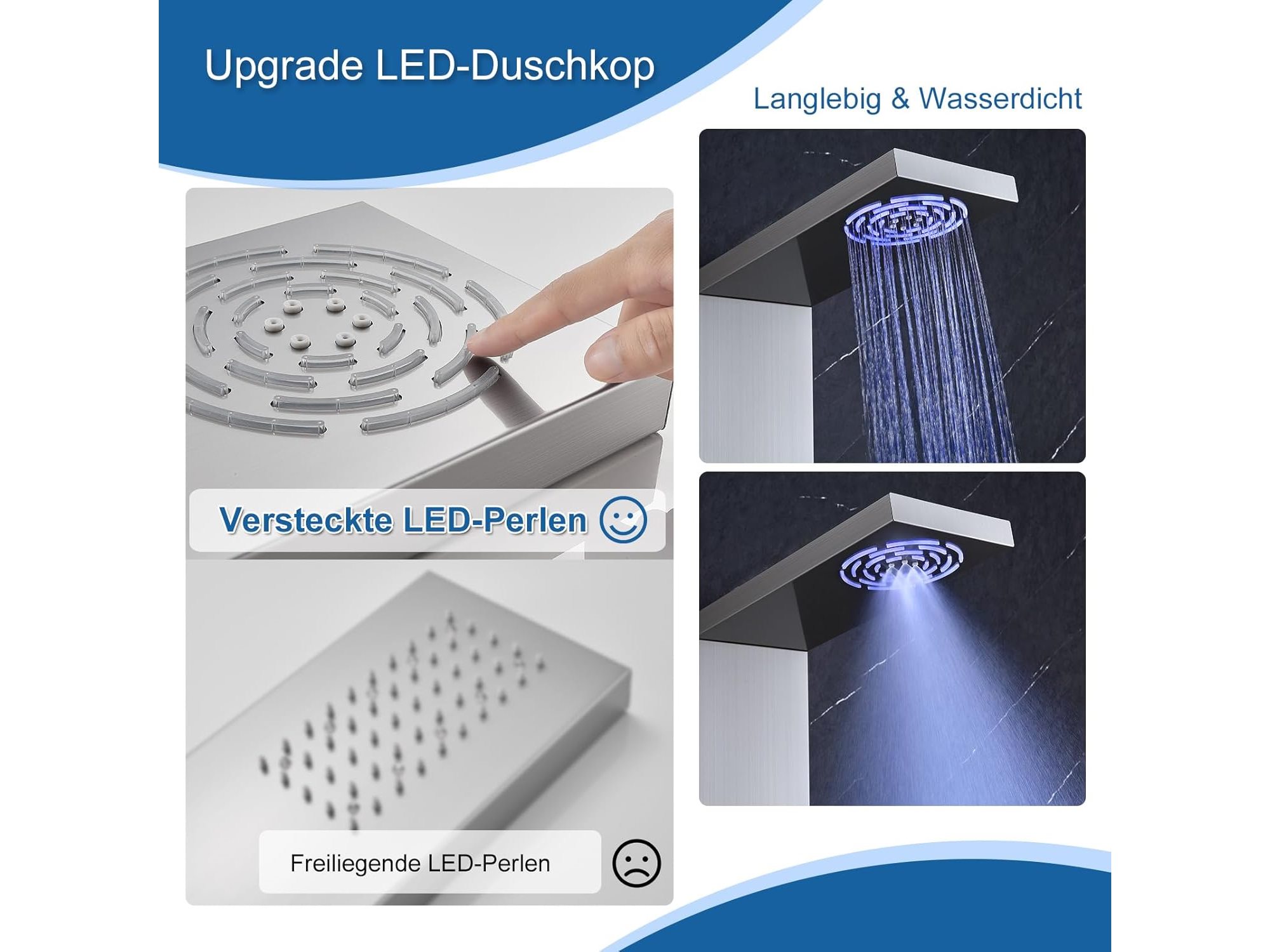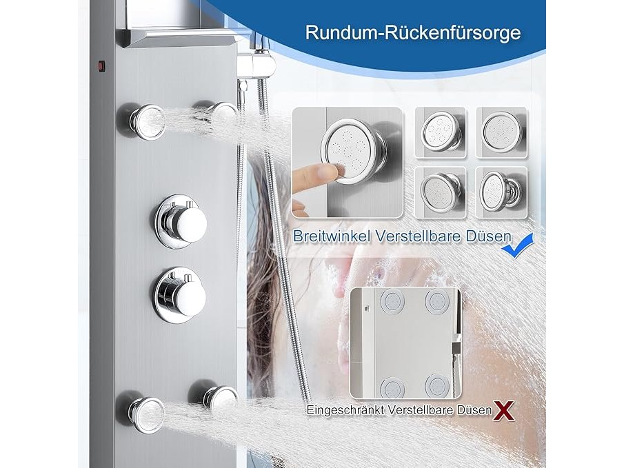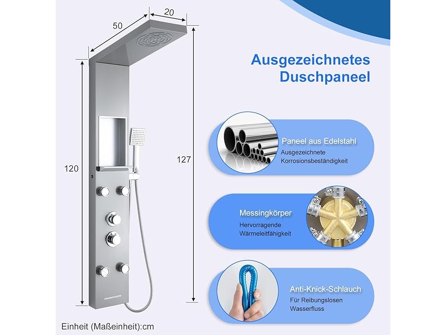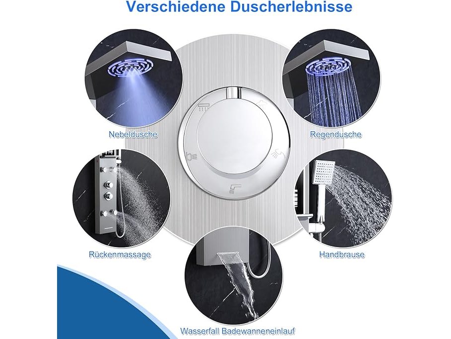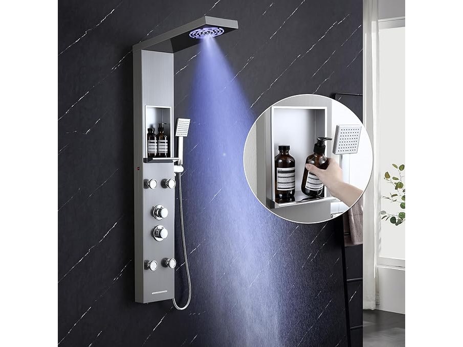 Ongebruikt, volledig, ok, Kinkibos Geborsteld douchepaneel met plank en kraan, 5 functies douchekolom LED regen- en mistdouche, 4 groothoek verstelbare massagestralen, handdouche en watervalbaduitloop, roestvrij staal, B0DKRNX3VT