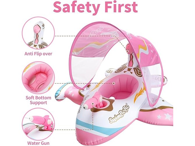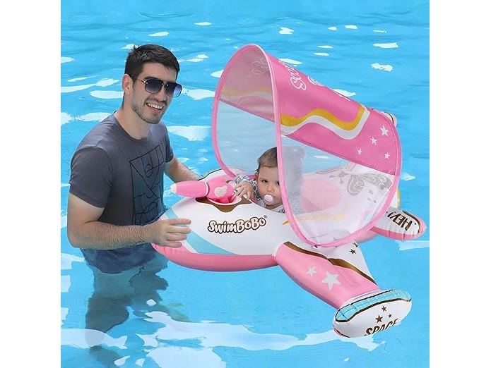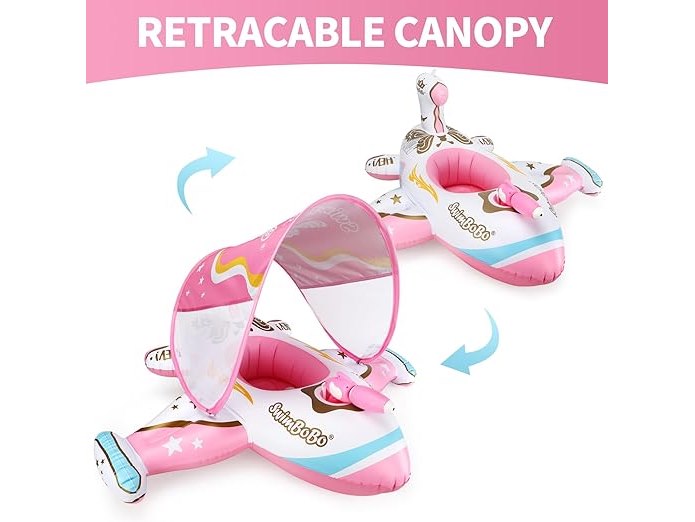 Ongeopend, ok, licht beschadigde verpakking, Swimbobo Baby Opblaasbare zwemband, Zwembadmatras met Verstelbare Zonnekap en Kinderzitje (Roze Vliegtuigje), B0CRSVKCNH
