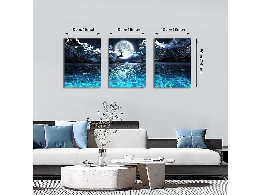 Ongeopend in seal, 3 stuks canvasfoto's met lijst, lichte maan op blauwe oceaan, nachtfoto op canvas, klaar om op te hangen, 120 x 60 cm (40 x 60 x 3) B0CLXVYVWK