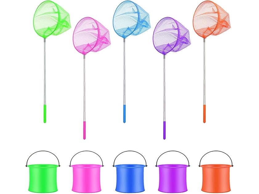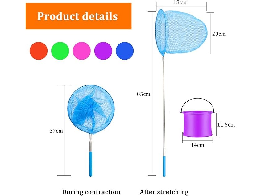 Ongeopend, 5 stuks telescopische schepnet voor kinderen, met 5 opvouwbare emmers, uittrekbaar, vlindernet, waaierzeef, B0DRC6S164