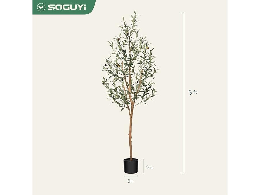 Ongeopend, SOGUYI Kunstmatige olijfboom, 150 cm hoog, met natuurlijke houten stam en realistische vruchten voor thuis en op kantoor, kunstboom in pot, B0BXS12NGH