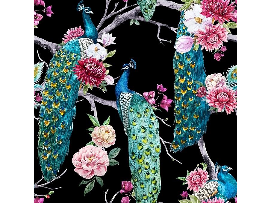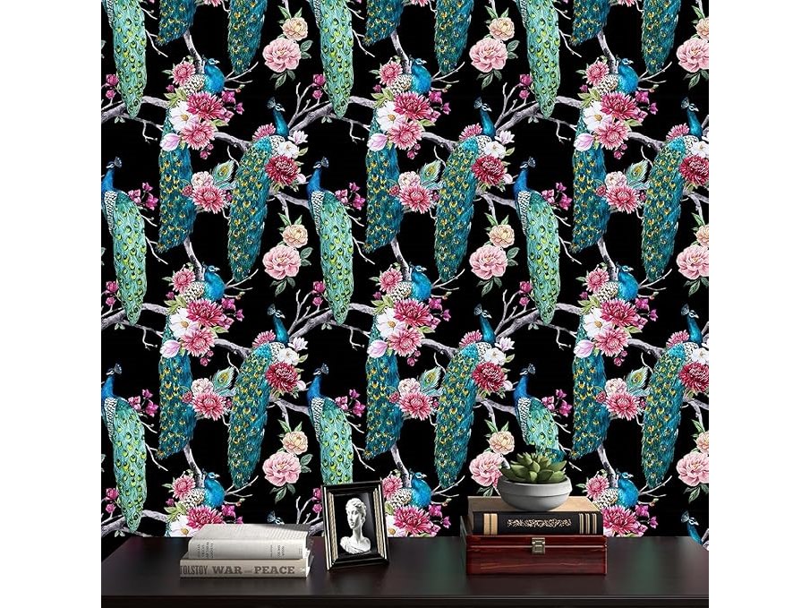 Ongeopend, in seal, 9 x ReWallpaper 44.5cm×12m Zelfklevend Behang Zwart Patroonbehang Zwart Groen Bloemenfolie voor Meubilair Zwart Patroon Pauw met Bloemen, B0CW1MJWGW