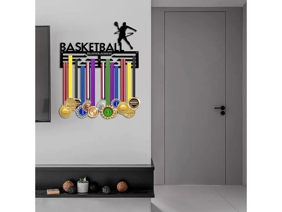 Ongeopend, ok, Medaillestand, sportmedaillestandaard voor voetballers, wandhangend, decoratief medaillerek voor sportbadges, medailles, 3 etages, hardlopen, voetbal, gymnastiek (basketbal), B0BZVWLP5Z