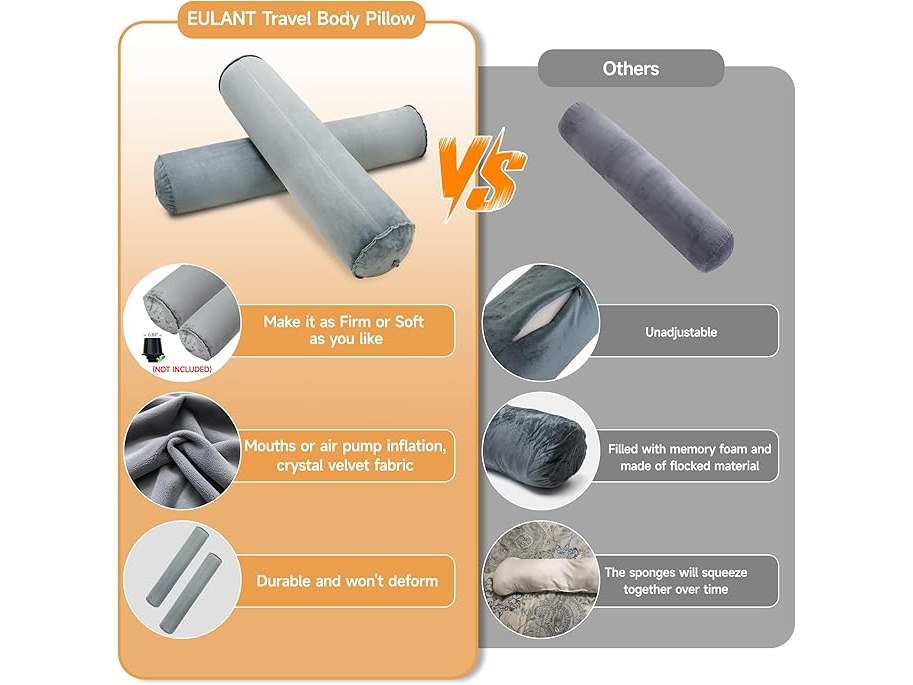 Ongeopend, in seal, EULANT Opblaasbaar zijslaapkussen (2 stuks), licht lichaamskussen voor zijslapers, lang rond lichaamskussen, steunkussen voor reizen, 90 x 20 cm, opblaasbaar en compact, B0DQKMLGK4