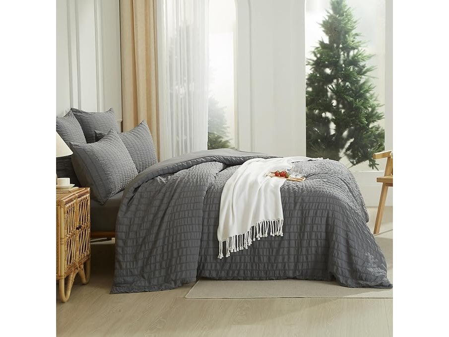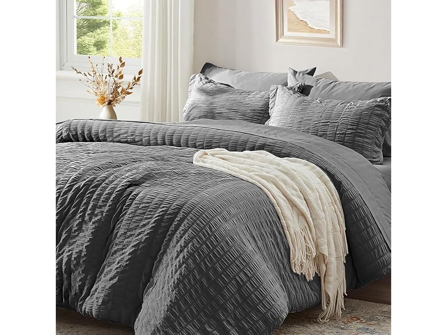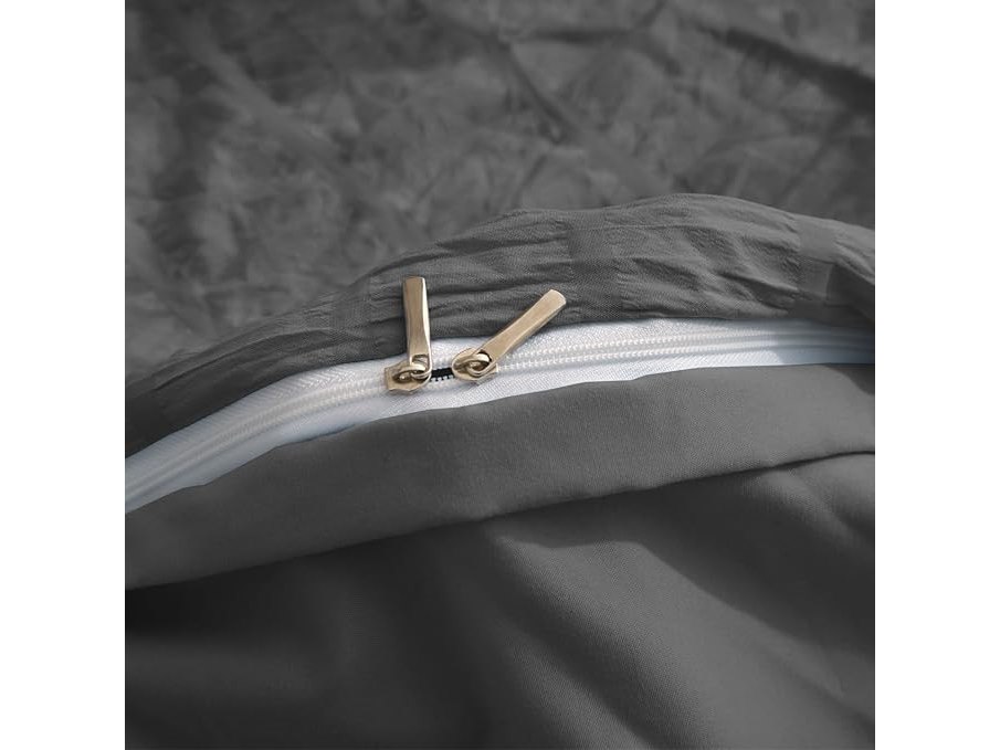 Ongeopend, ok, Seersucker Beddengoed (135 x 200 cm), 4-delig, grijs, donkergrijs, gestreept, zomer, effen, omkeerbaar, microvezel, ademend, licht, dekbedovertrekken 135, 200 cm en kussenslopen 80 x 80 cm, B0D7CZQMY3
