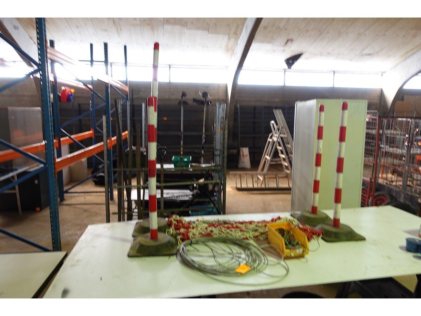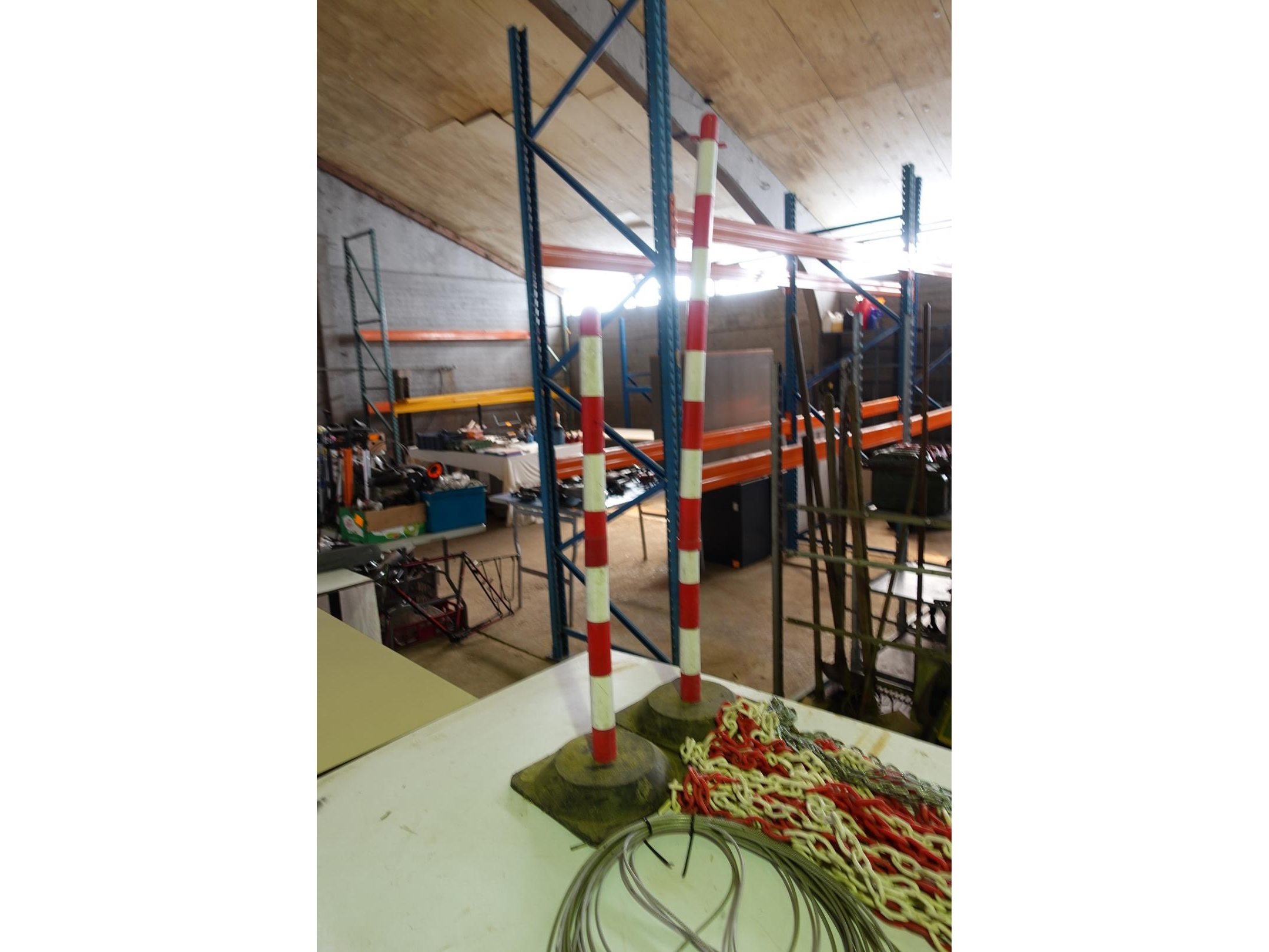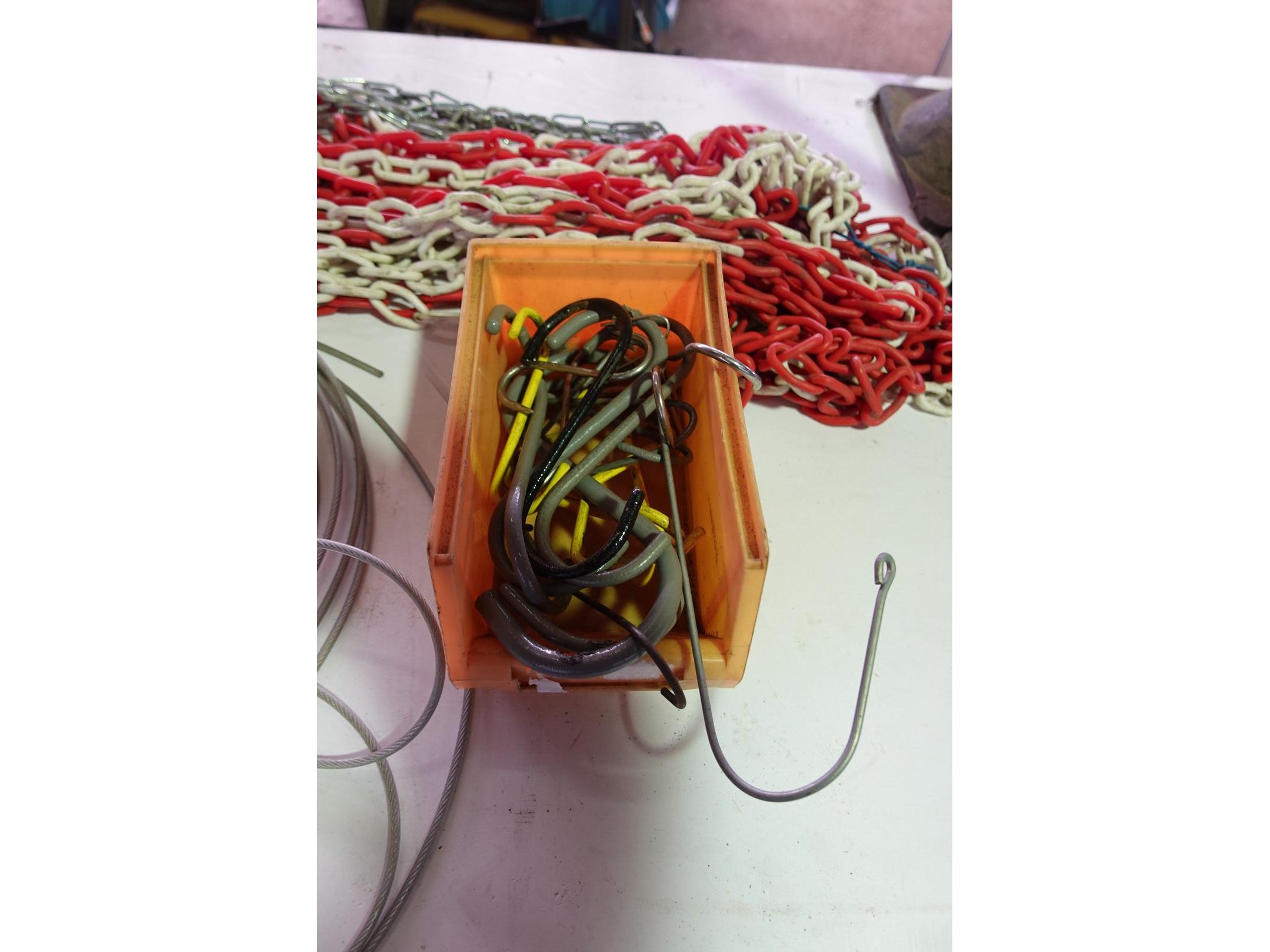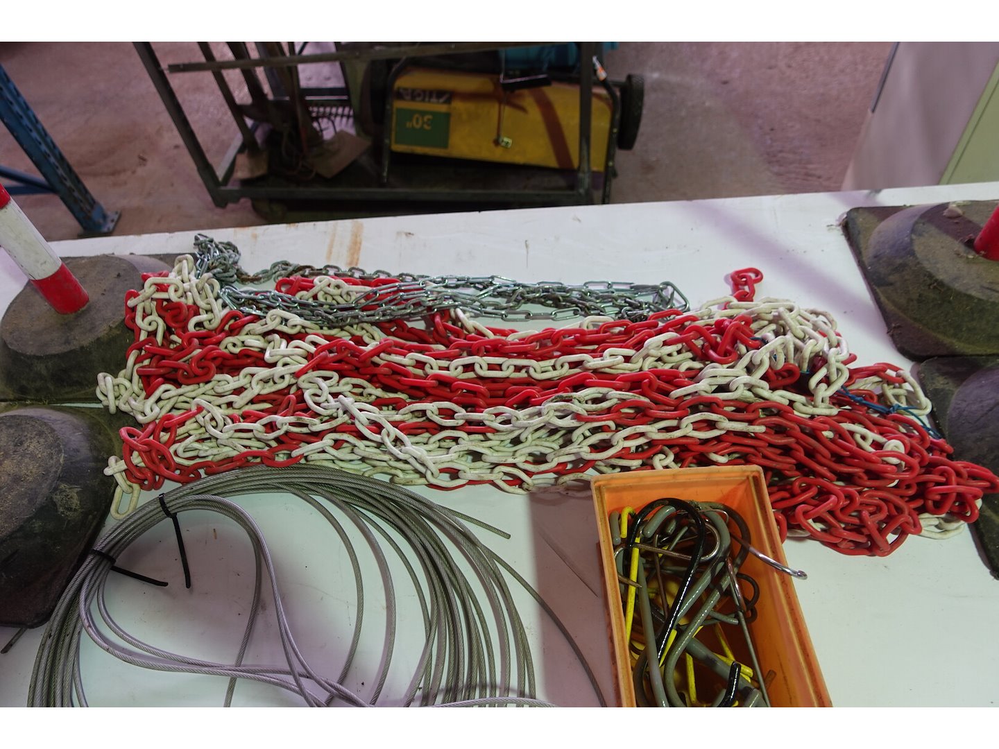 Lot kettingen, haken, geplastificieerd staalkabel en 4 signalisatiepalen