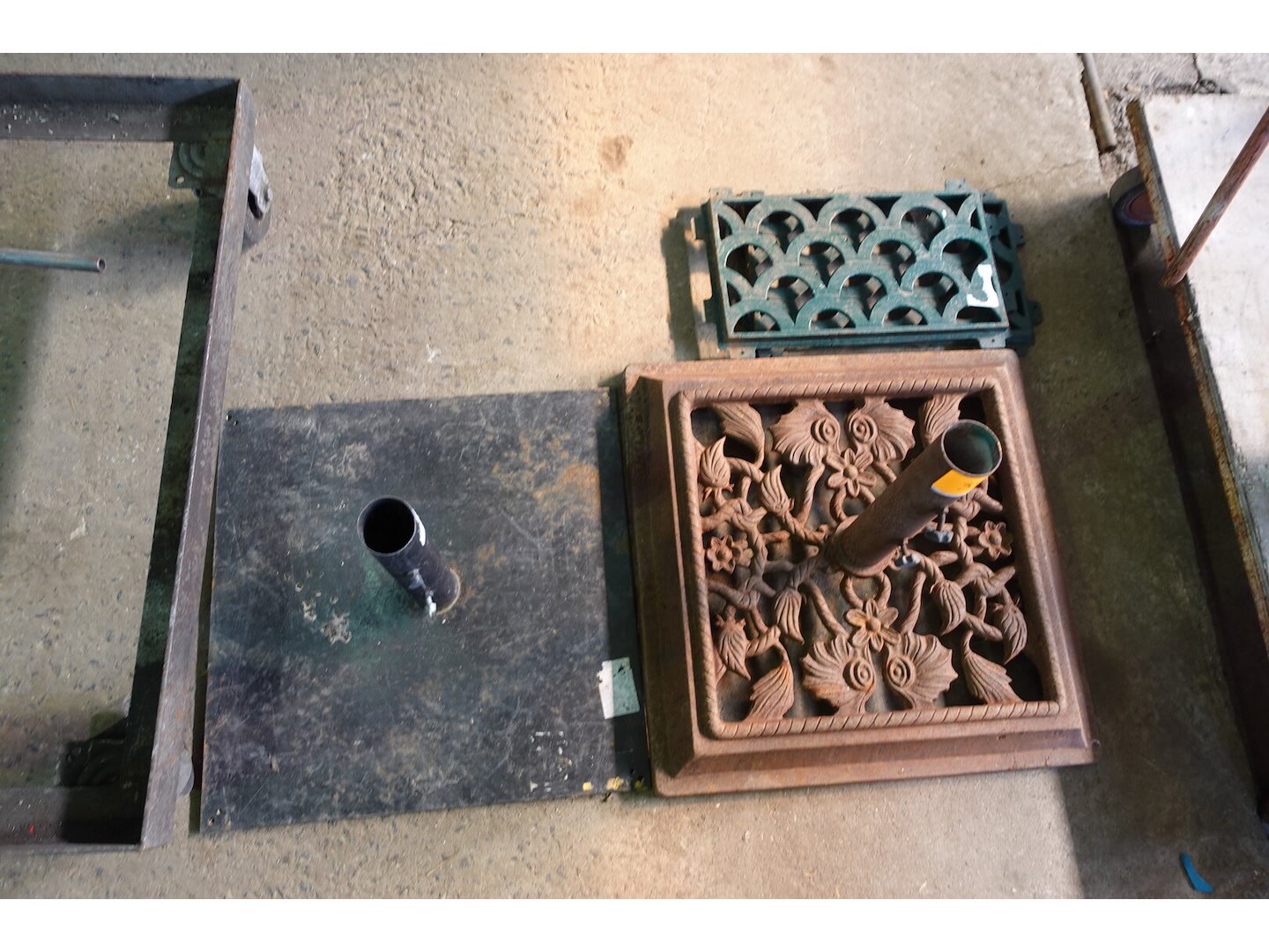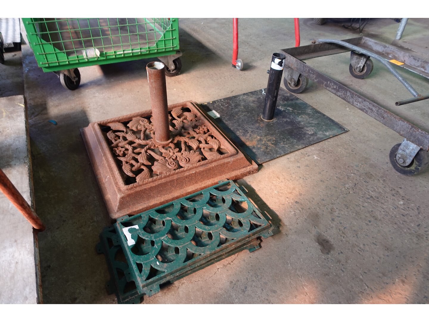 Lot met gietijzeren parasolvoet en roosters en parasolvoet