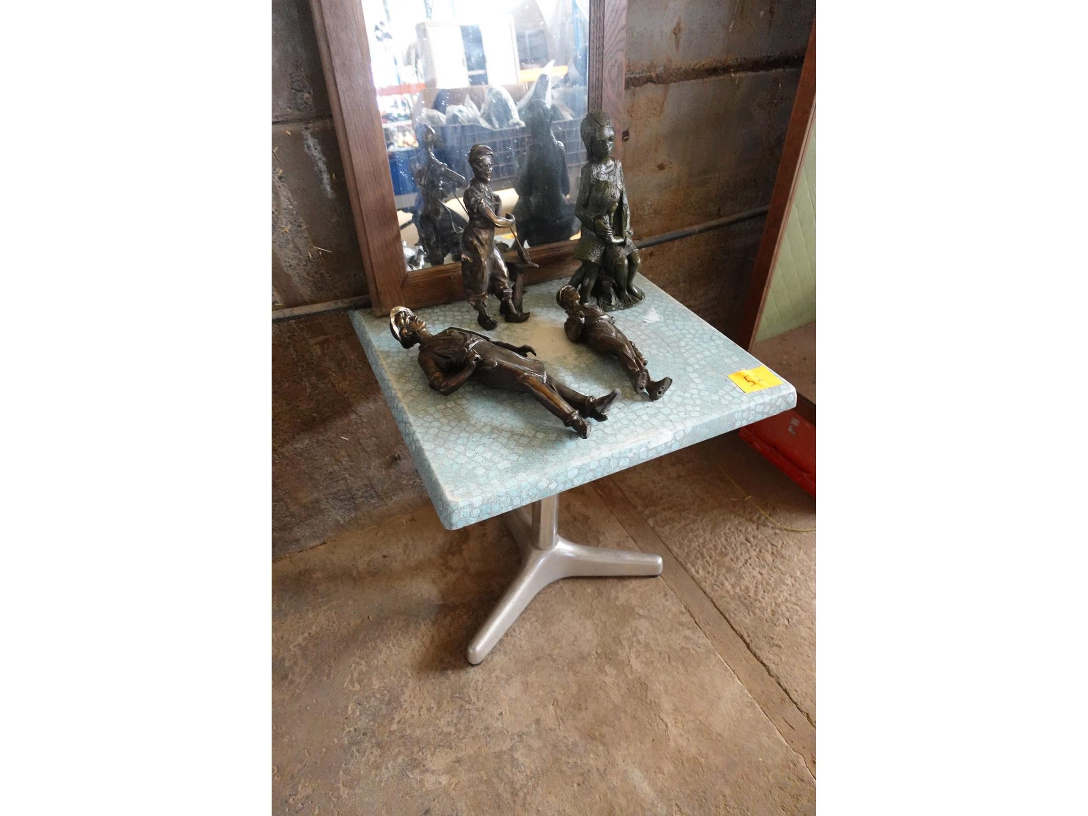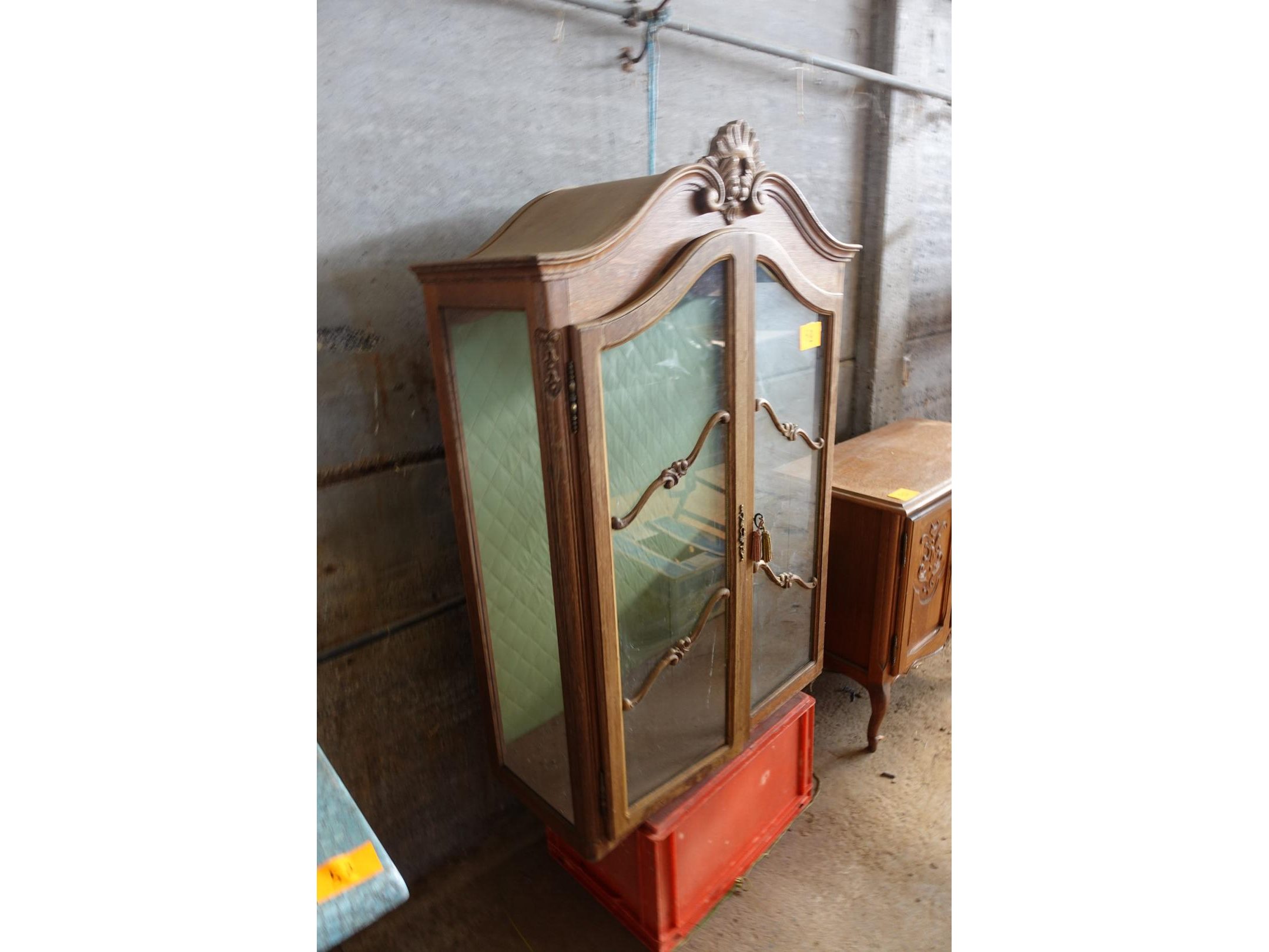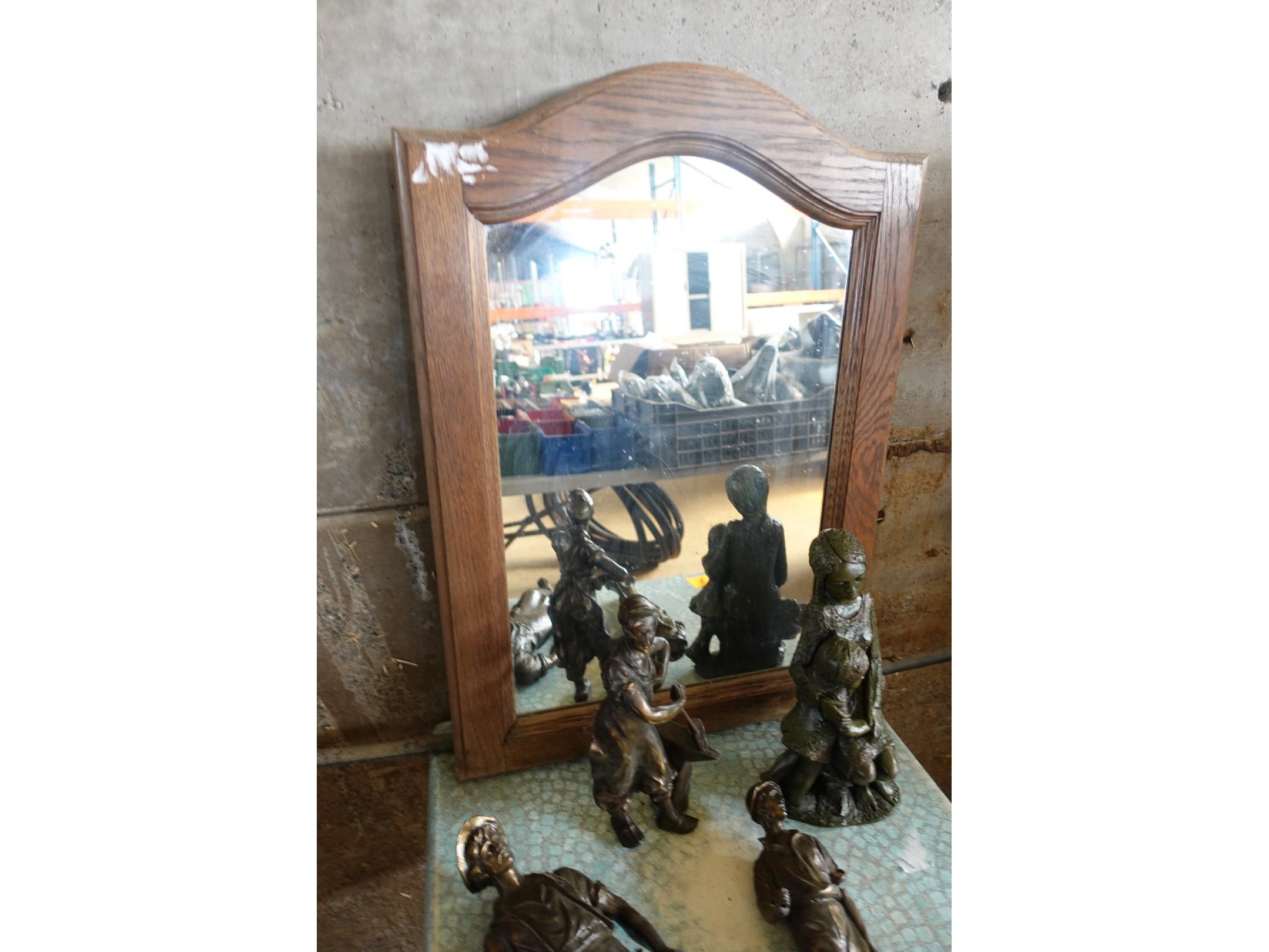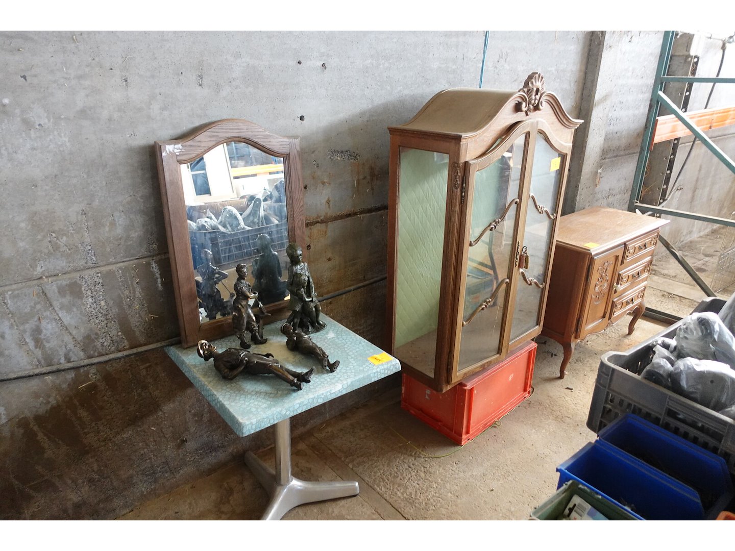 Commode en vitrinekast, terrastafel, spiegel en beelden