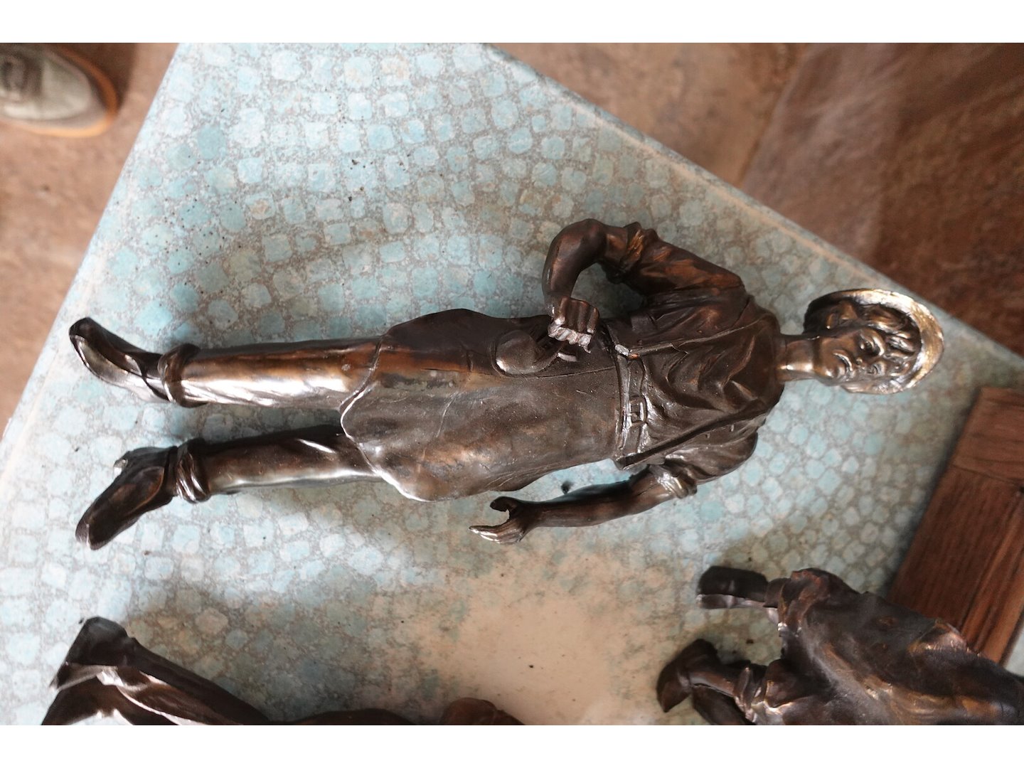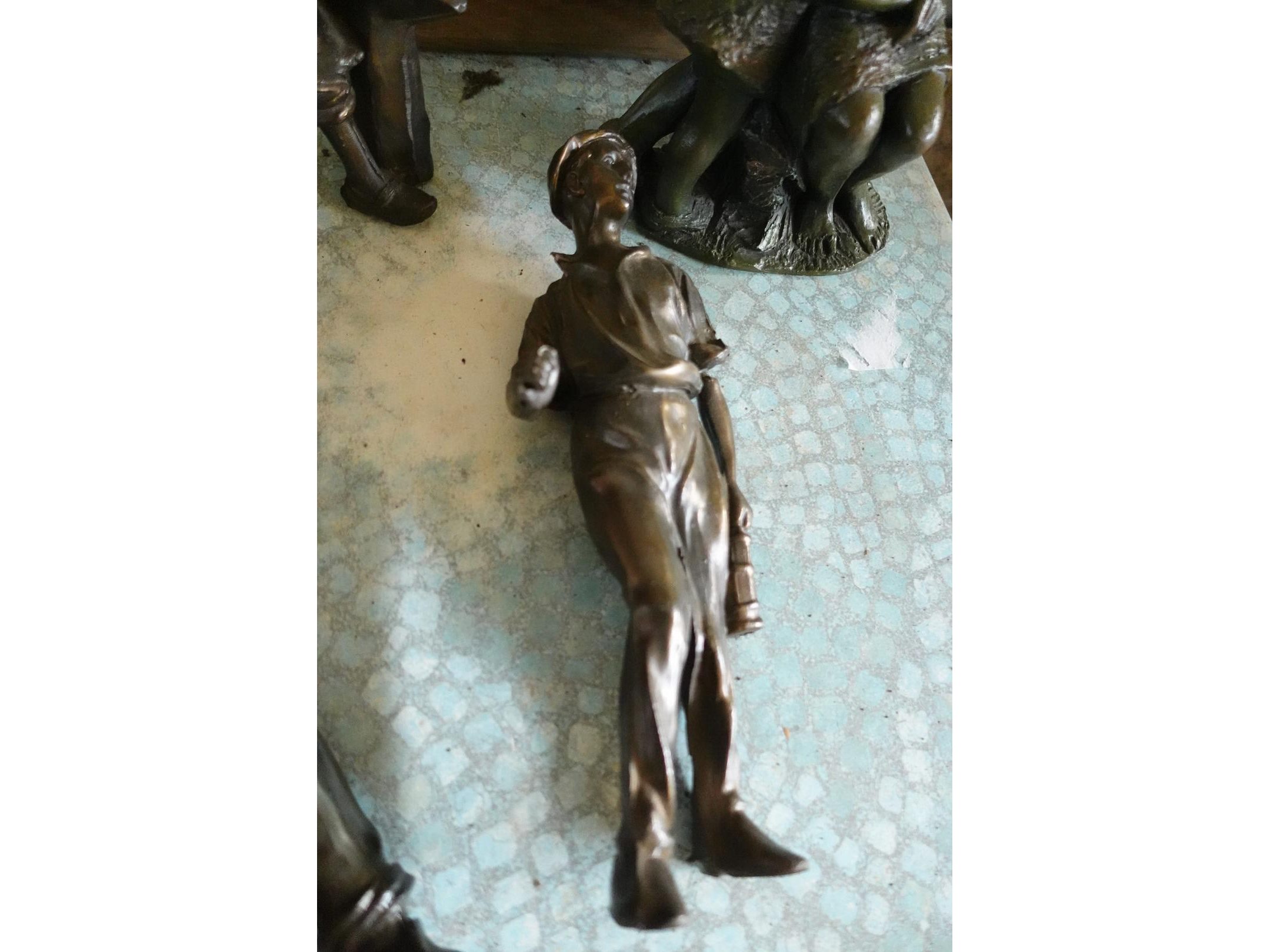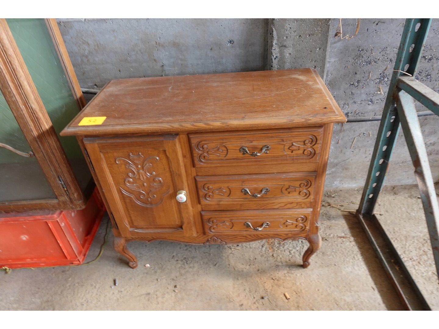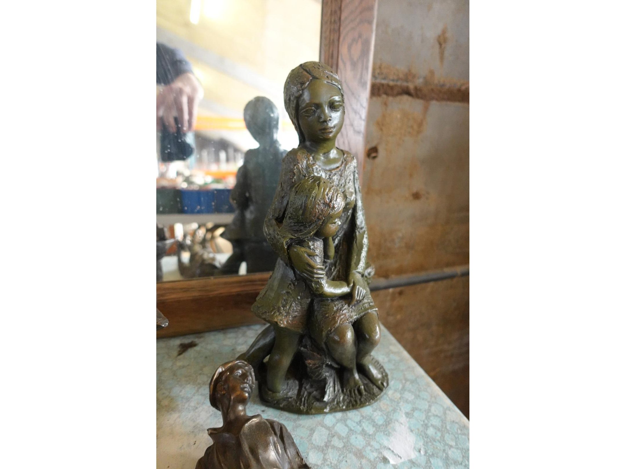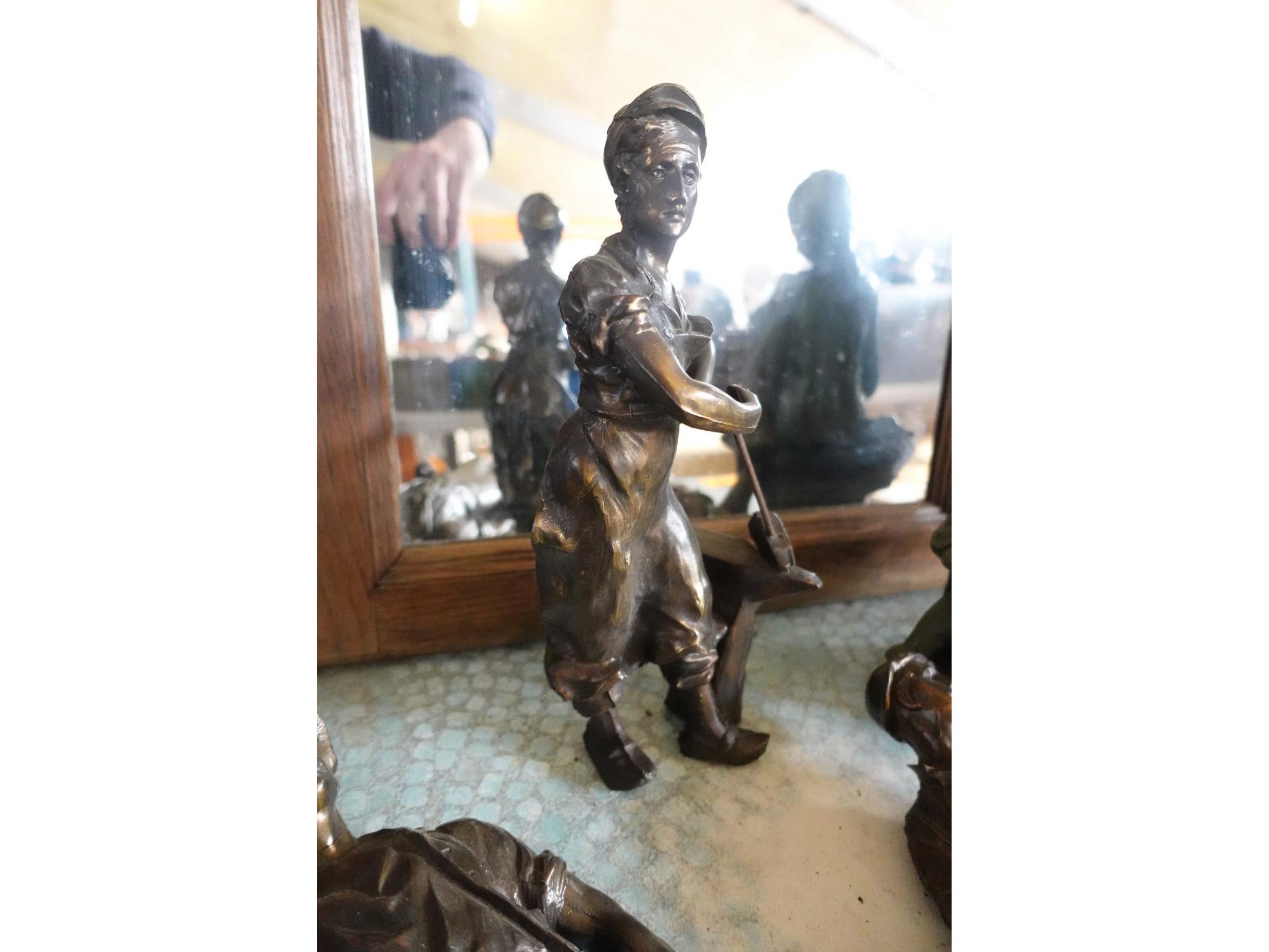 Commode en vitrinekast, terrastafel, spiegel en beelden