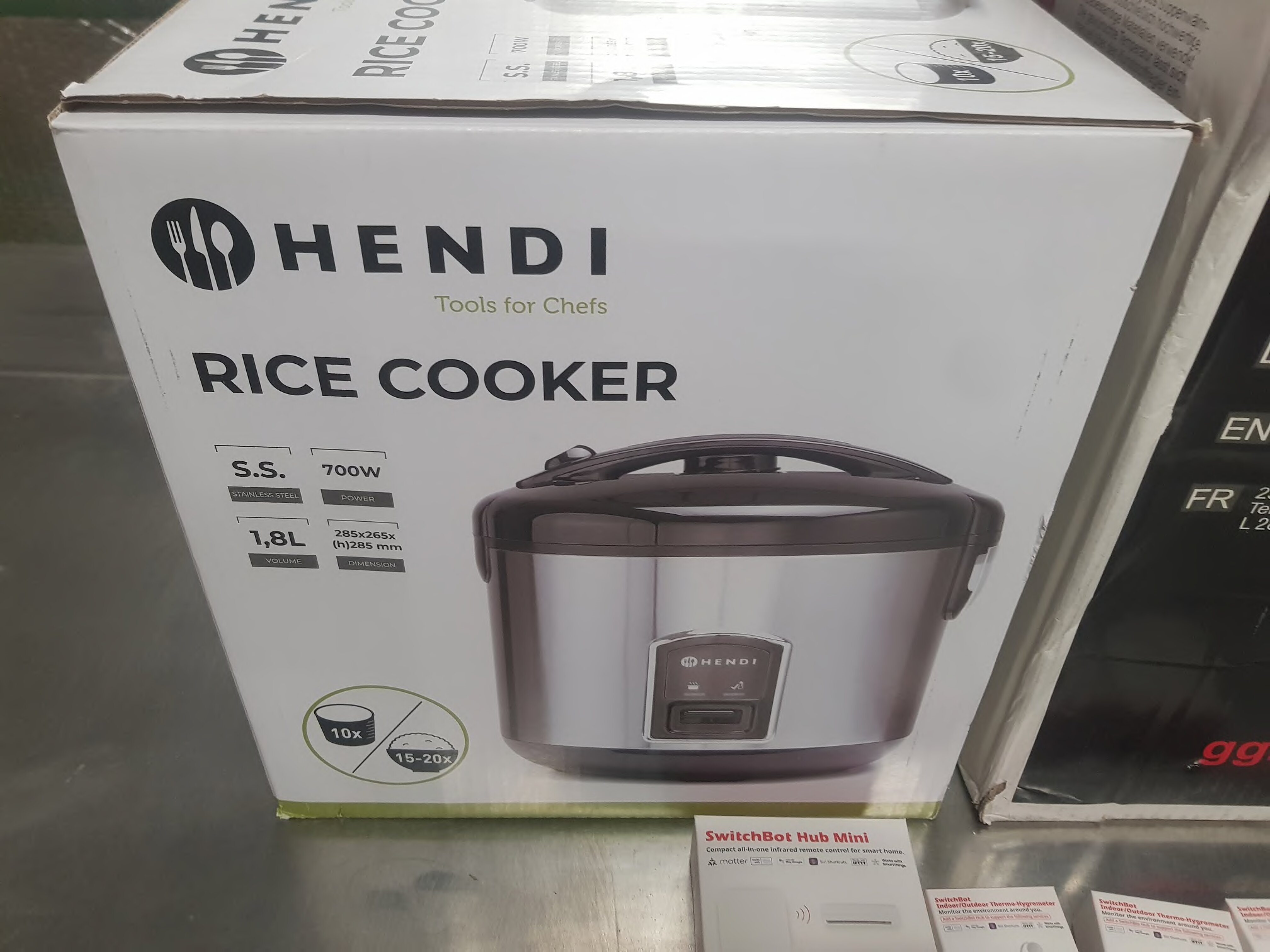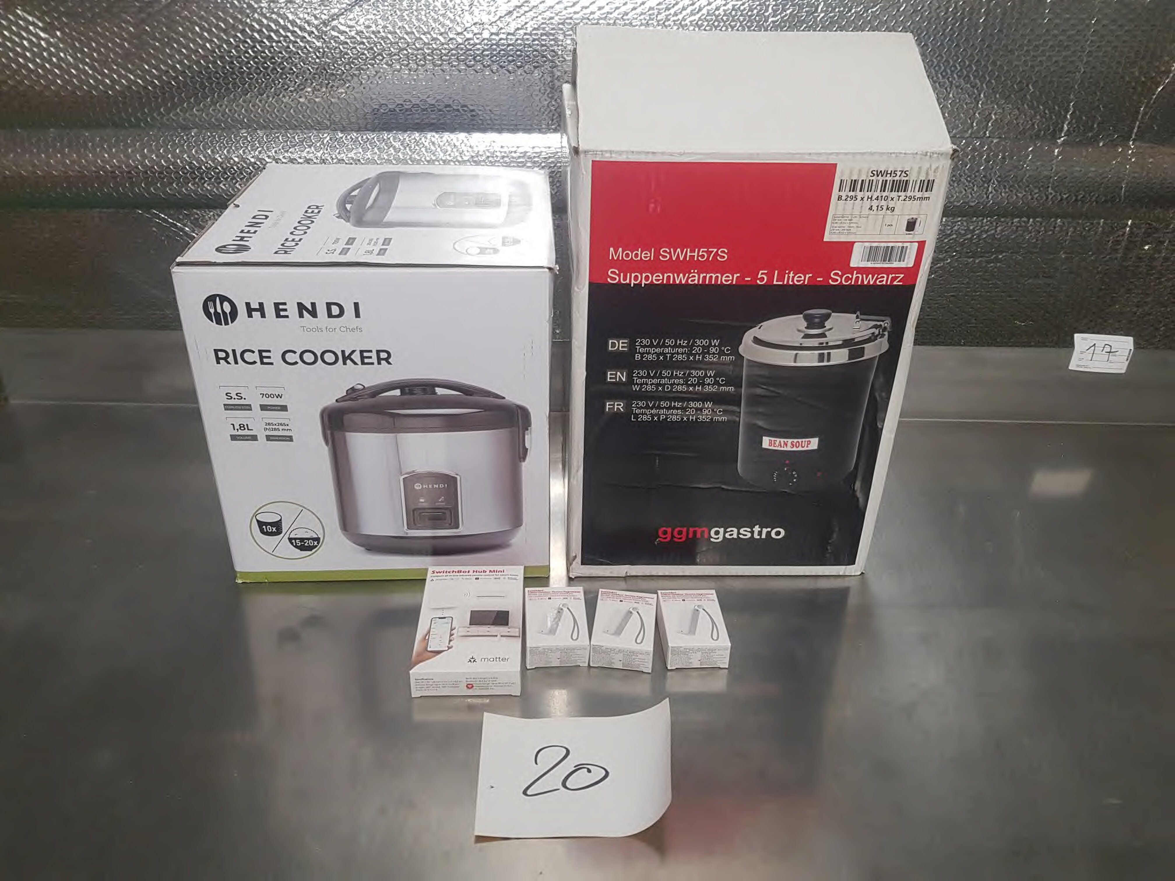 Een Hendi-rijstkoker van 1,8 l/700 W, nauwelijks gebruikt.<br /> Een elektrische soeppan van 5 l/300 W, nooit gebruikt.<br /> Drie koelkastthermometers met wifi, afleesbaar op een smartphone, nauwelijks gebruikt.