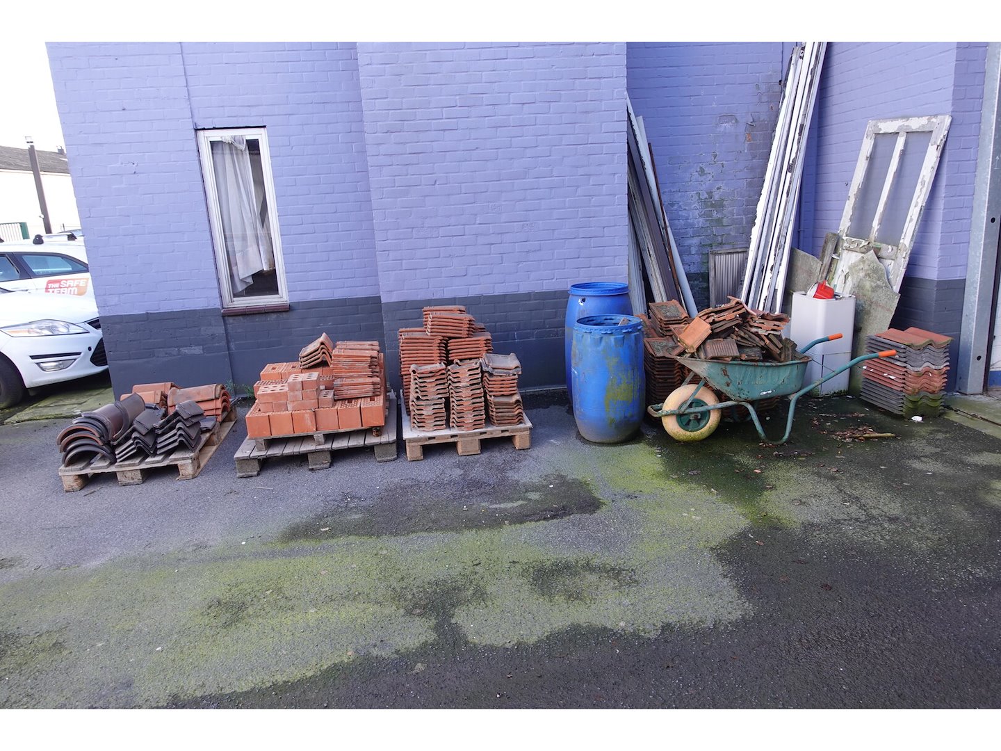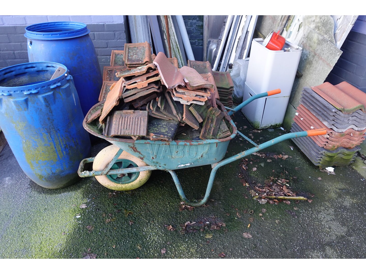 3x pallet & 1x kruiwagen met inhoud, leien op kar ,... ( alles moet mee ! ) <br /> locatie: Buiten