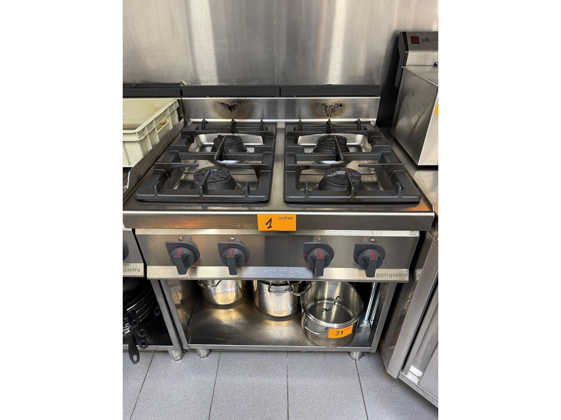 RVS gasfornuis 4-pits met bodemschap <br /> *merk : GGMGASTRO<br /> *model : CHP/GHB871P <br /> *afmeting : 80x70 cm