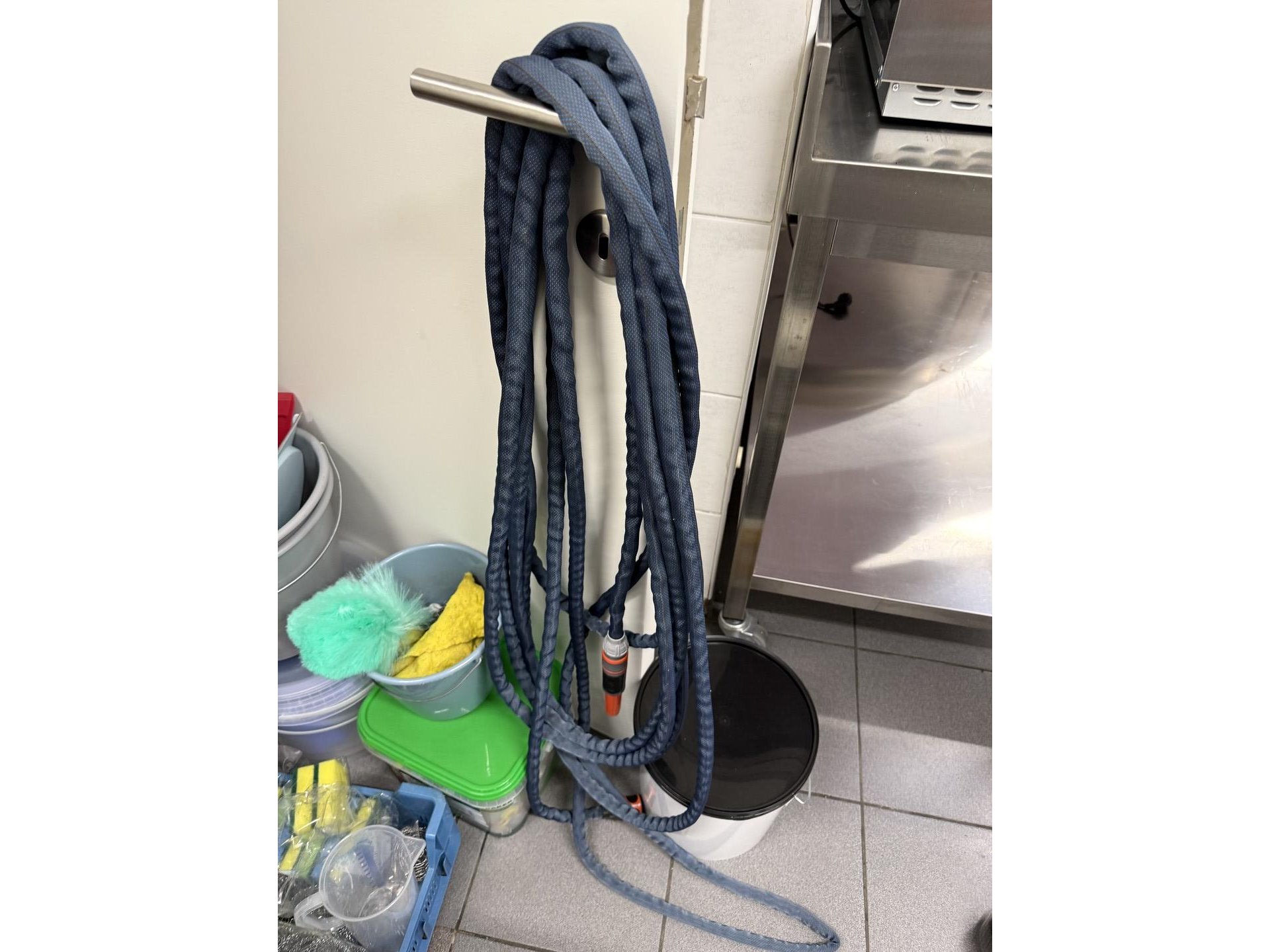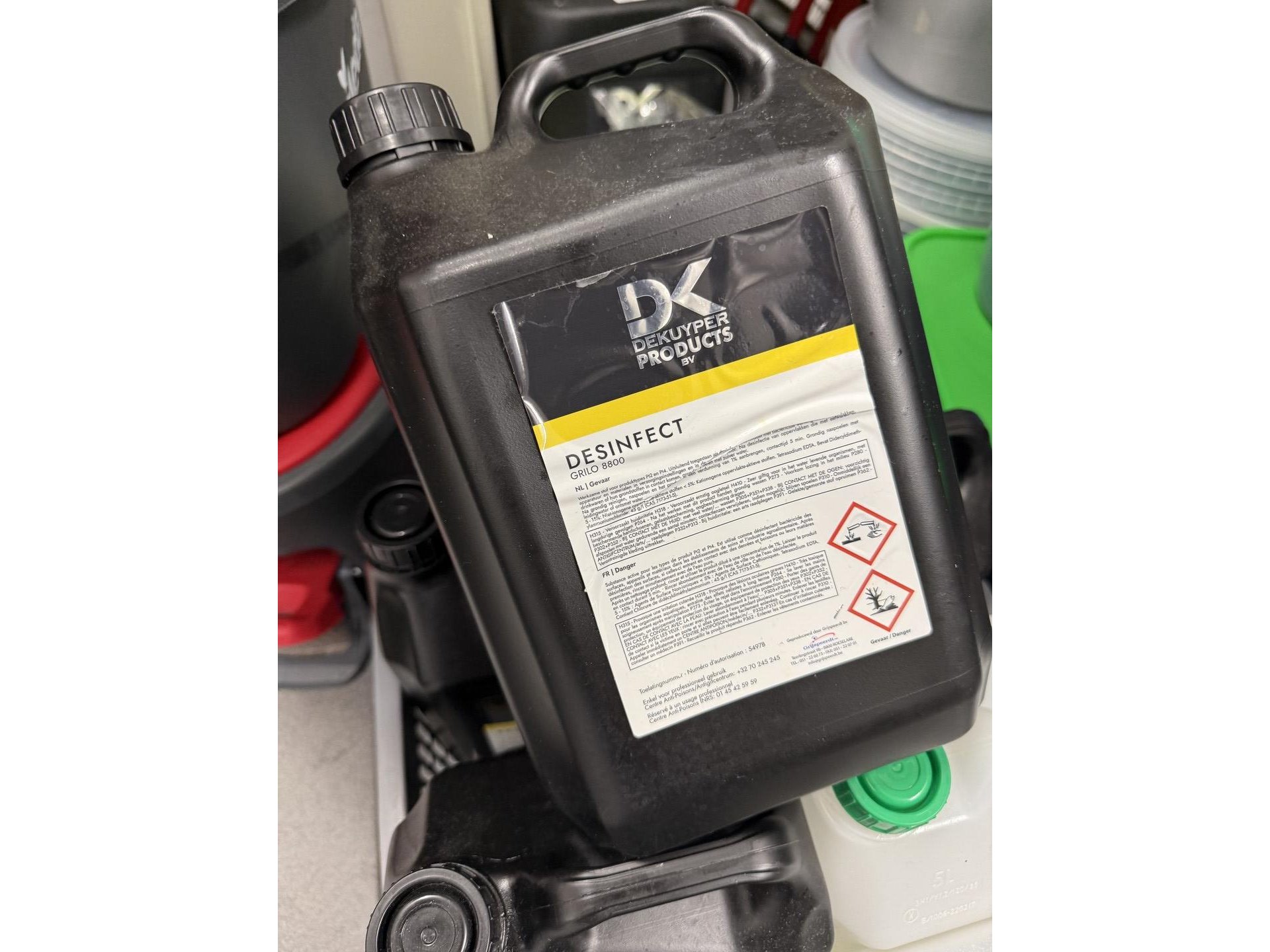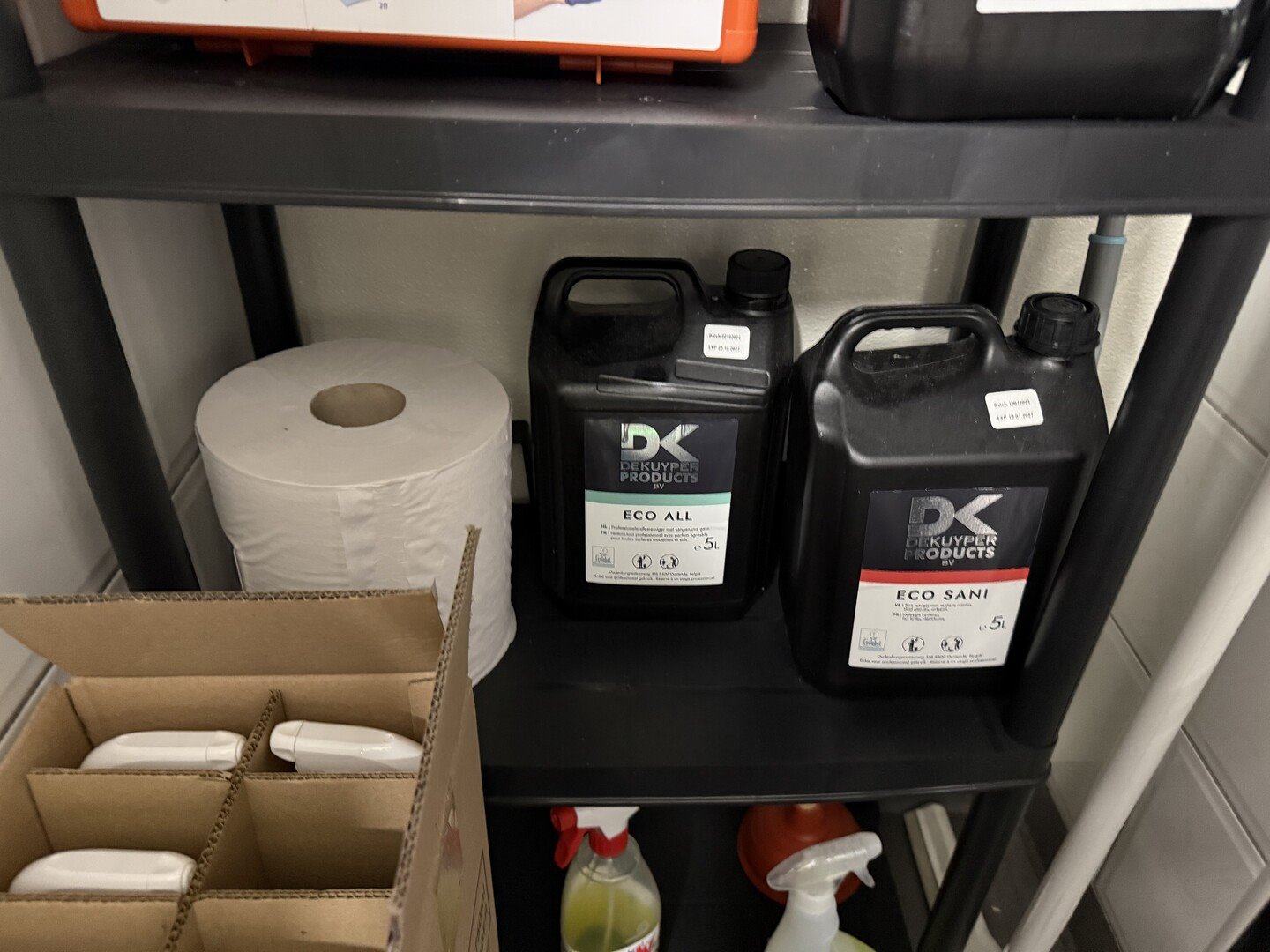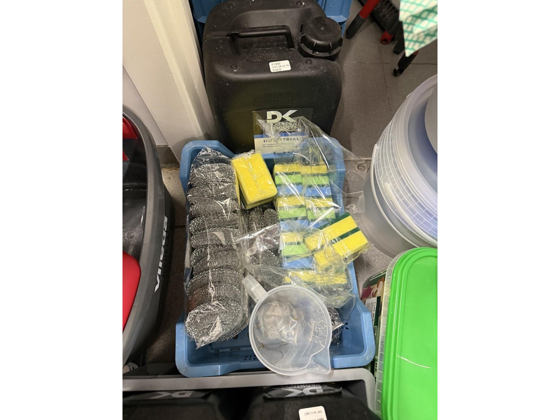 Belangrijk lot diverse materiaal voor reinigen : mooie hoeveelheid producten en materiaal (wo. Onaangebroken!), waterdarm, kuisemmers, borstels, PVC-stapelrek, sponsen, afvalzakken,…