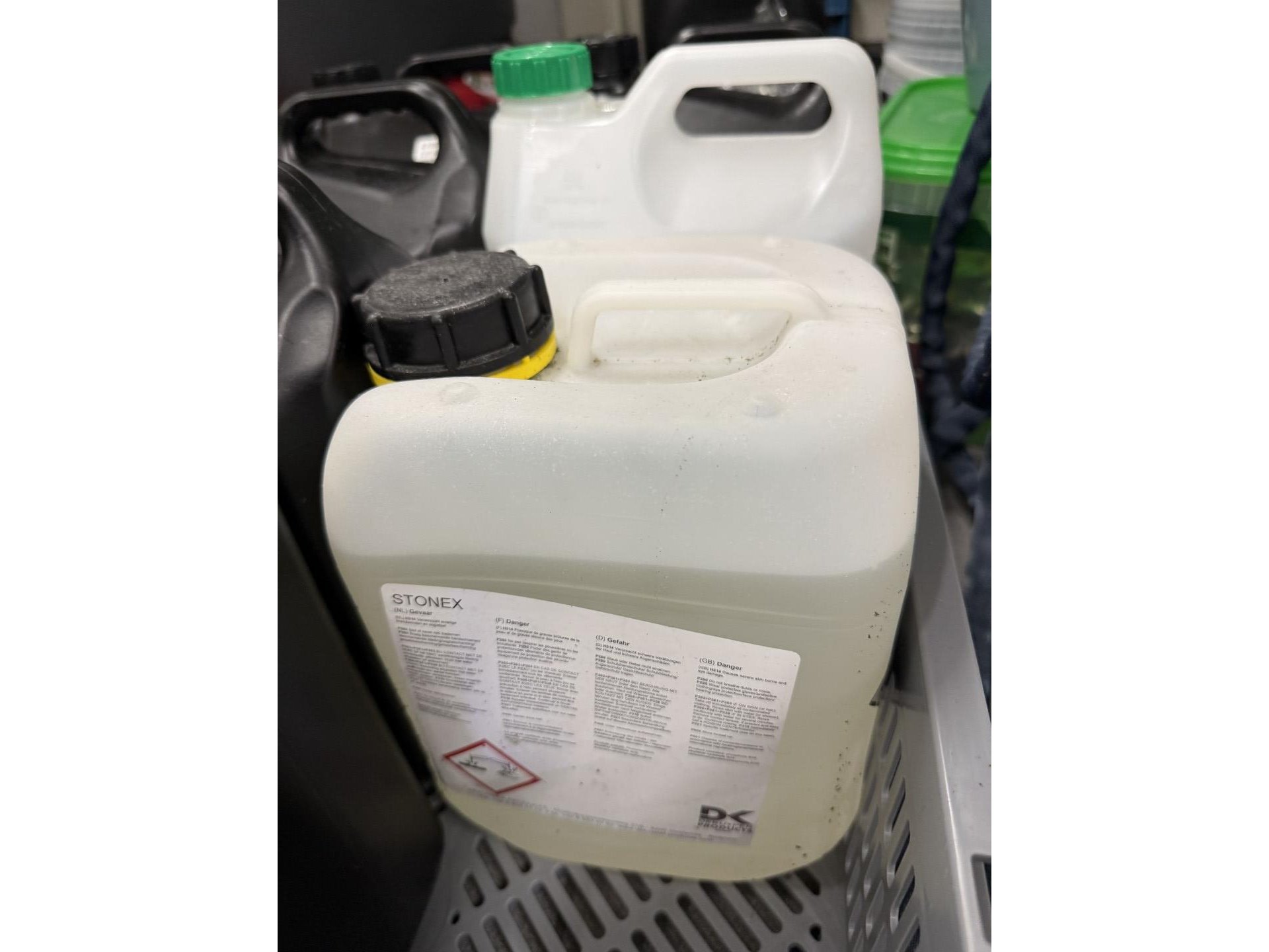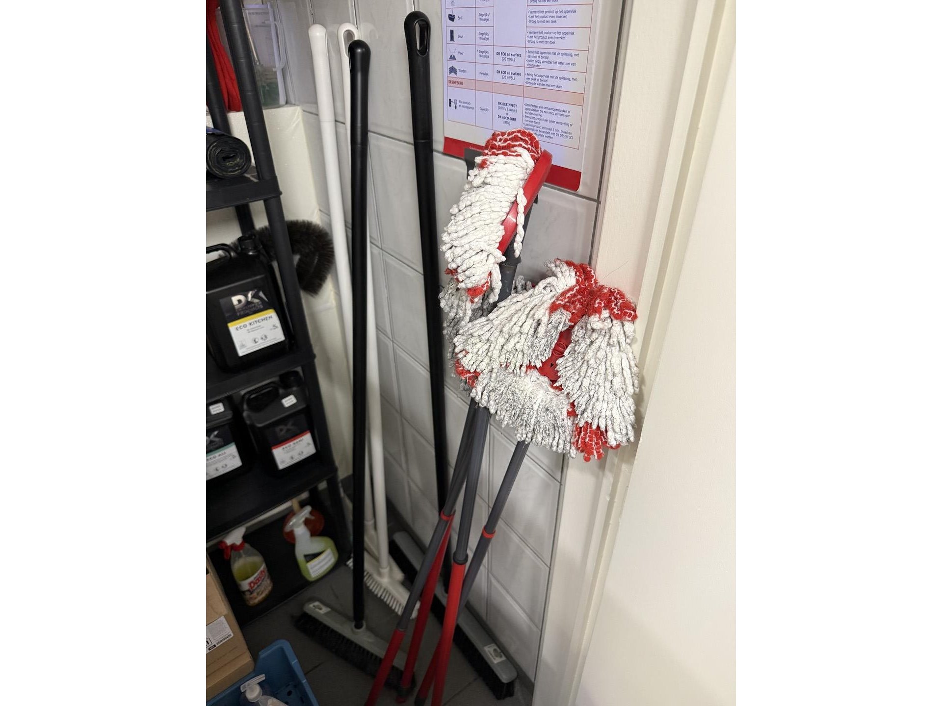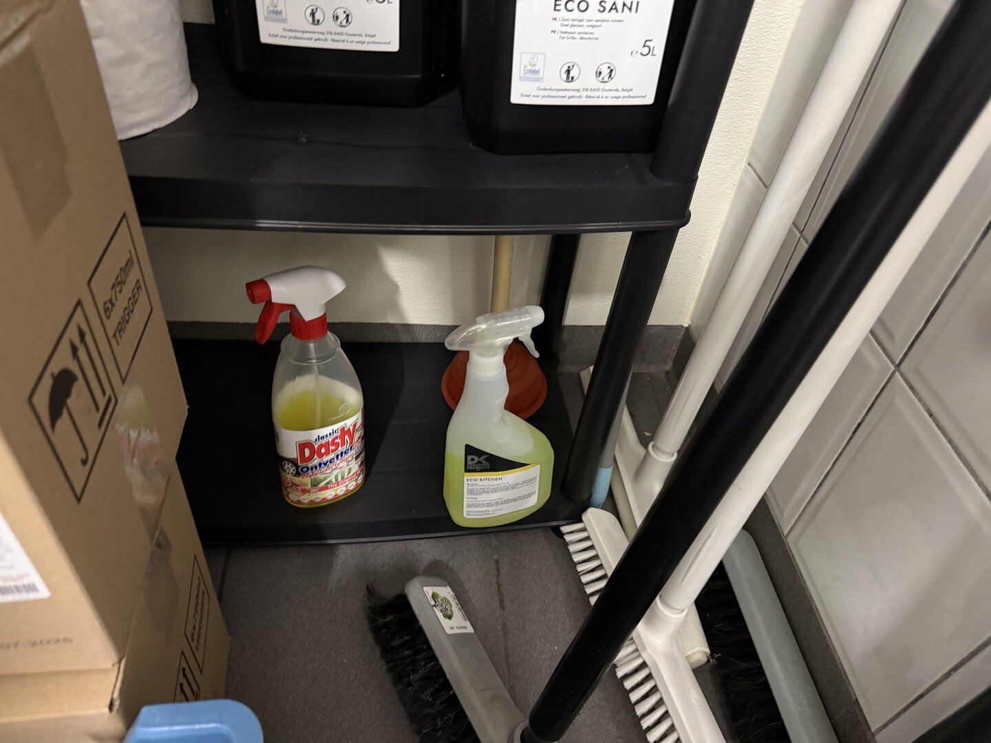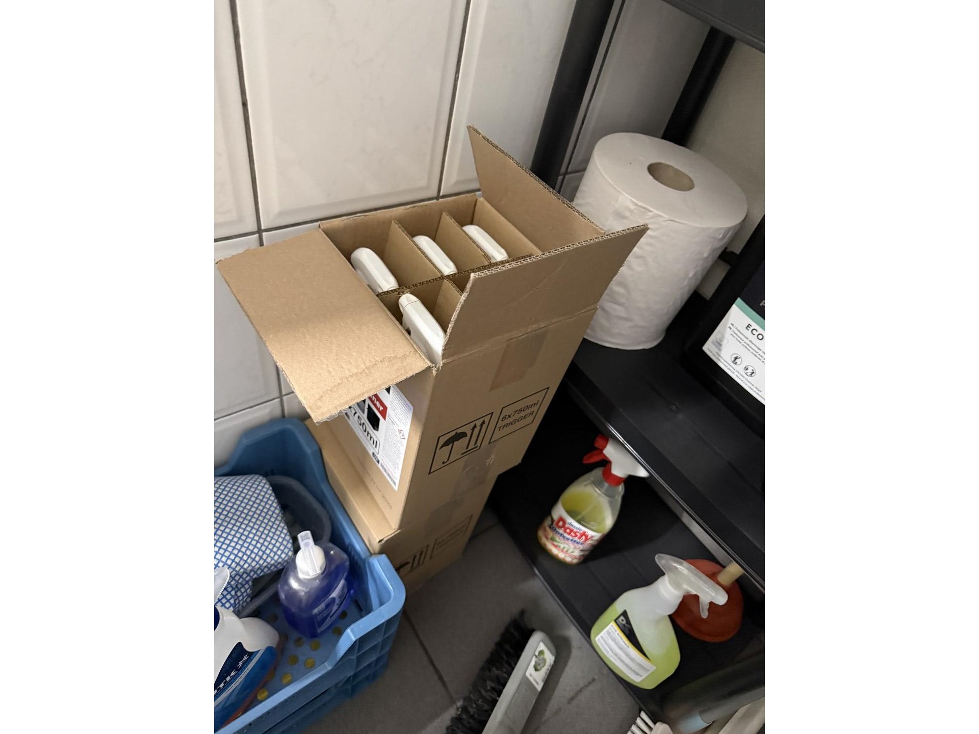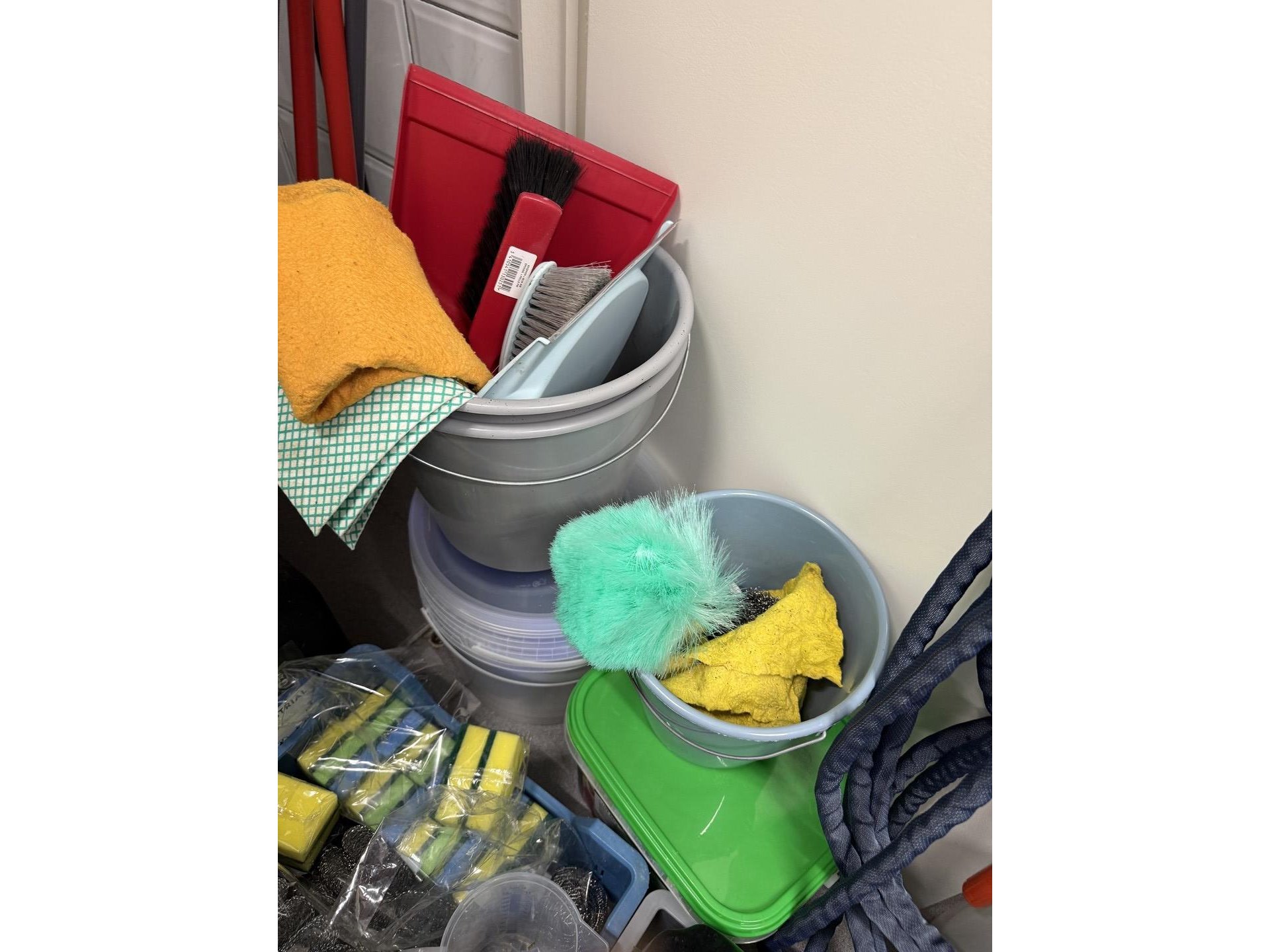 Belangrijk lot diverse materiaal voor reinigen : mooie hoeveelheid producten en materiaal (wo. Onaangebroken!), waterdarm, kuisemmers, borstels, PVC-stapelrek, sponsen, afvalzakken,…