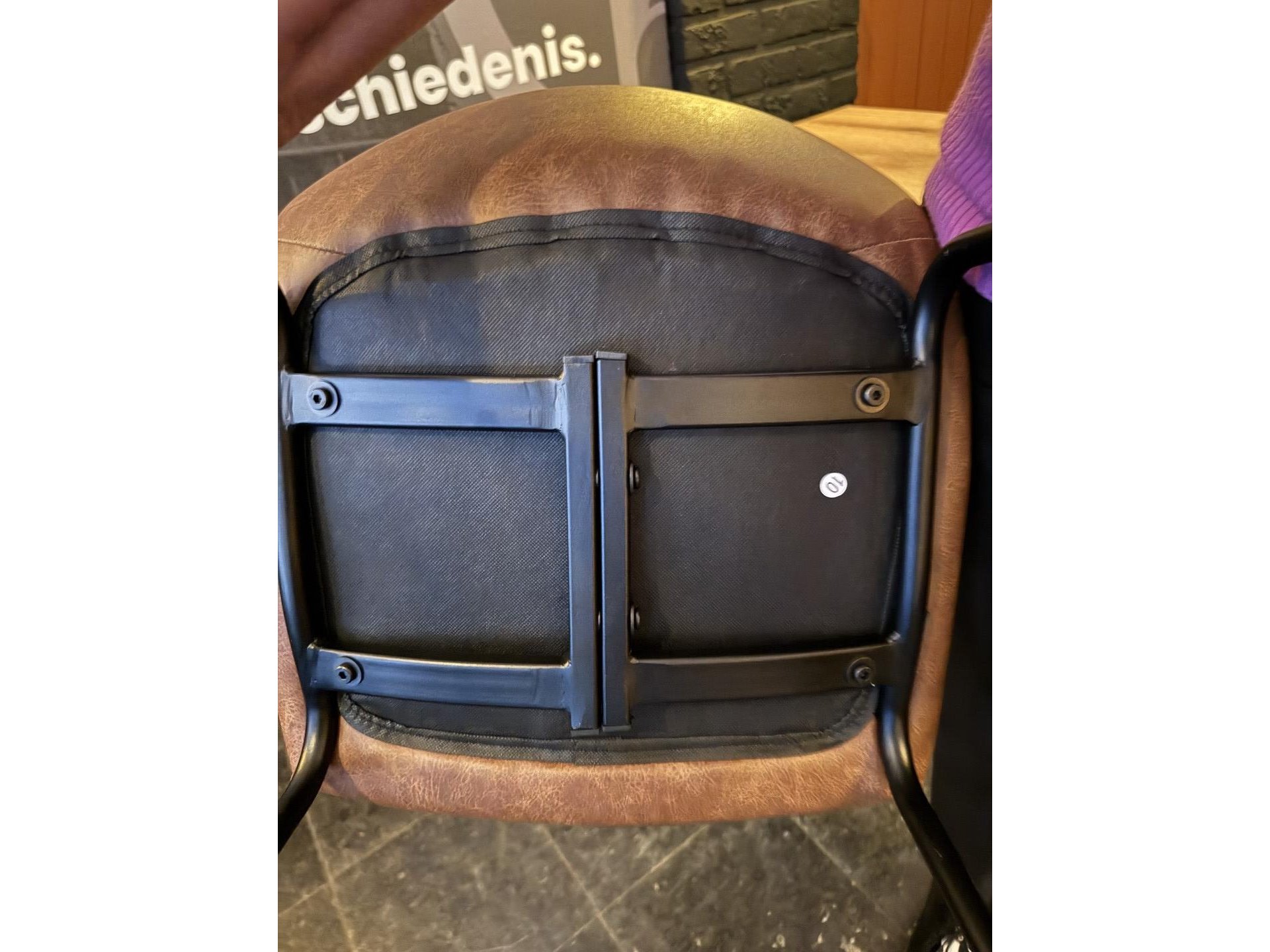5 hoge stoelen met zitting in okerbruin lederlook <br /> + 1 hoge ronde tafel op zwartmetalen voet - diameter 82 cm